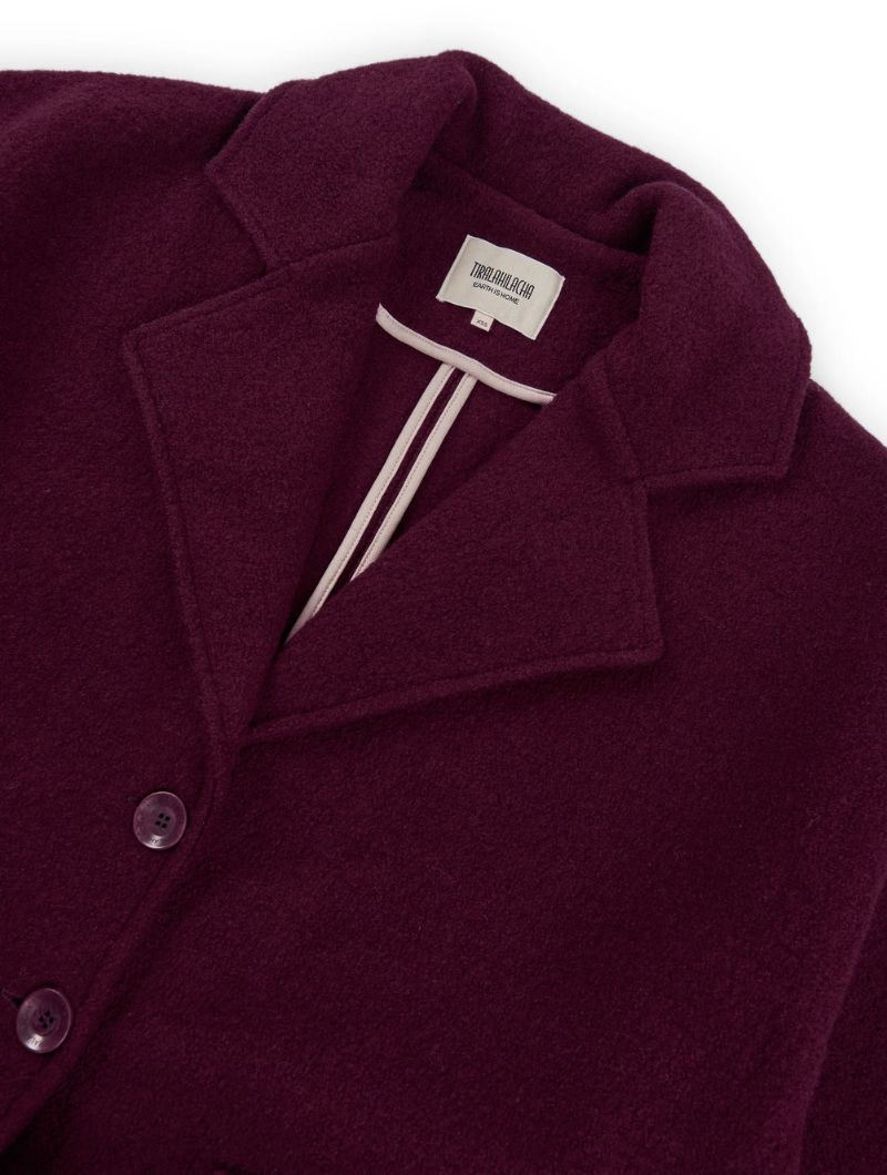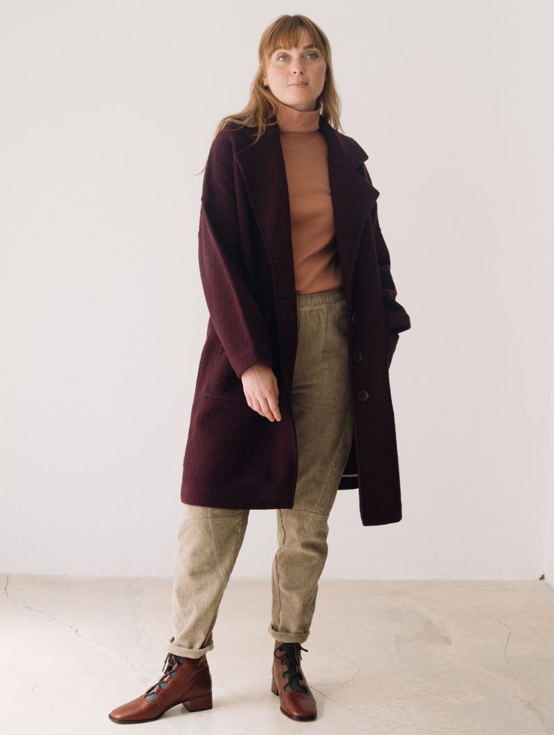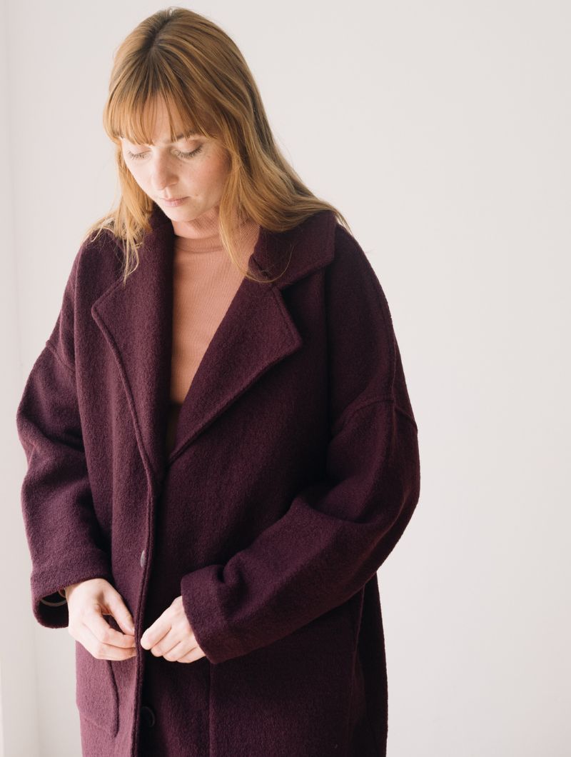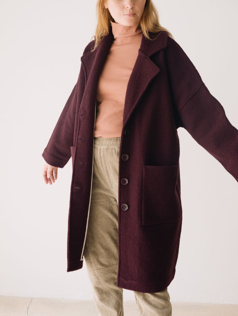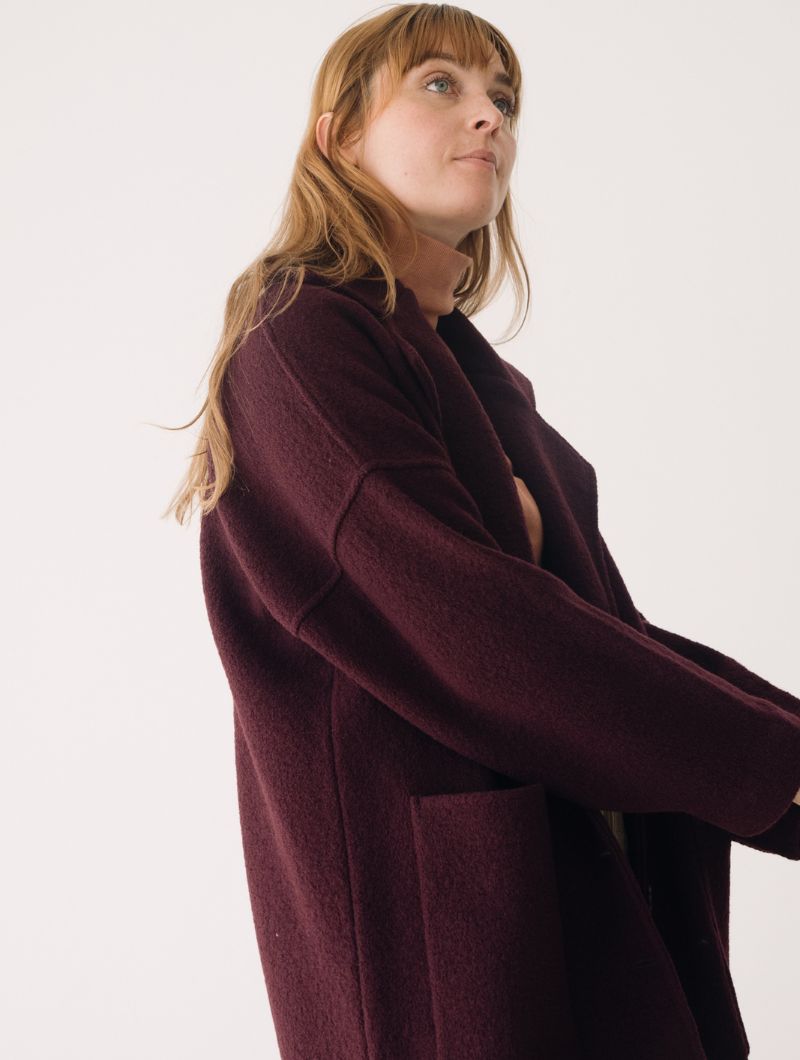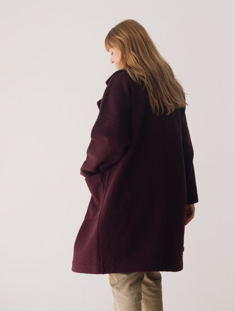 Abrigo largo púrpura en lana merino con corte oversize, cuello solapa, manga caída y bolsillos de plastón espaciosos. Con botones de corozo natural biodegradables.