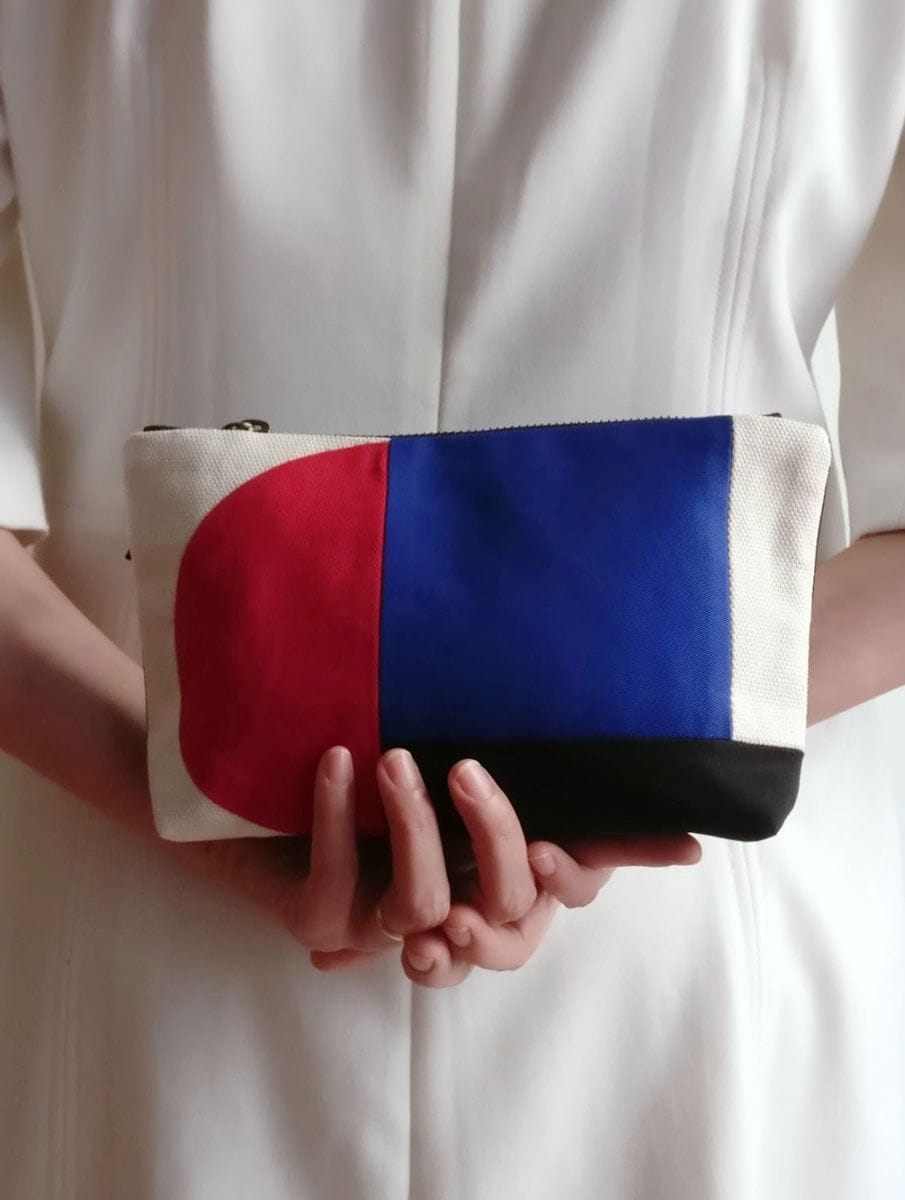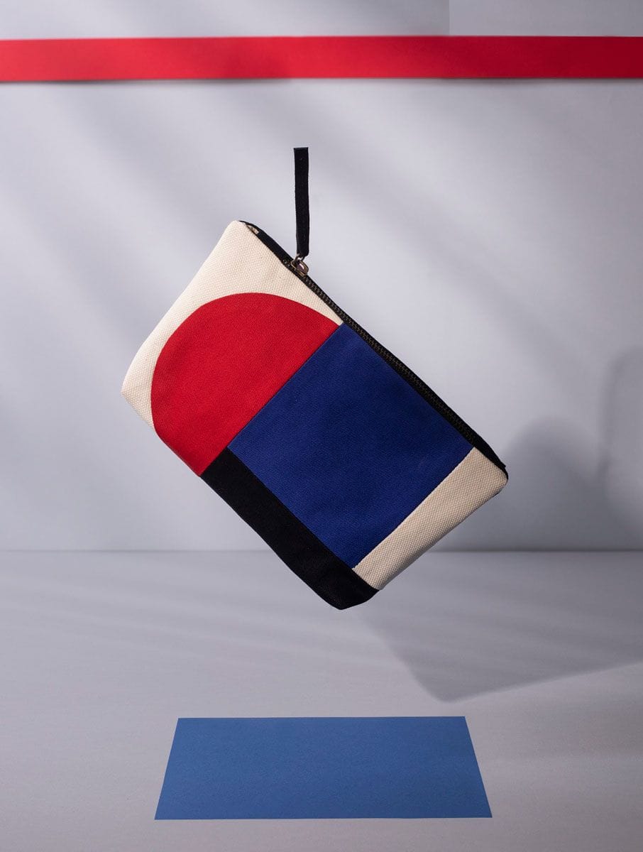 Este precioso bolso de mano es muy práctico y elegante. Su diseño está inspirado en la Escuela Bauhaus y la obra de Piet Mondrian, grandes exponentes del arte y el diseño contemporáneos.