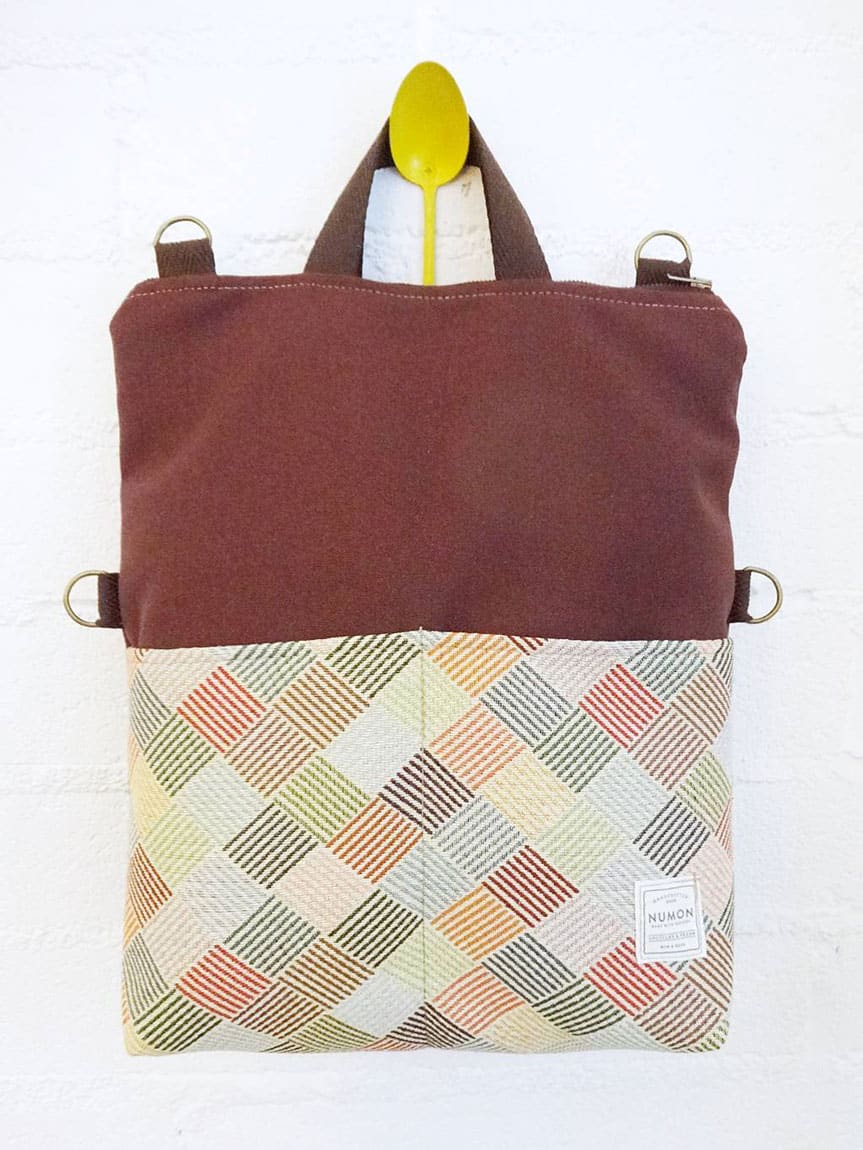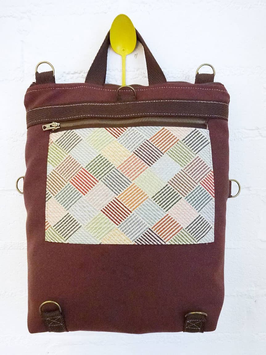 Bolso-mochila burdeos de tapicería reciclada con precioso estampado de cuadros de colores.