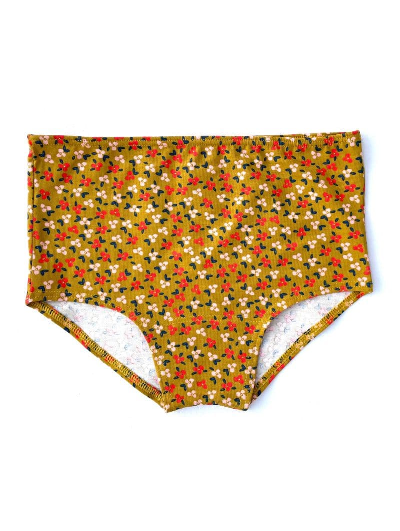 La cintura alta y la fina banda elástica diseñada alrededor de las piernas aseguran un ajuste cómodo y seguro, permitiendo que la prenda se mantenga en su lugar sin apretar. El vibrante estampado floral sobre el cautivador fondo dorado no solo es alegre y moderno, sino que también añade un toque de diversión a tu colección de lencería.