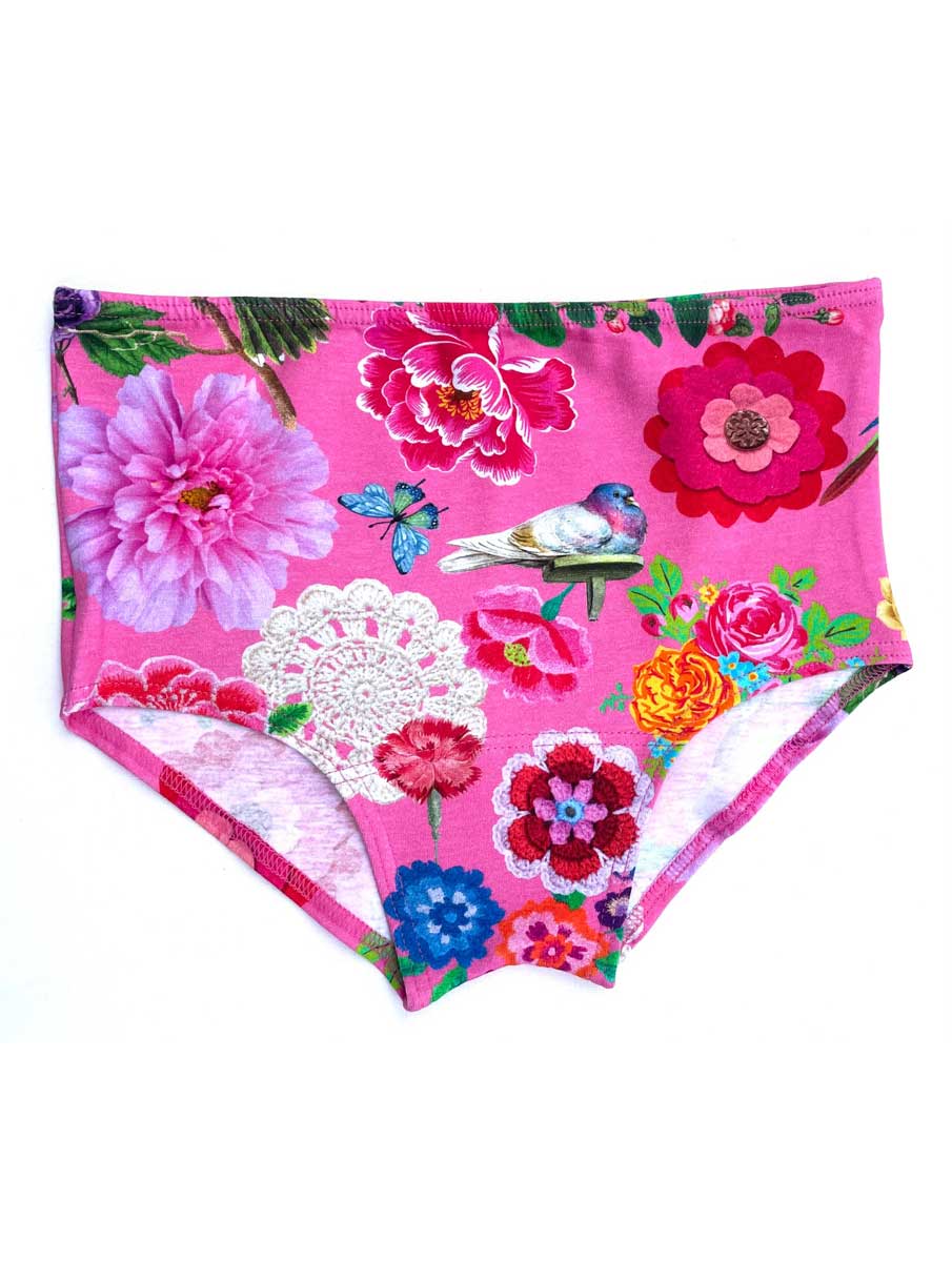 Su original estampado de flores y pájaros sobre un fondo rosa convierten a estas bragas cintura alta ecológicas en una prenda única y divertida de llevar.