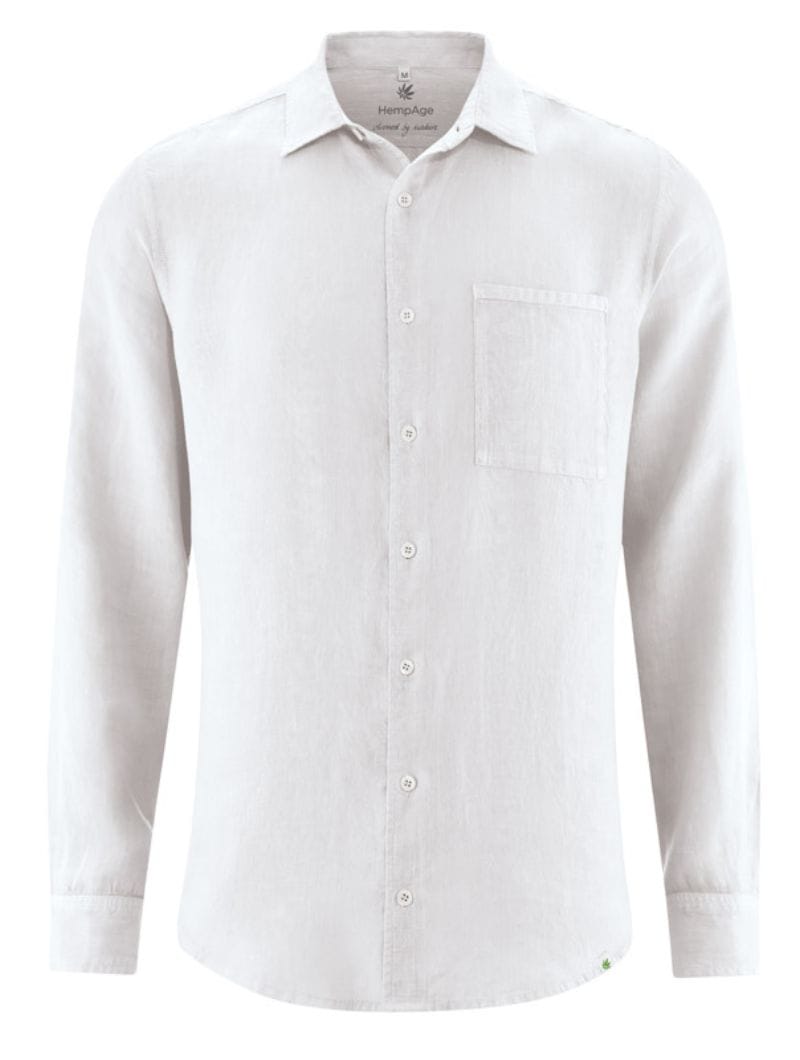 Camisa blanca de cuello italiano con bolsillo en el pecho. Patrón de corte normal.