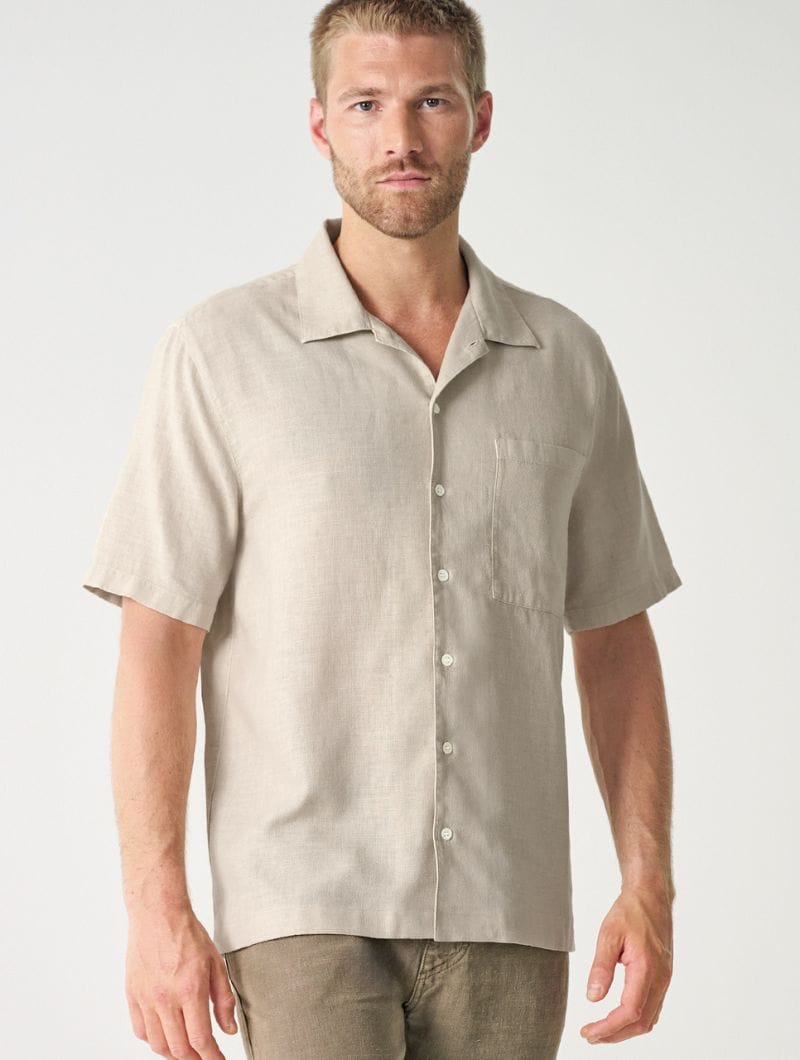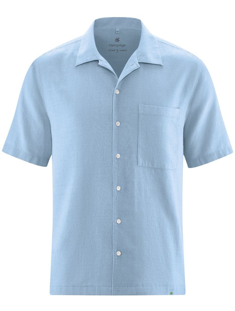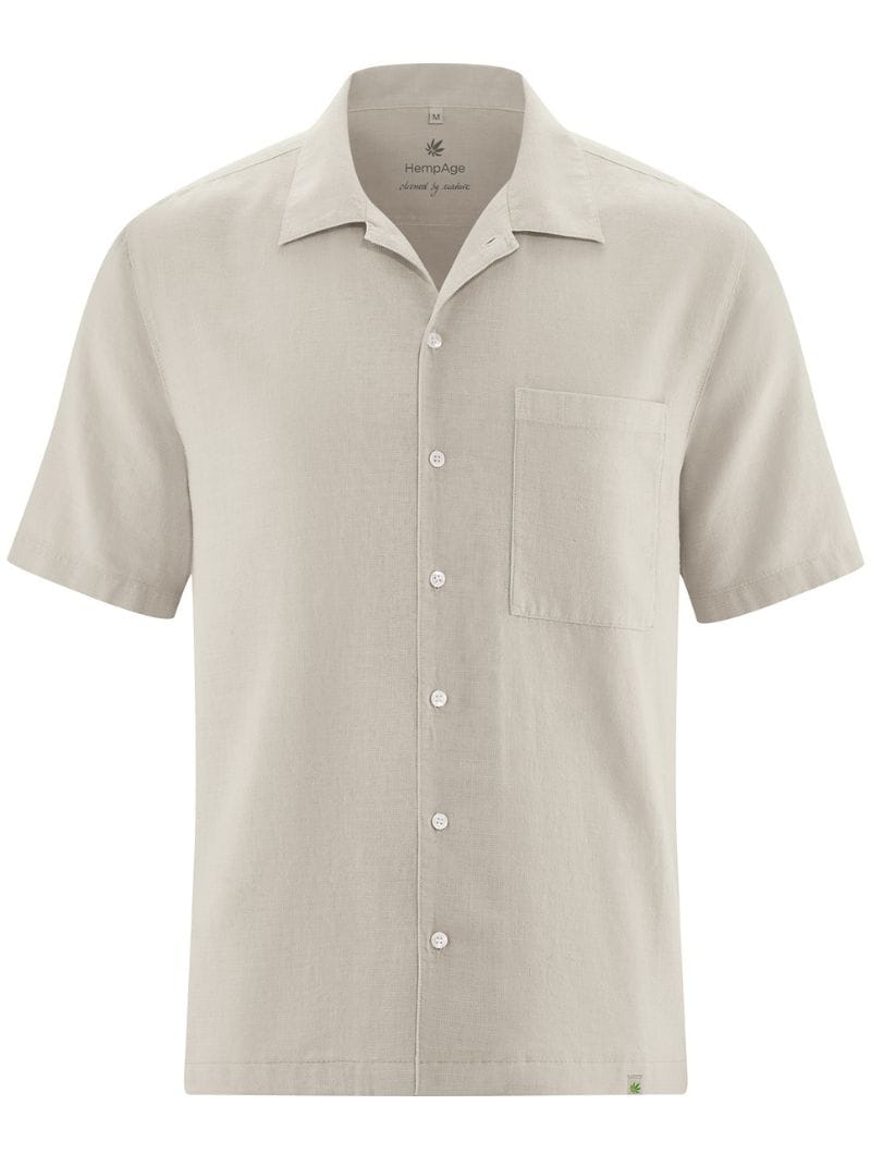 Camisa de manga corta y cuello italiano tejida en una mezcla de 55% cáñamo y 45% algodón orgánico.