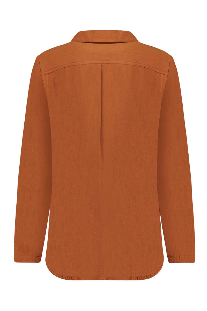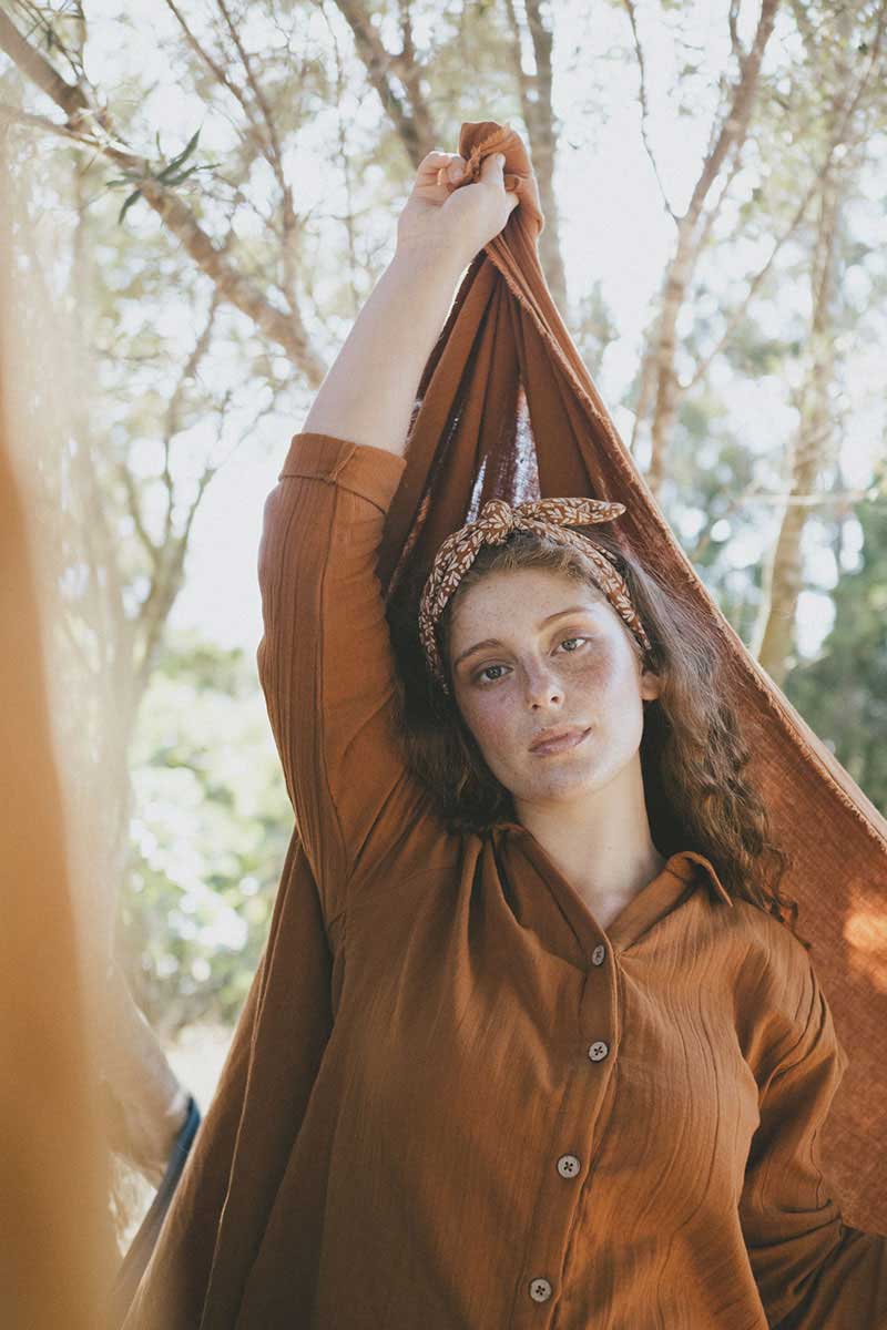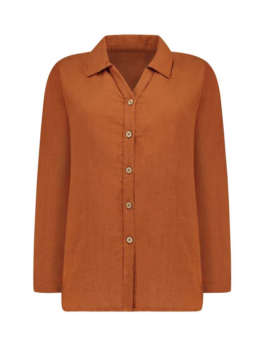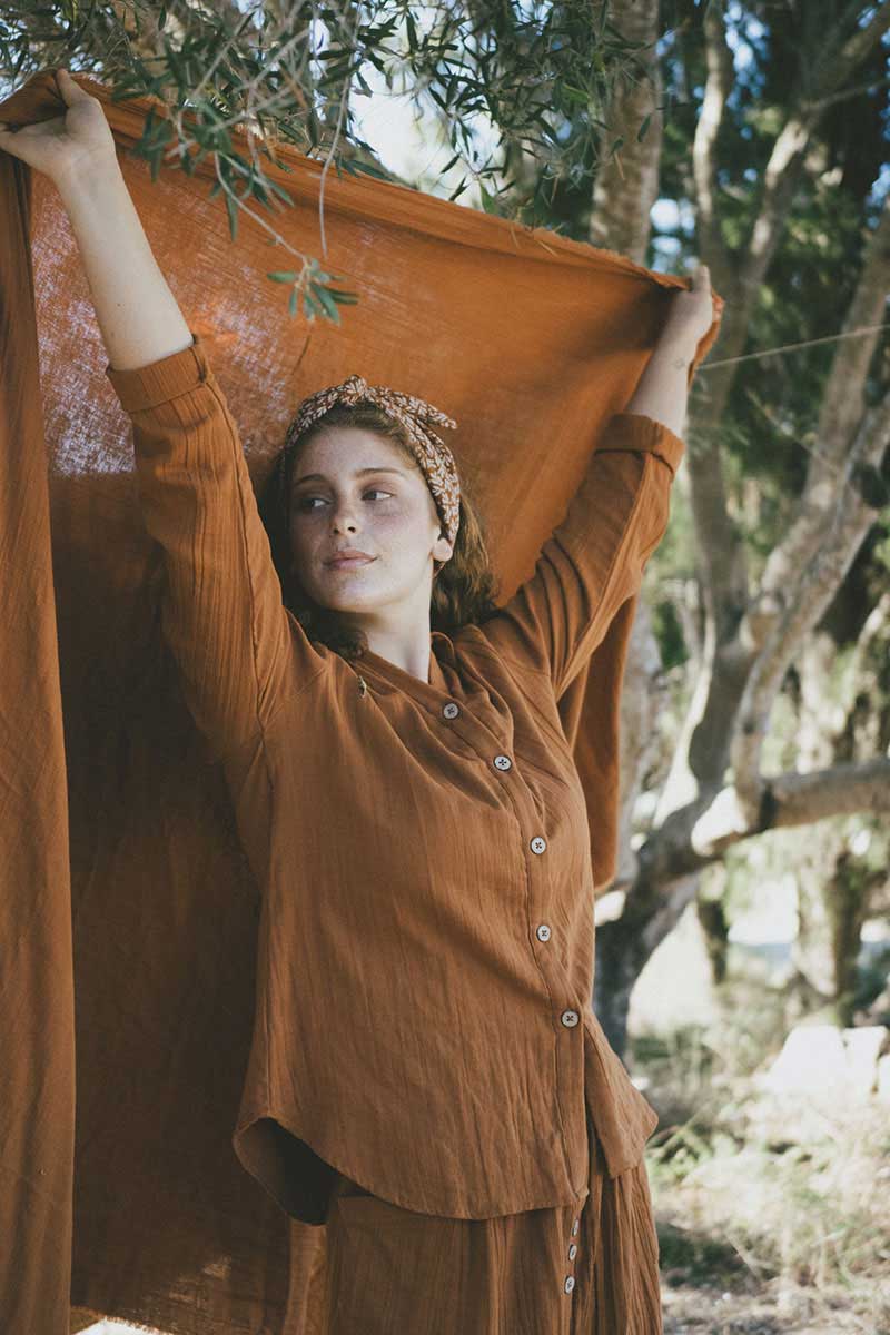 La camisa mujer color teja está confeccionada en tejido de muselina 100% algodón orgánico con certificado GOTS y tintes ecológicos.