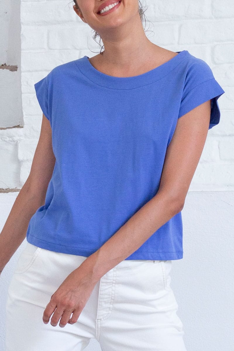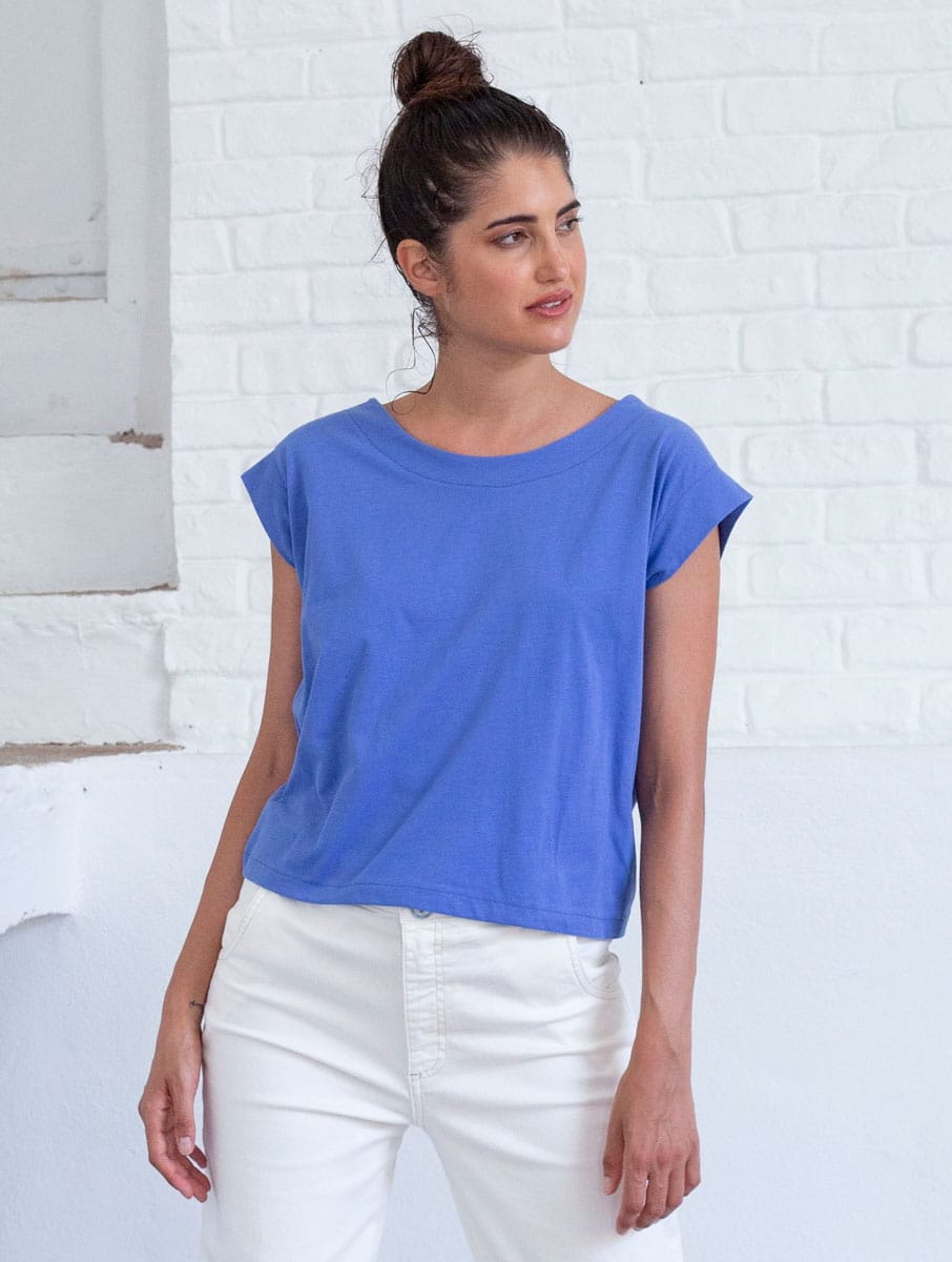 Esta camiseta ecológica para mujer cuenta con cuello barco y dobladillo cruzado a la espalda. Su precioso color azul amparo combina genial con tonos neutros y hará resaltar tu bronceado.