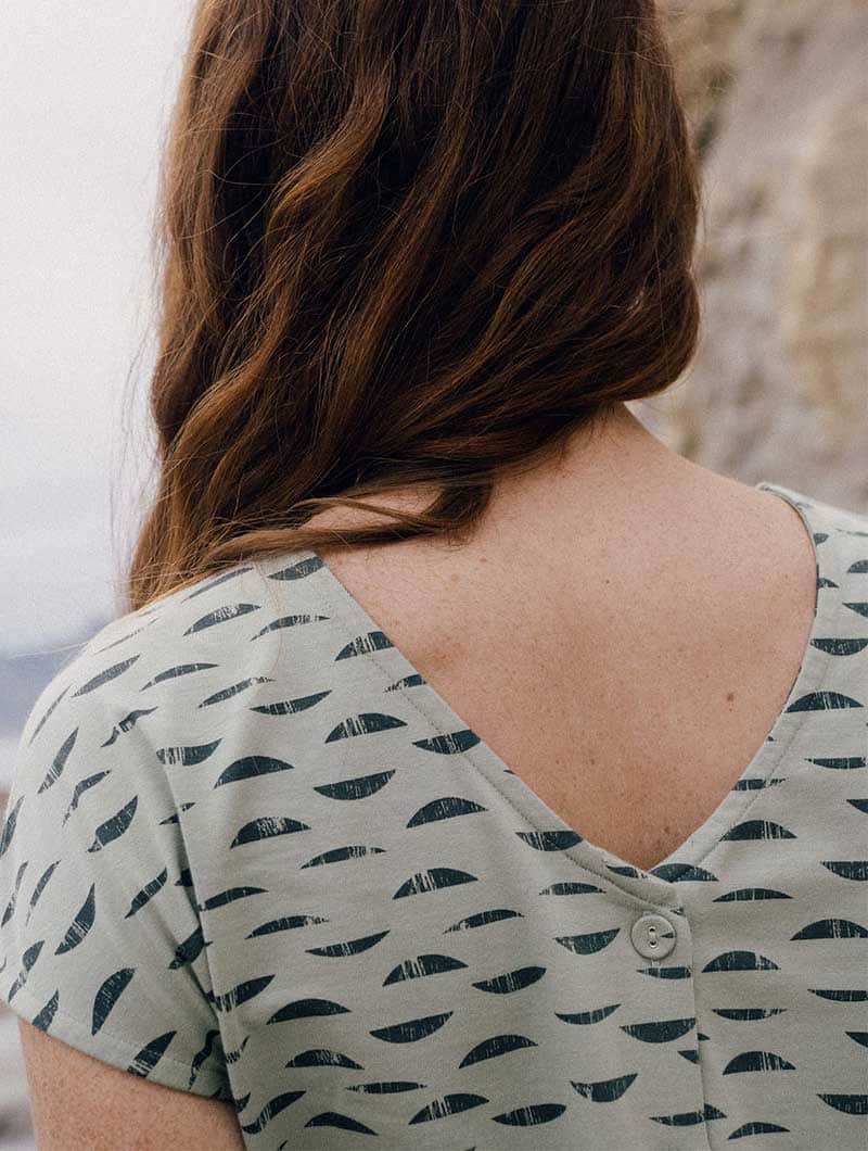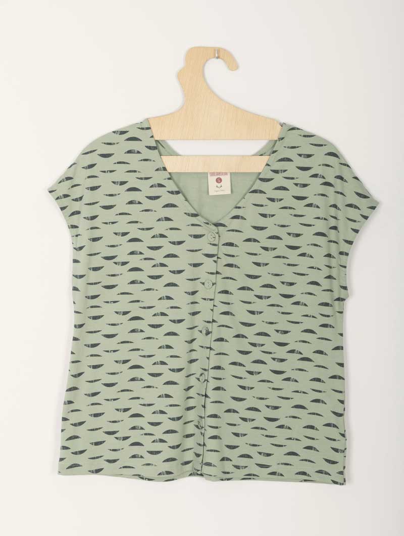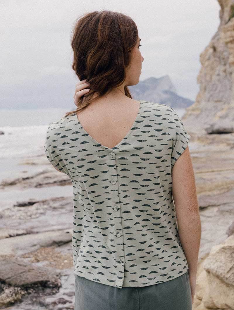 Camiseta con botones ecológica color verde con estampado de reflejos.
