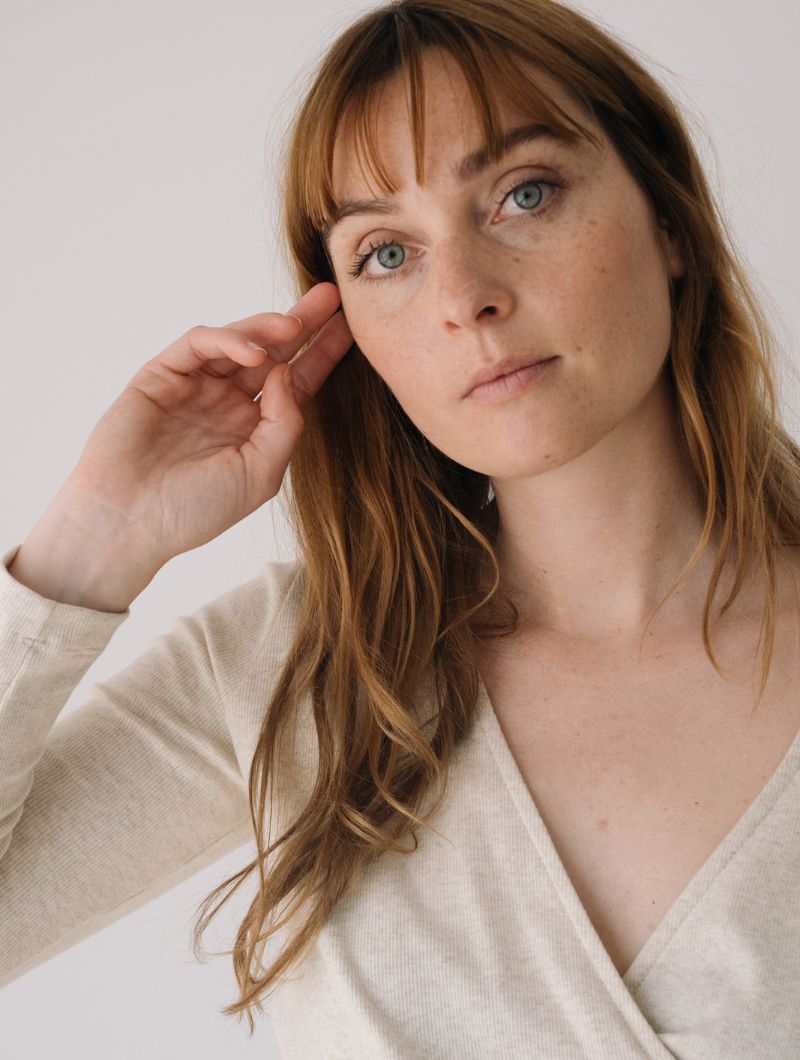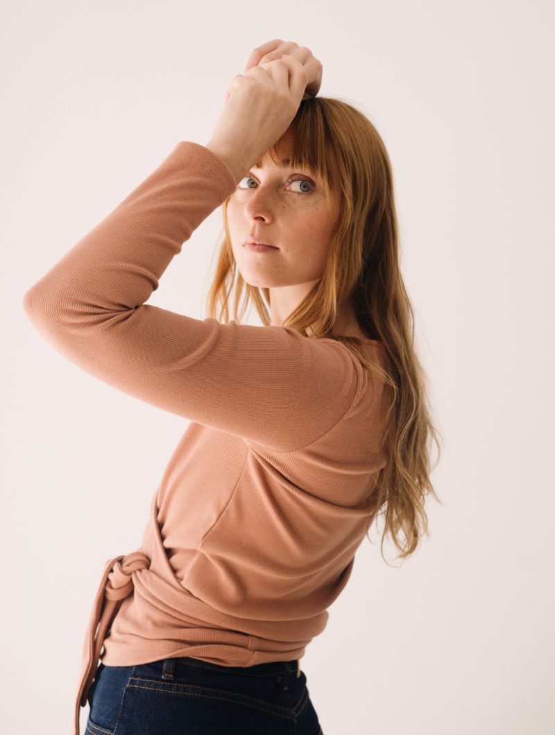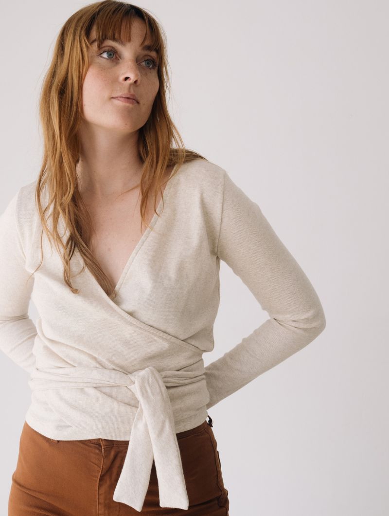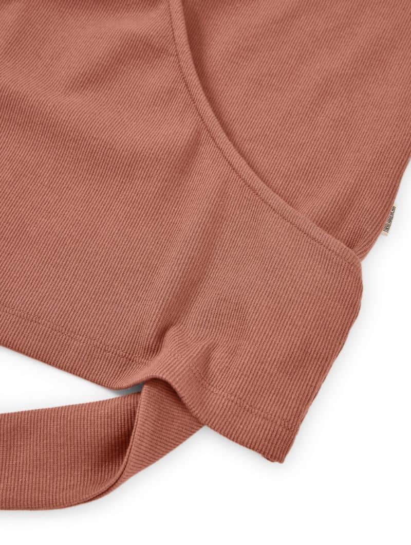 Camiseta cruzada de canalé con diseño envolvente, escote en pico y lazo a la cintura que permite ajustarla cómodamente y estilizar la silueta.