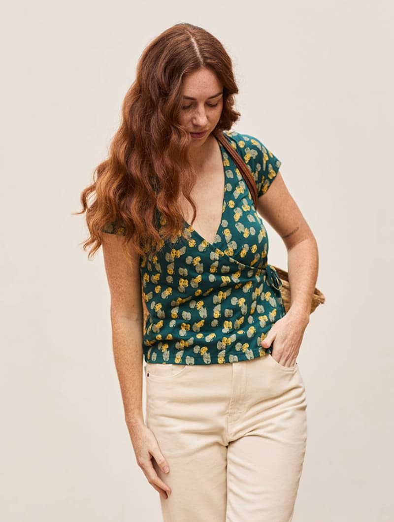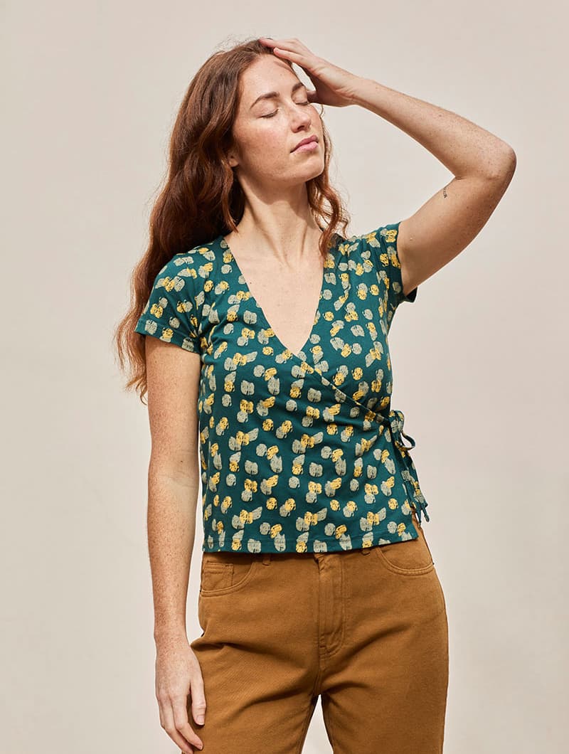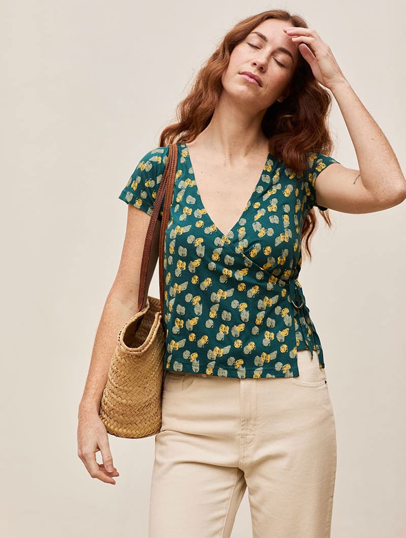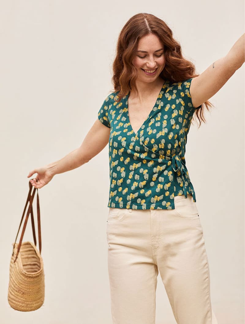 Es una camiseta con un estampado de huellas que le da un aire divertido y desenfadado, y con un corte cruzado que se ajusta a tu silueta. Además, puedes regularla con un lazo en el lateral y una lazada en el interior.