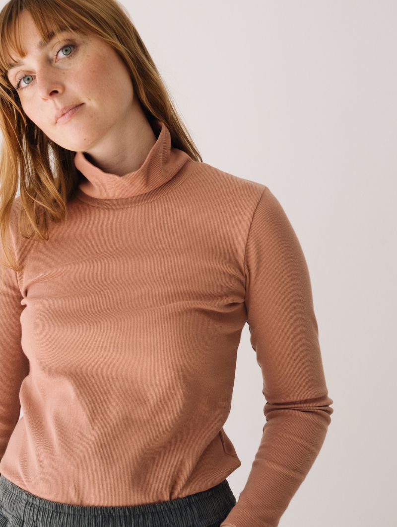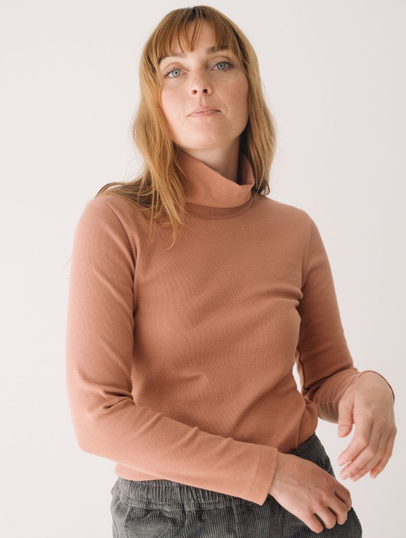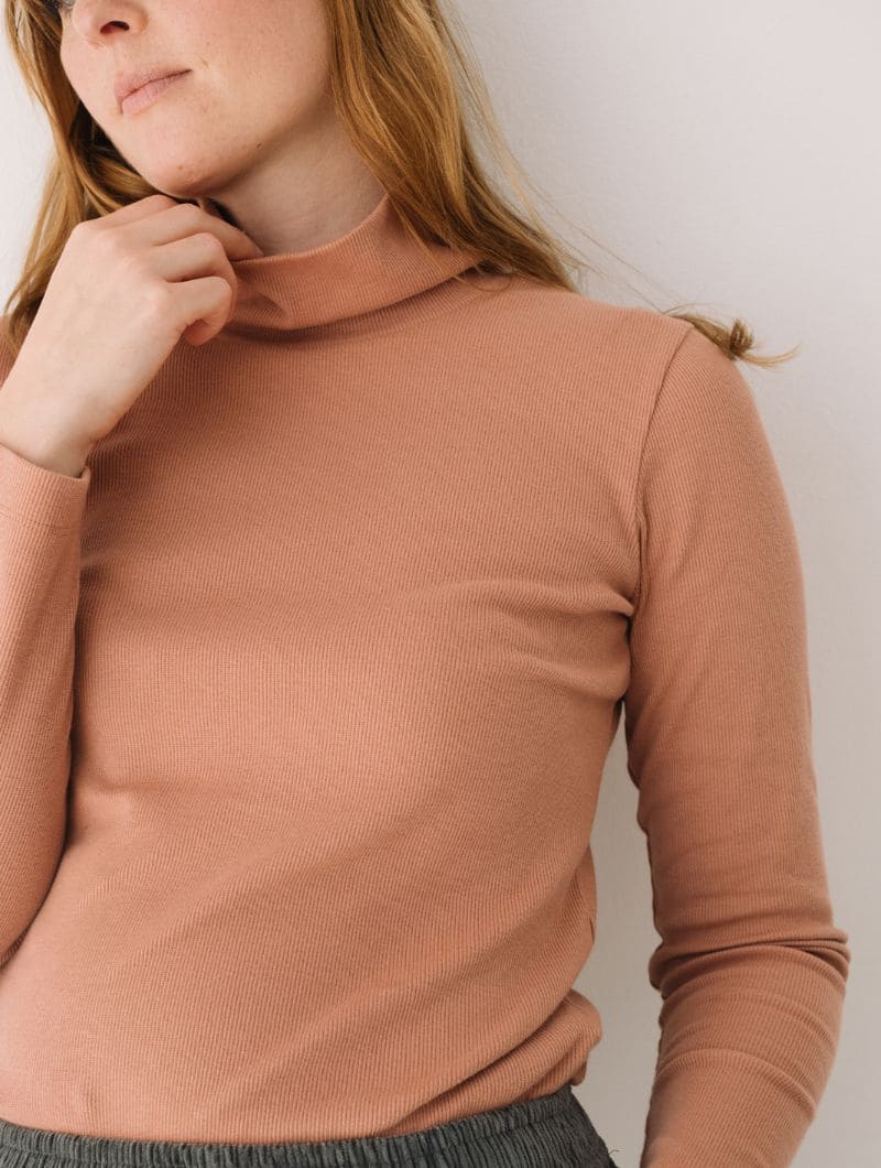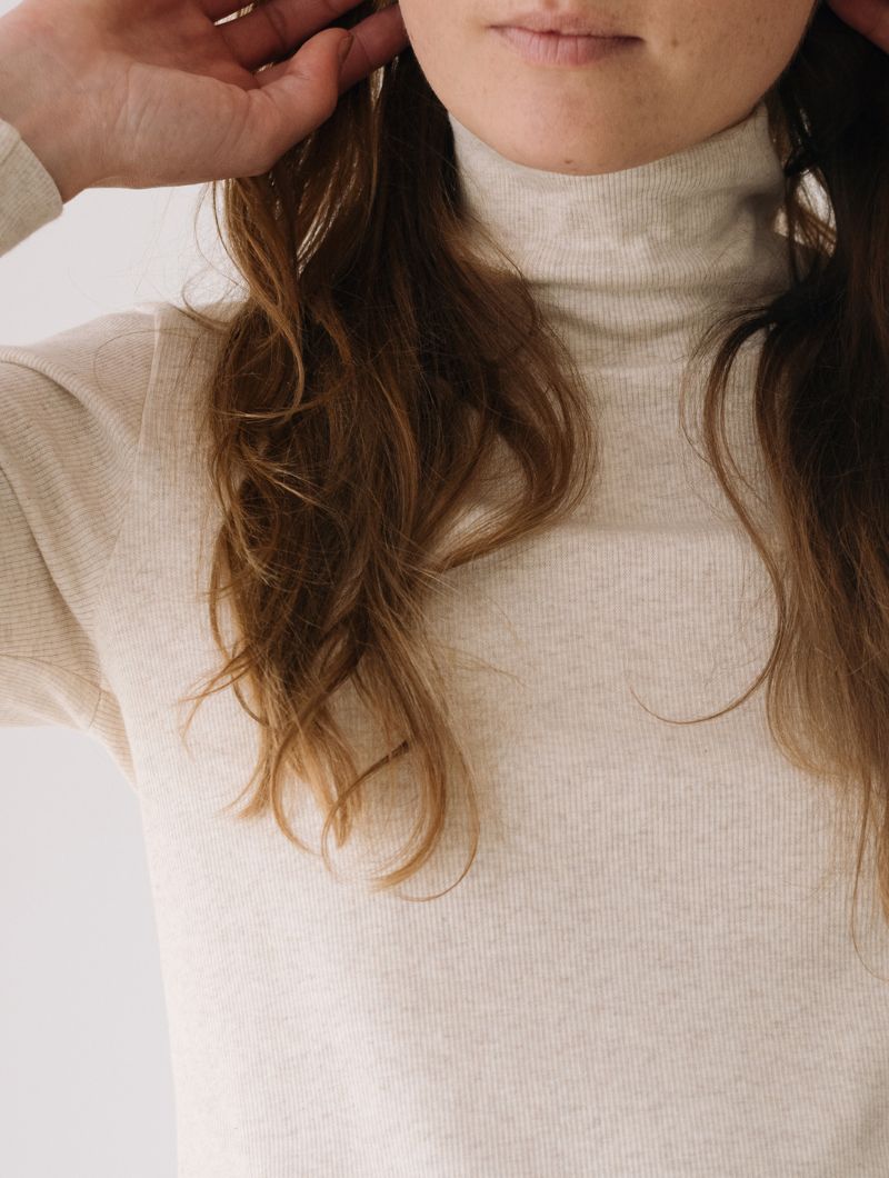 Camiseta de cuello alto de manga larga con corte recto y canalé elástico que aporta textura y comodidad. El cuello, amplio y suave, se ajusta sin oprimir, mientras que la silueta recta favorece distintos tipos de cuerpo.