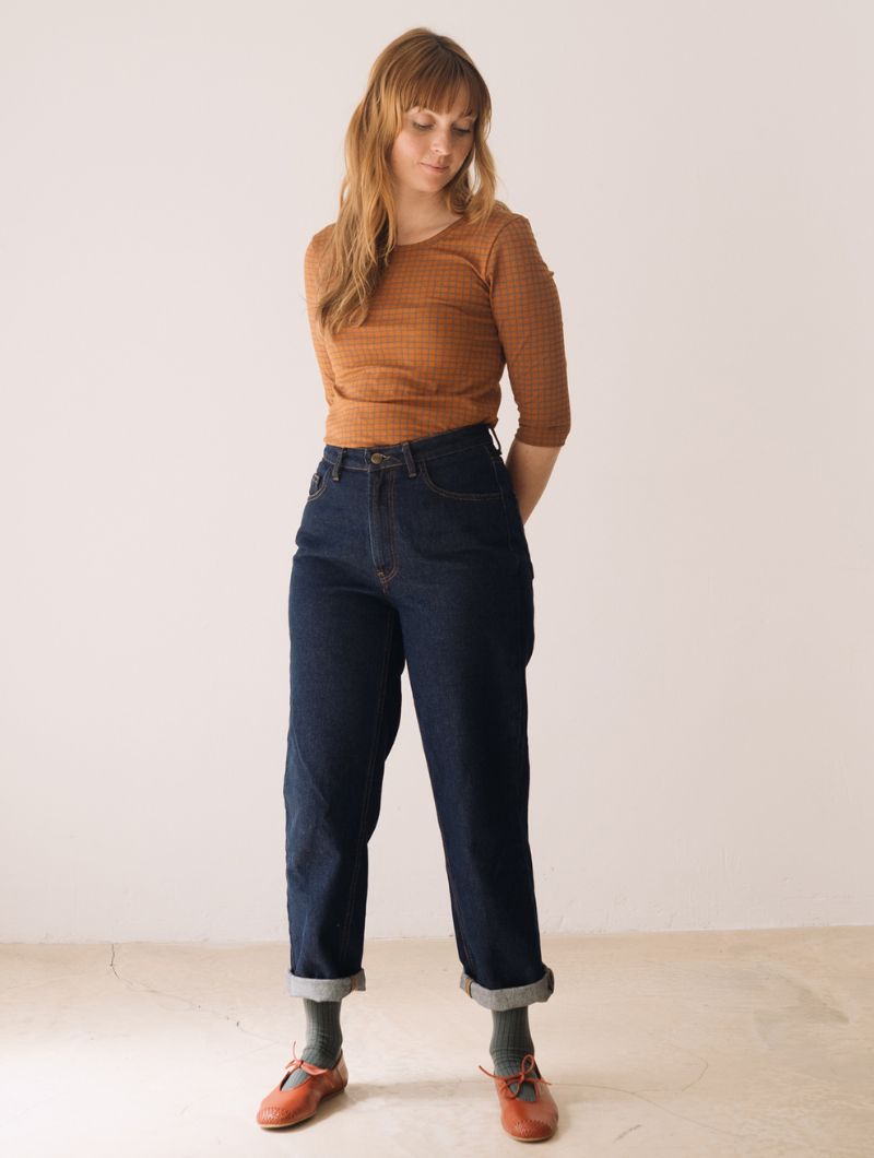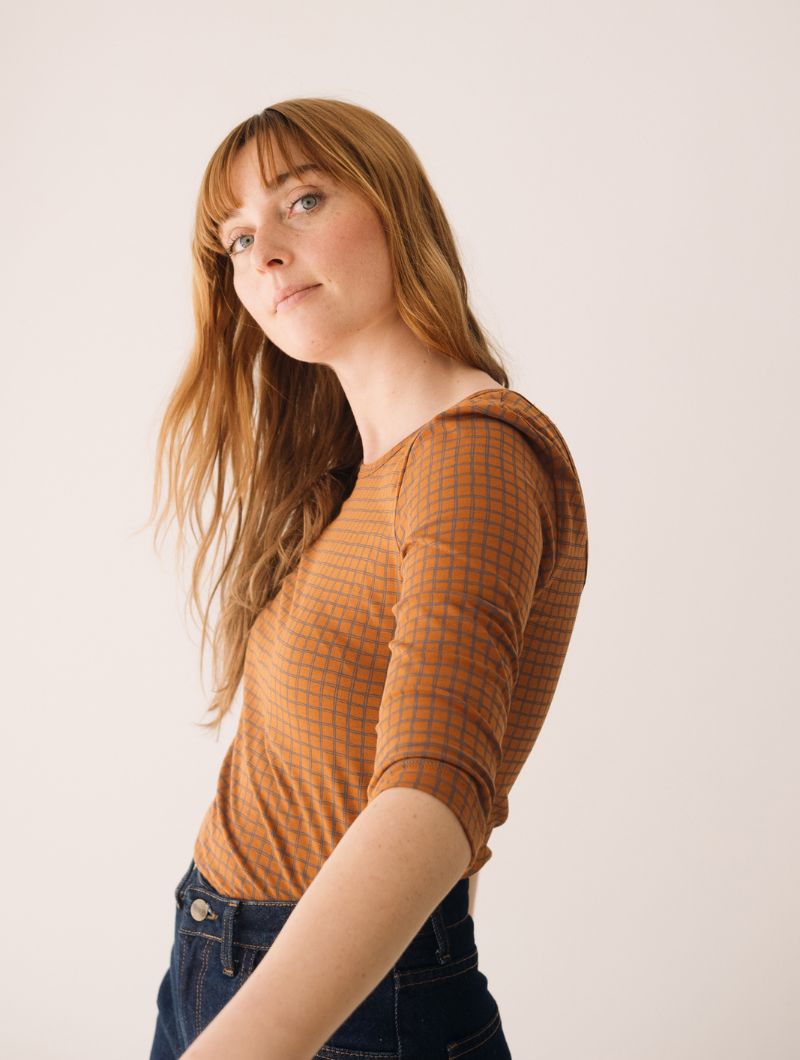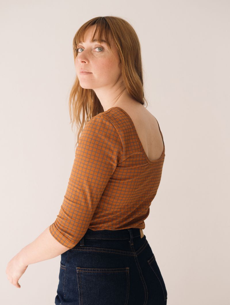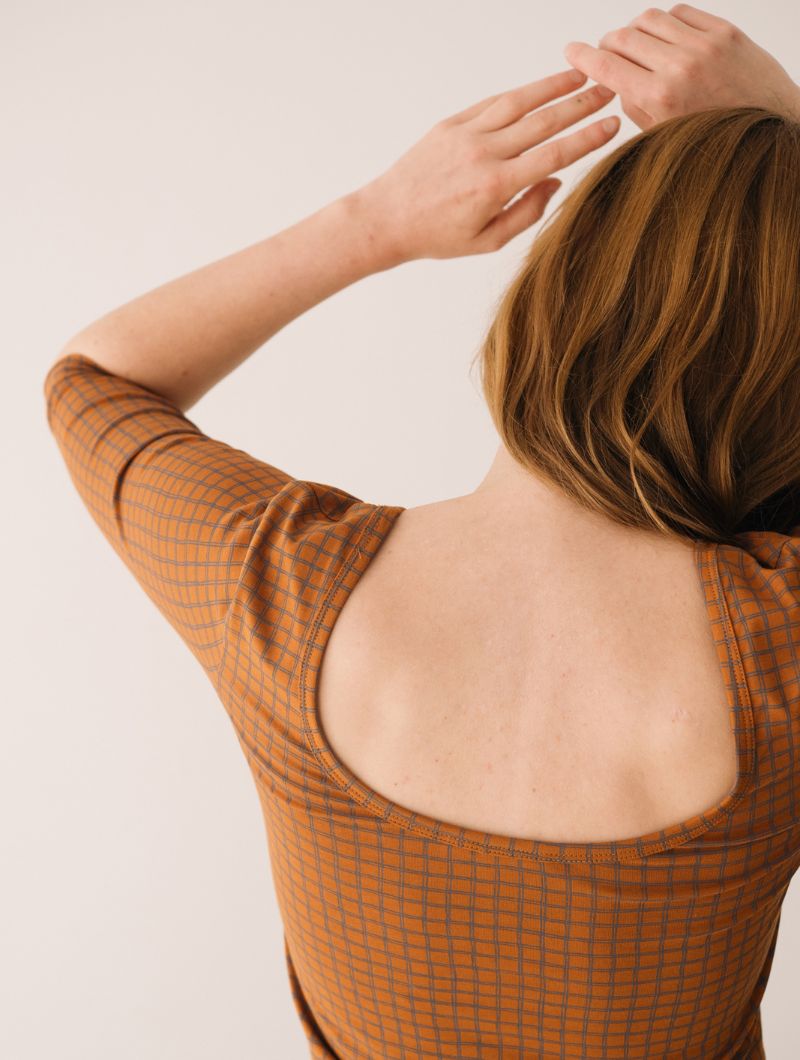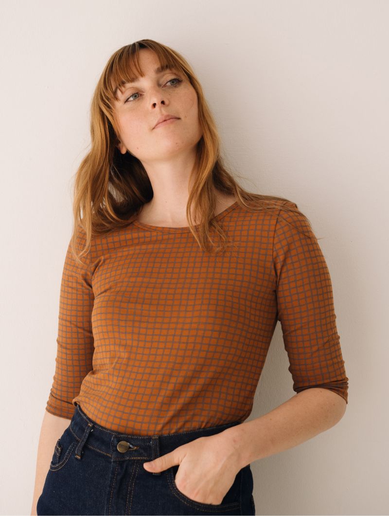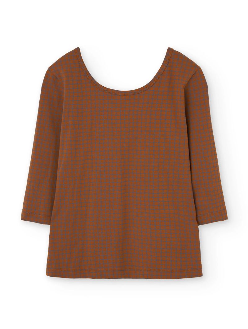 Camiseta de cuello barco de manga tres cuartos con un llamativo estampado de cuadros en tonos teja y gris. El escote puede lucirse más abierto tanto por delante como por detrás, adaptándose al estilo de cada ocasión.