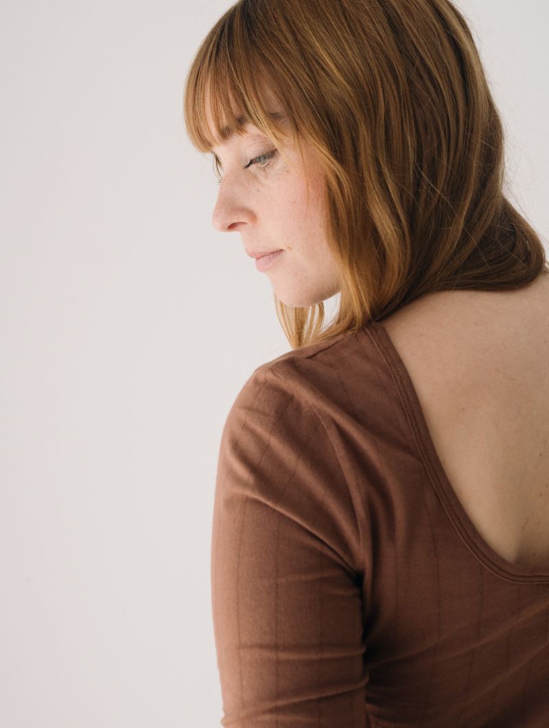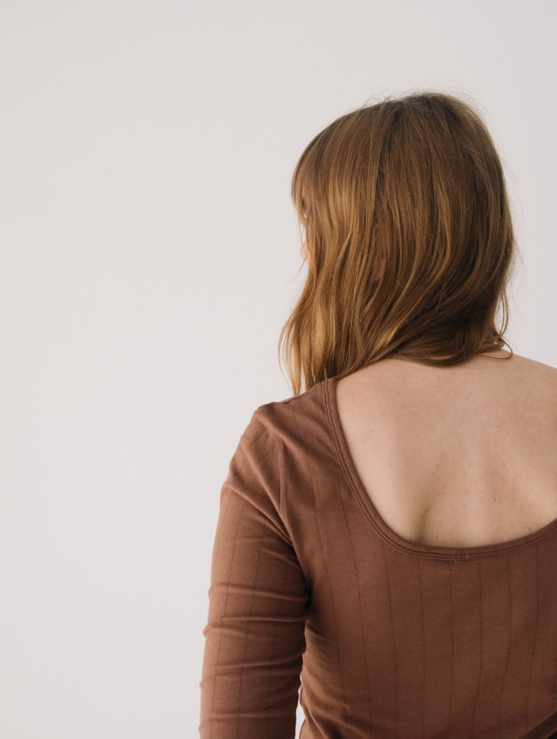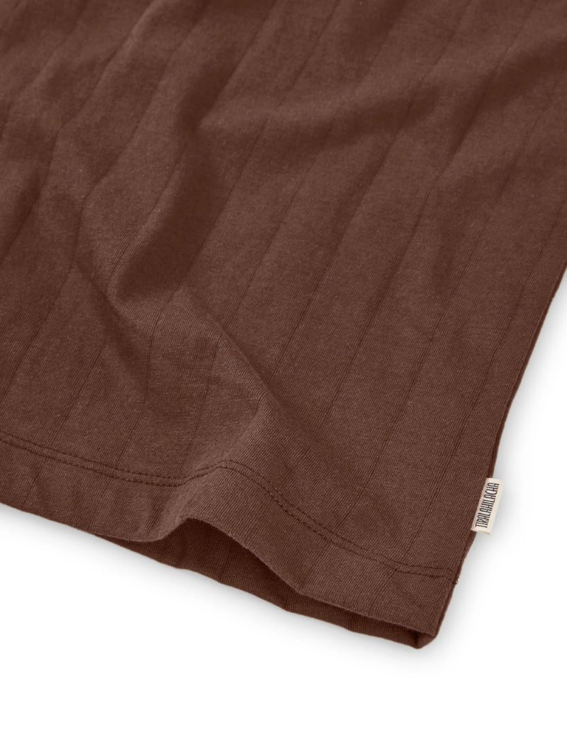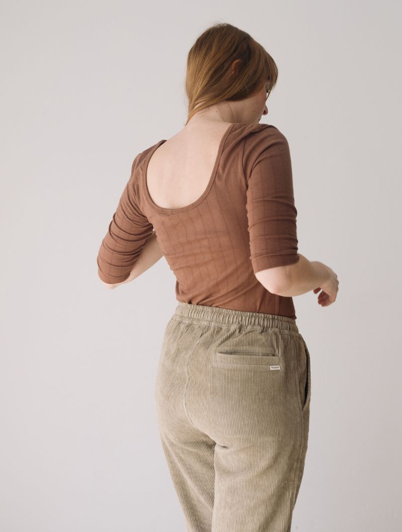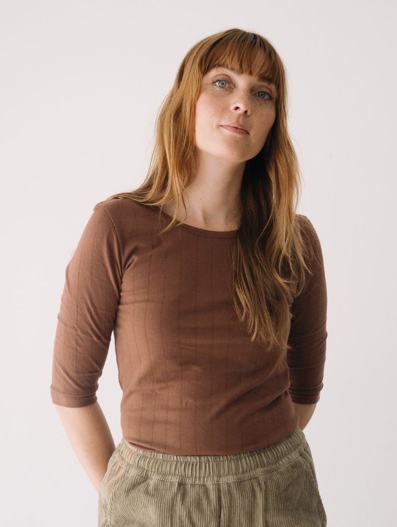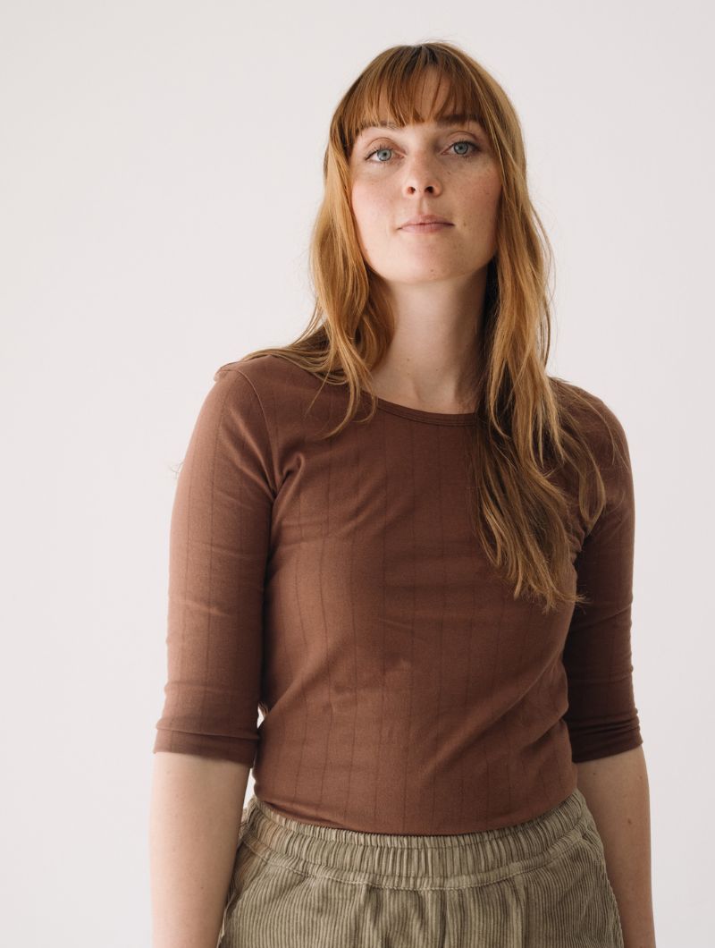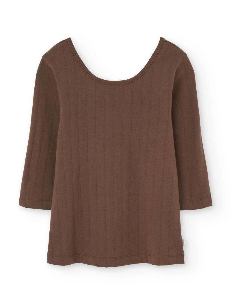 Camiseta de manga tres cuartos con escote barco y canalé de rayas verticales en color marrón. Su diseño permite llevar el escote más pronunciado tanto por delante como por detrás, adaptándose a distintos estilos y ocasiones.