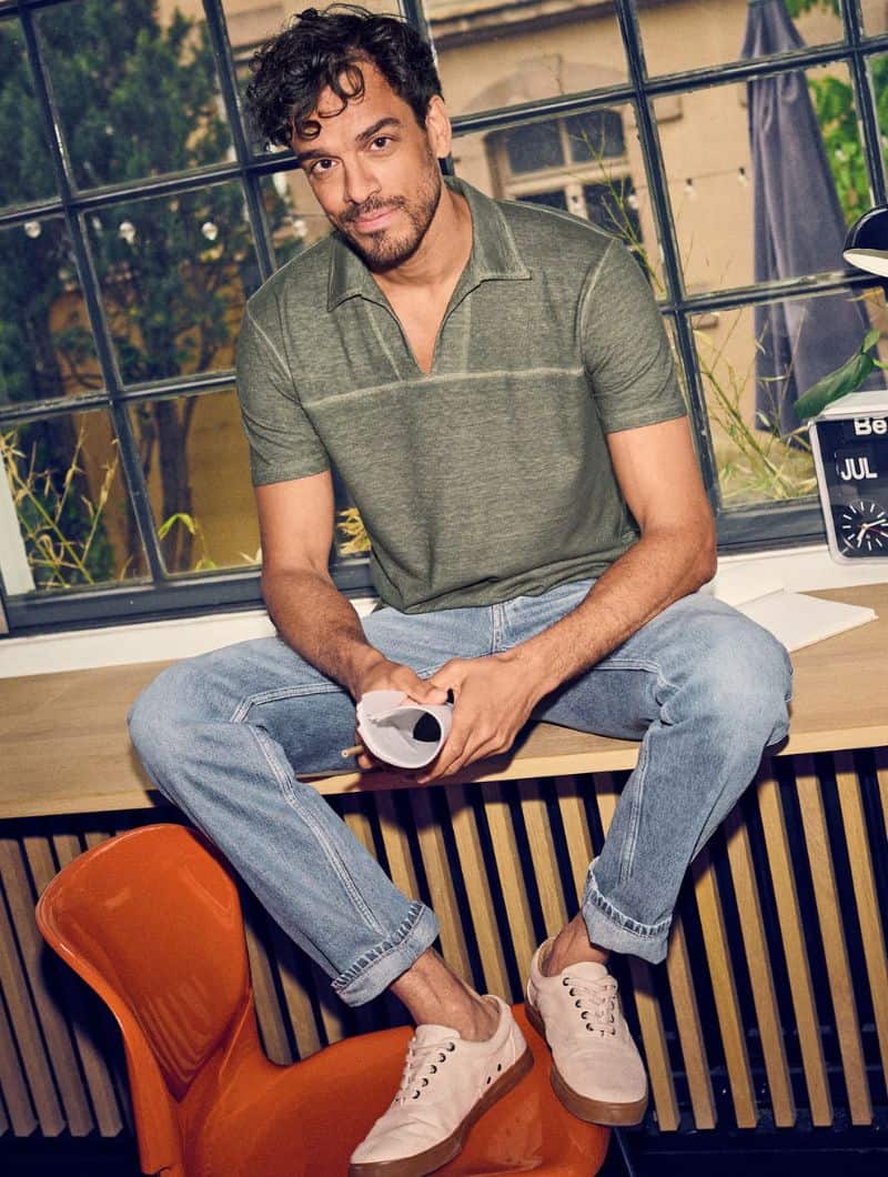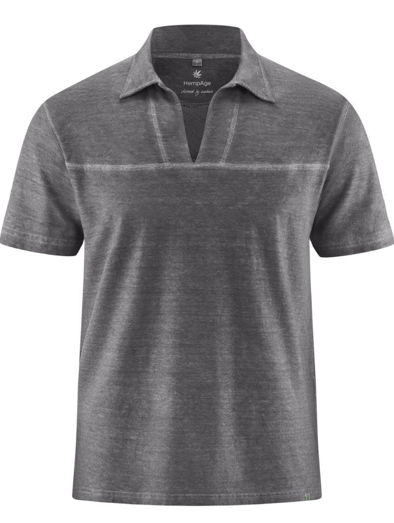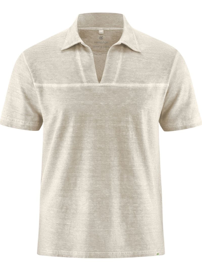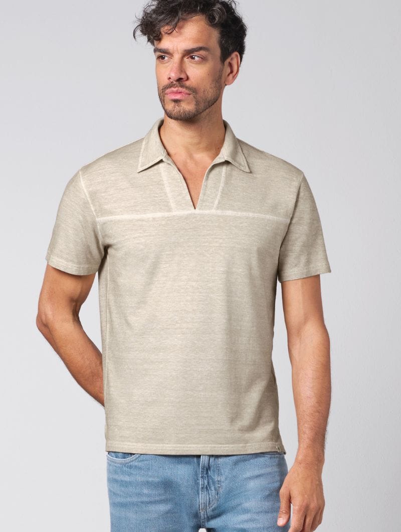 Camiseta cuello polo en V de efecto jaspeado natural. La costura horizontal en el pecho añade un detalle sutil que refuerza su diseño casual.