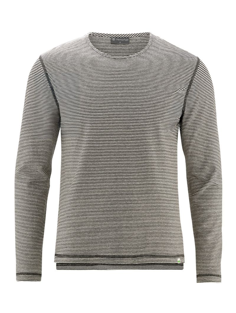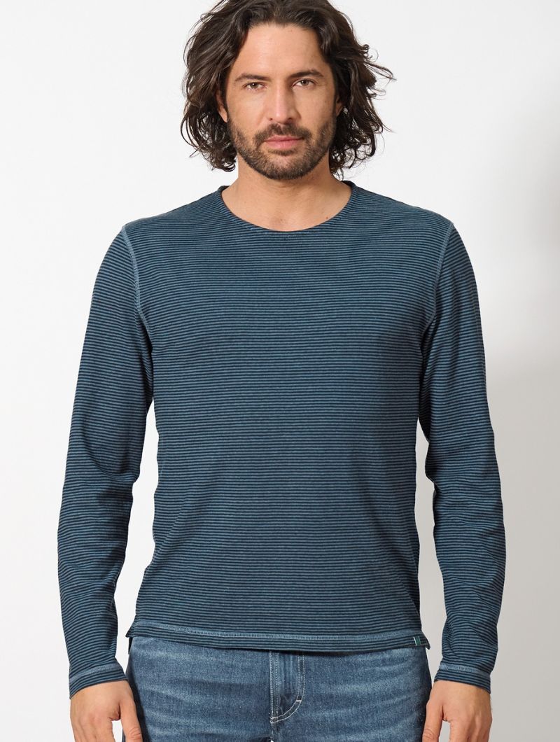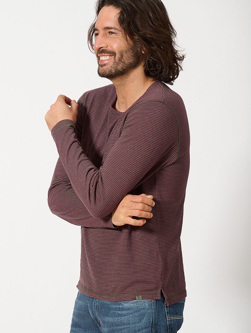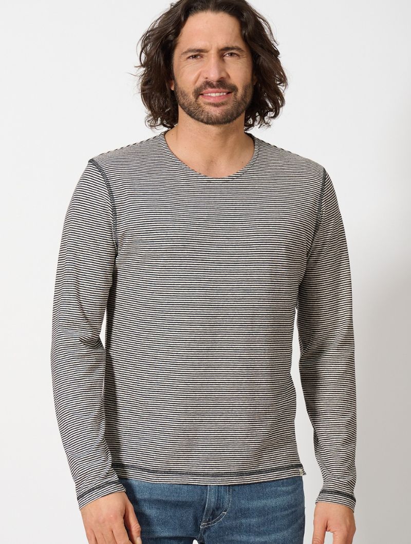 Camiseta de corte normal en punto jersey de 55% cáñamo y 45% algodón orgánico. El diseño combina rayas en colores discretos con costuras planas a contraste que le dan un aire actual. La espalda ligeramente más larga y las aberturas laterales en el bajo aportan comodidad extra y un detalle diferente.