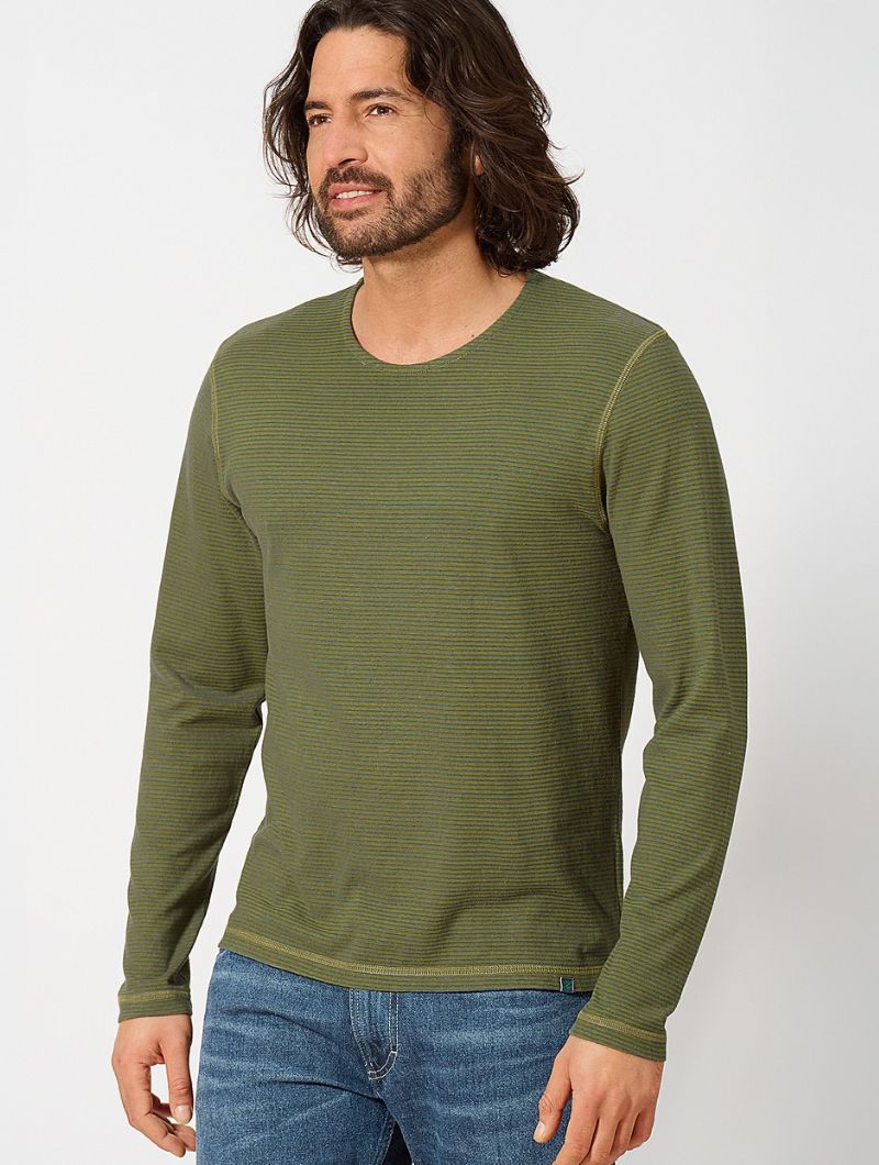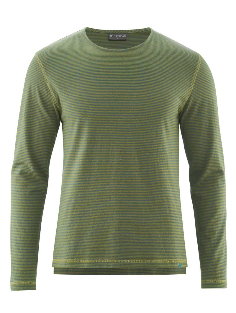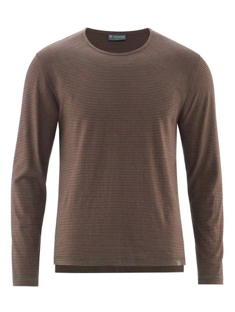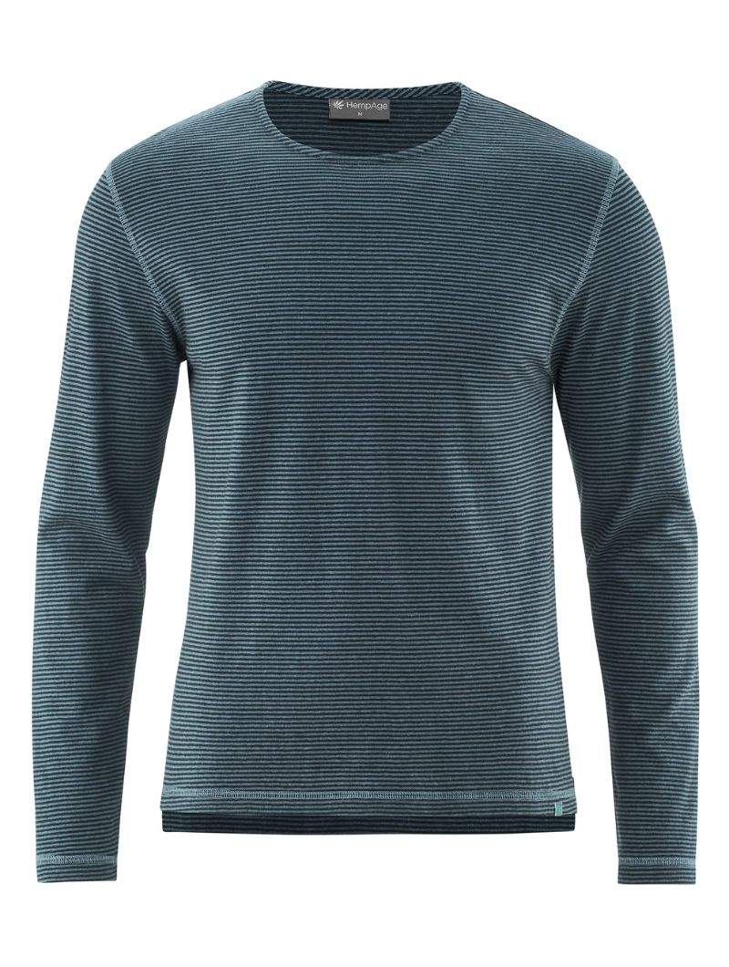 Camiseta de corte normal en punto jersey de 55% cáñamo y 45% algodón orgánico. El diseño combina rayas en colores discretos con costuras planas a contraste que le dan un aire actual. La espalda ligeramente más larga y las aberturas laterales en el bajo aportan comodidad extra y un detalle diferente.