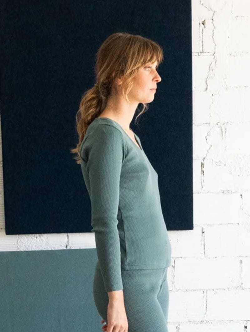 Está fabricada en tejido de canalé 100% de algodón orgánico con certificado GOTS. Su teñido sigue un riguroso estándar que controla tanto las composición química de los tintes como los vertidos al medio ambiente.
