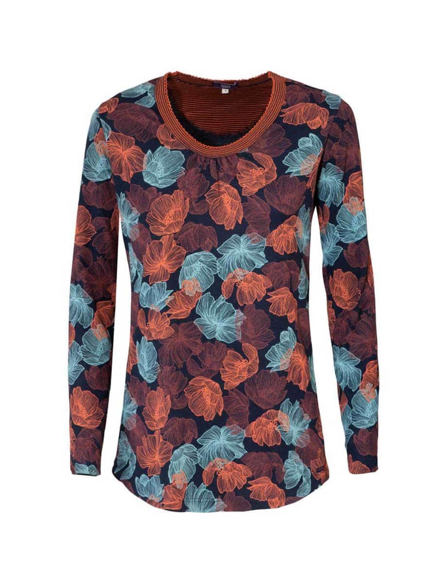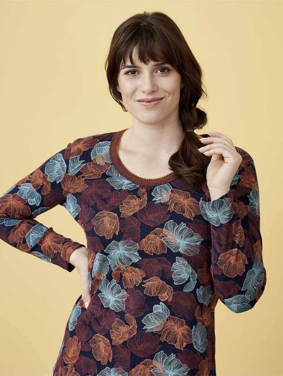 Camiseta pijama largo mujer con estampado de flores oscuras.