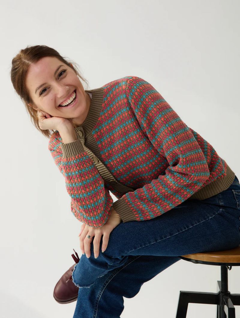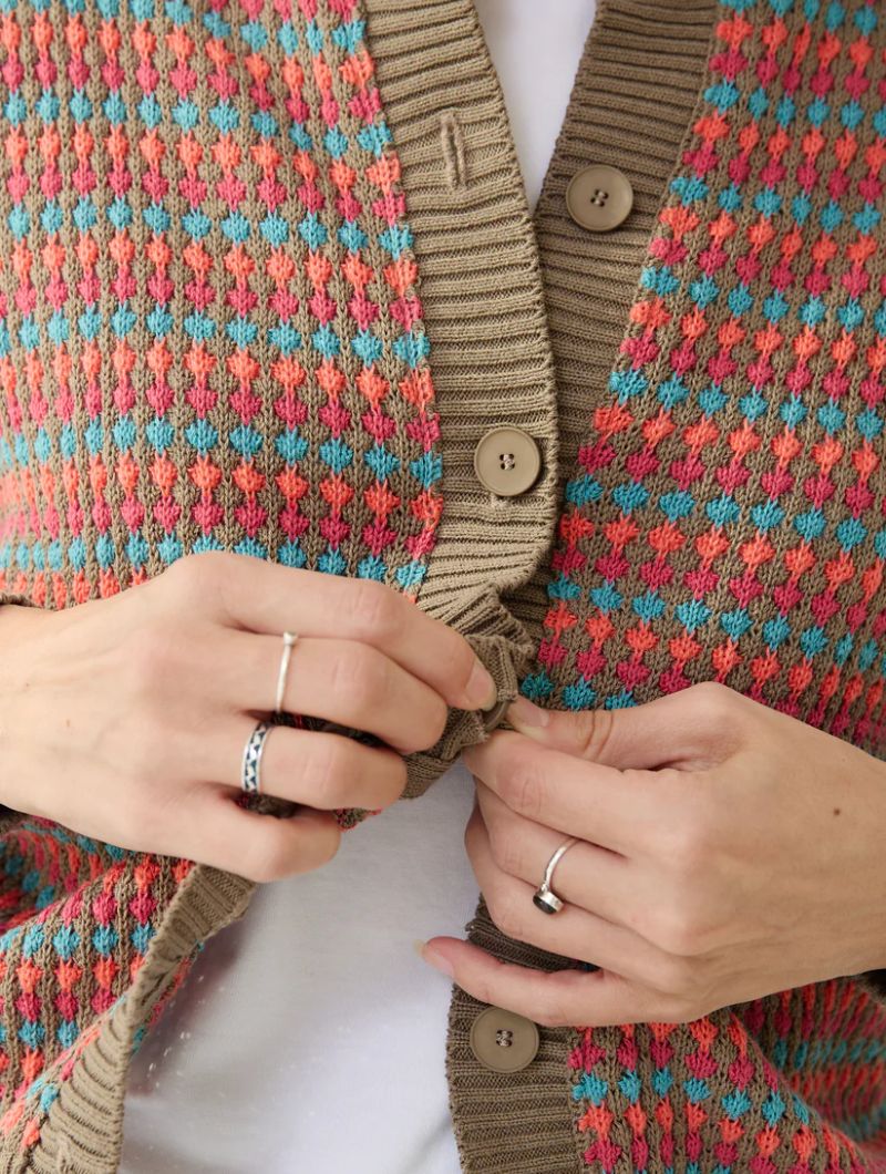 Este cárdigan combina el encanto artesanal del punto con una textura única en relieve. Su diseño de fondo arena con pequeñas “burbujas” de color fucsia, azul turquesa y salmón crea un efecto alegre y original sin perder la elegancia.