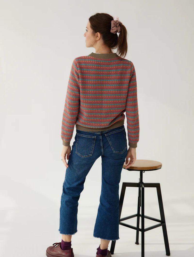Confeccionado en 50% algodón reciclado y 50% acrílico reciclado, es una prenda ligera y amorosa que ofrece confort durante todo el día. Los botones frontales y el cuello redondo clásico refuerzan su estilo atemporal y versátil.