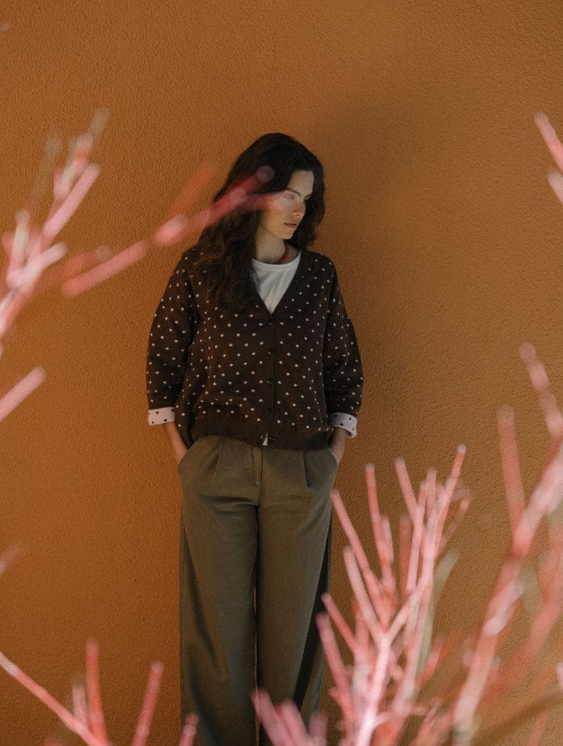 Su tono dulce combina con diamantes en contraste y botones negros de corozo, ofreciendo un look versátil como prenda exterior en estaciones intermedias.