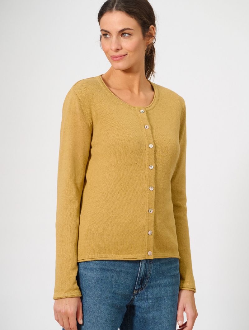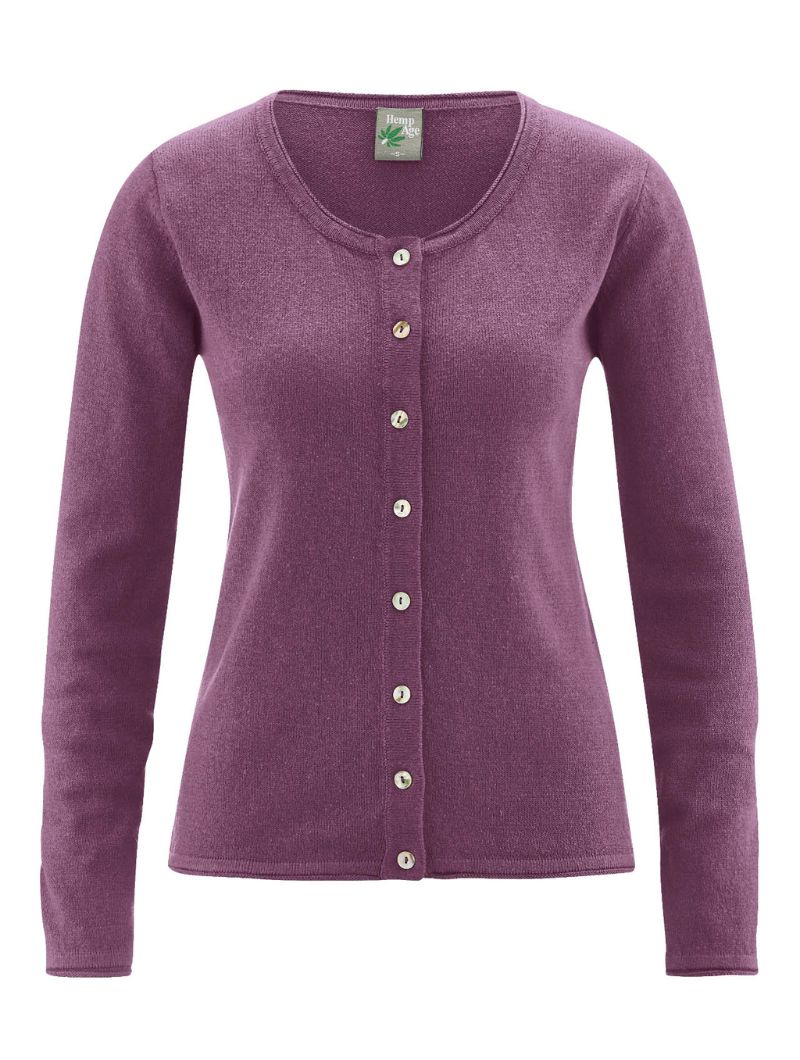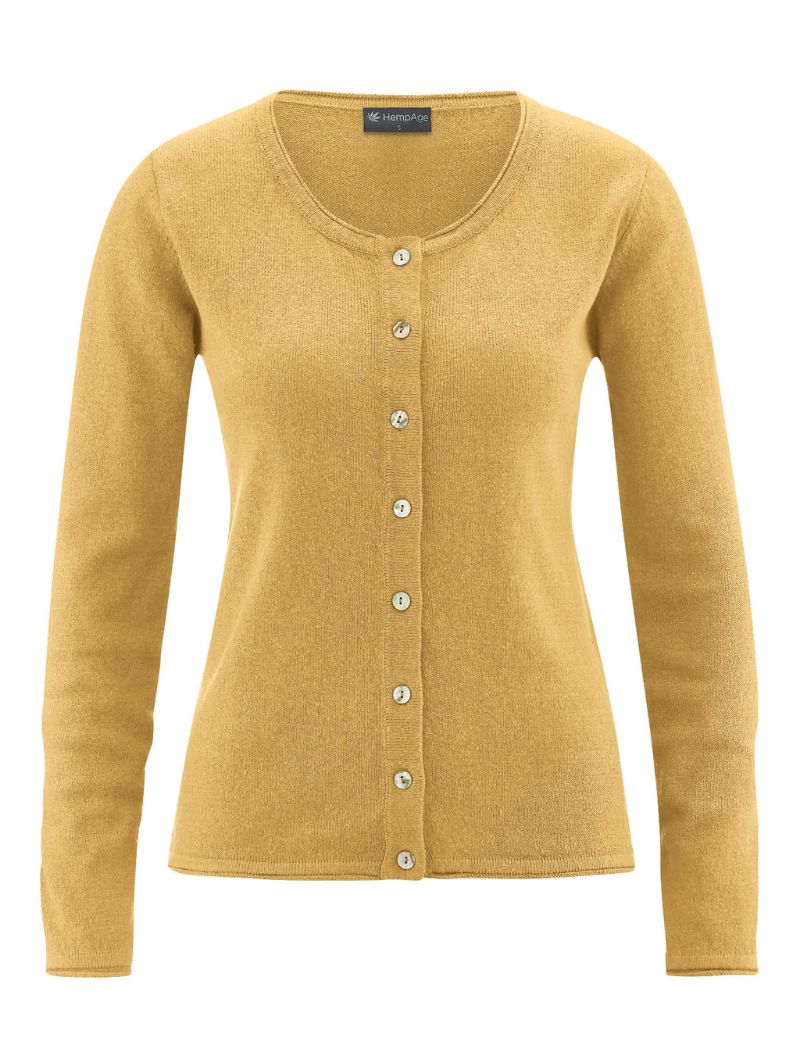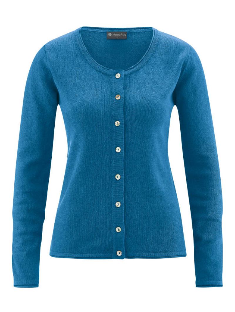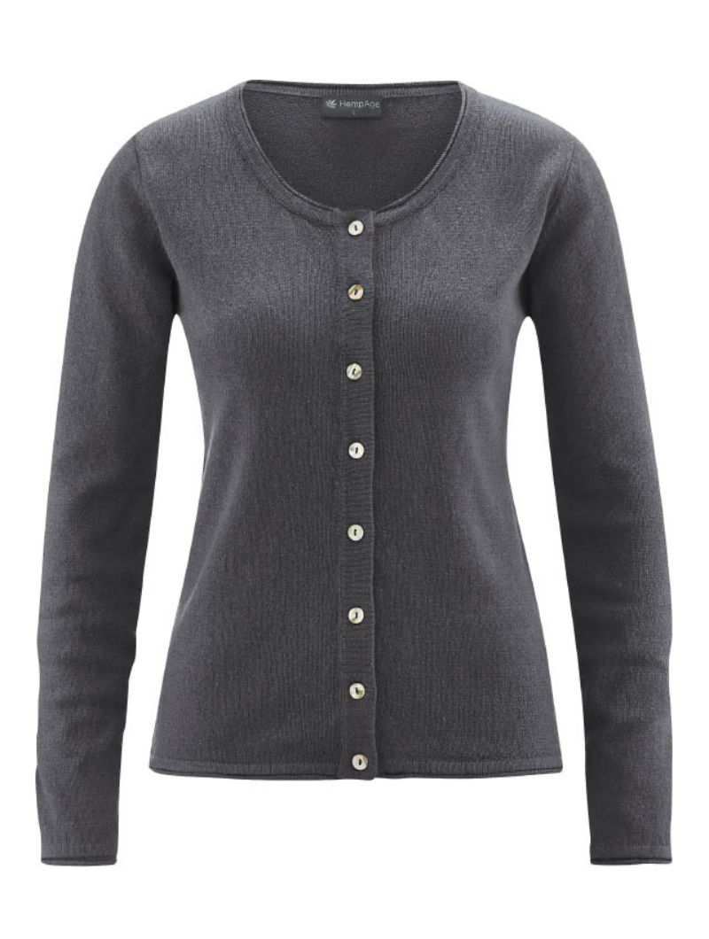 Cárdigan de punto con tejido reciclado, acabado de cuello enrollado y botones de nácar. Confeccionado con 38% cáñamo reciclado, 30% algodón orgánico y 32% algodón reciclado, aprovechando restos de producción para darles una segunda vida.