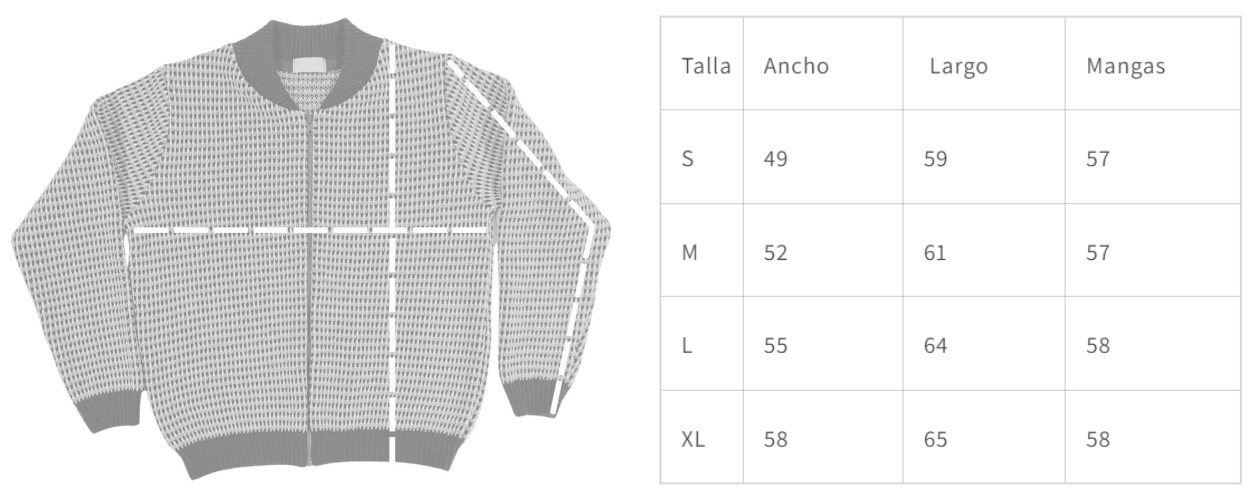 Las medidas están tomadas en plano (en centímetros) y pueden variar ligeramente al tratarse de una confección artesanal. Te recomendamos comparar las dimensiones con una chaqueta que ya tengas y te quede bien.