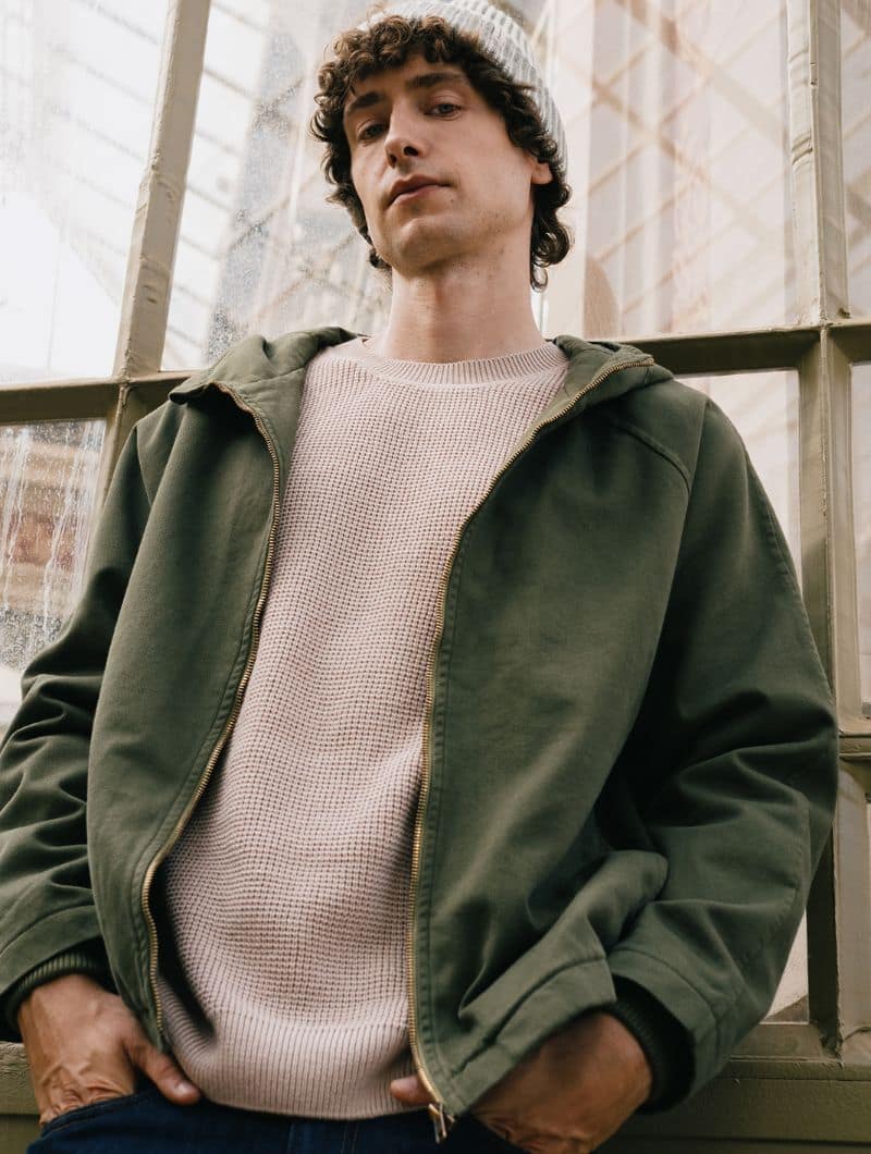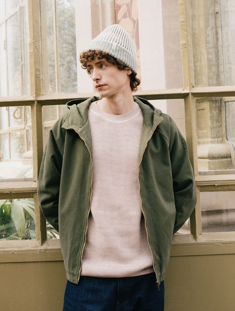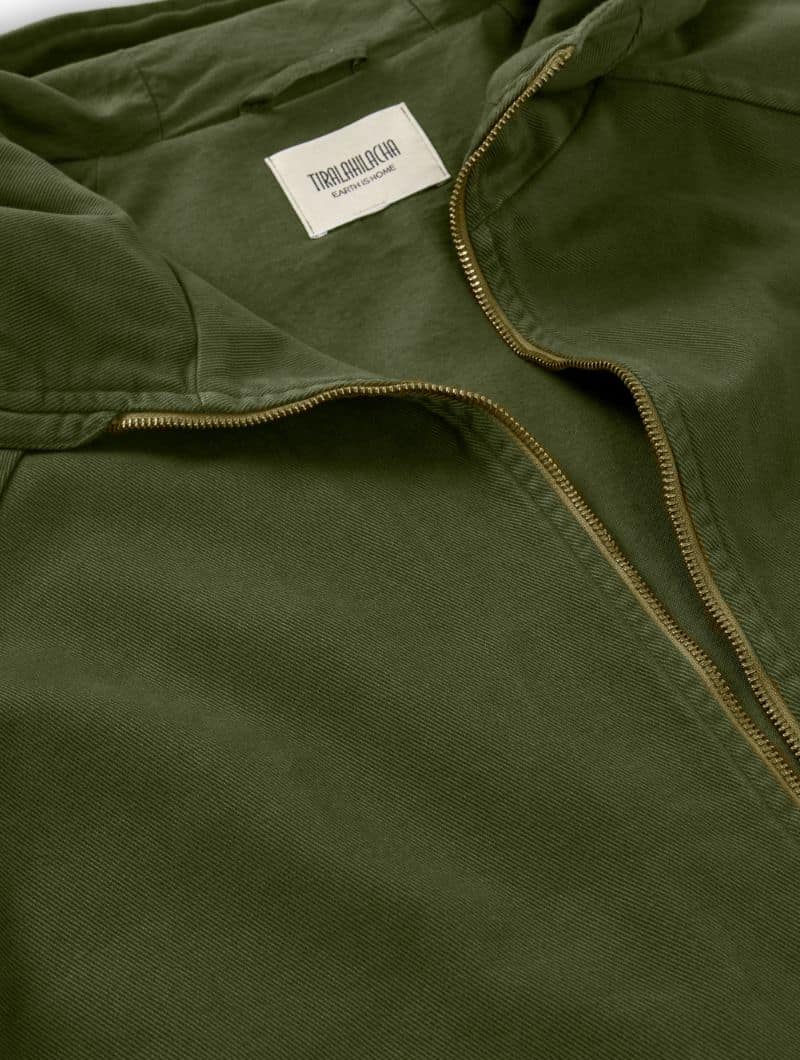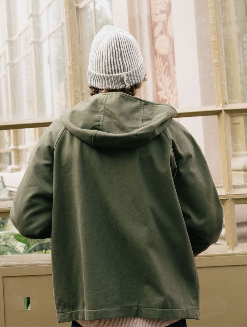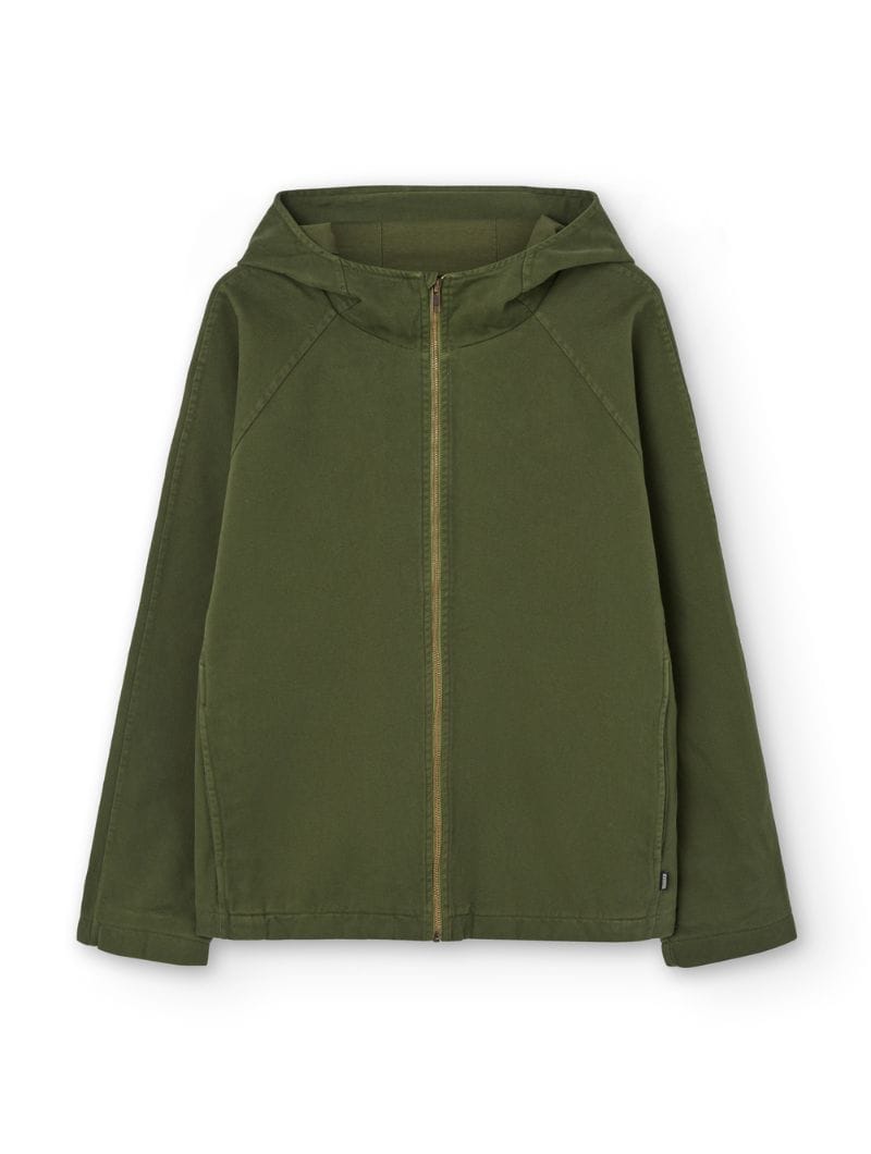 Chaqueta con capucha para hombre en color verde oliva, confeccionada en algodón orgánico.