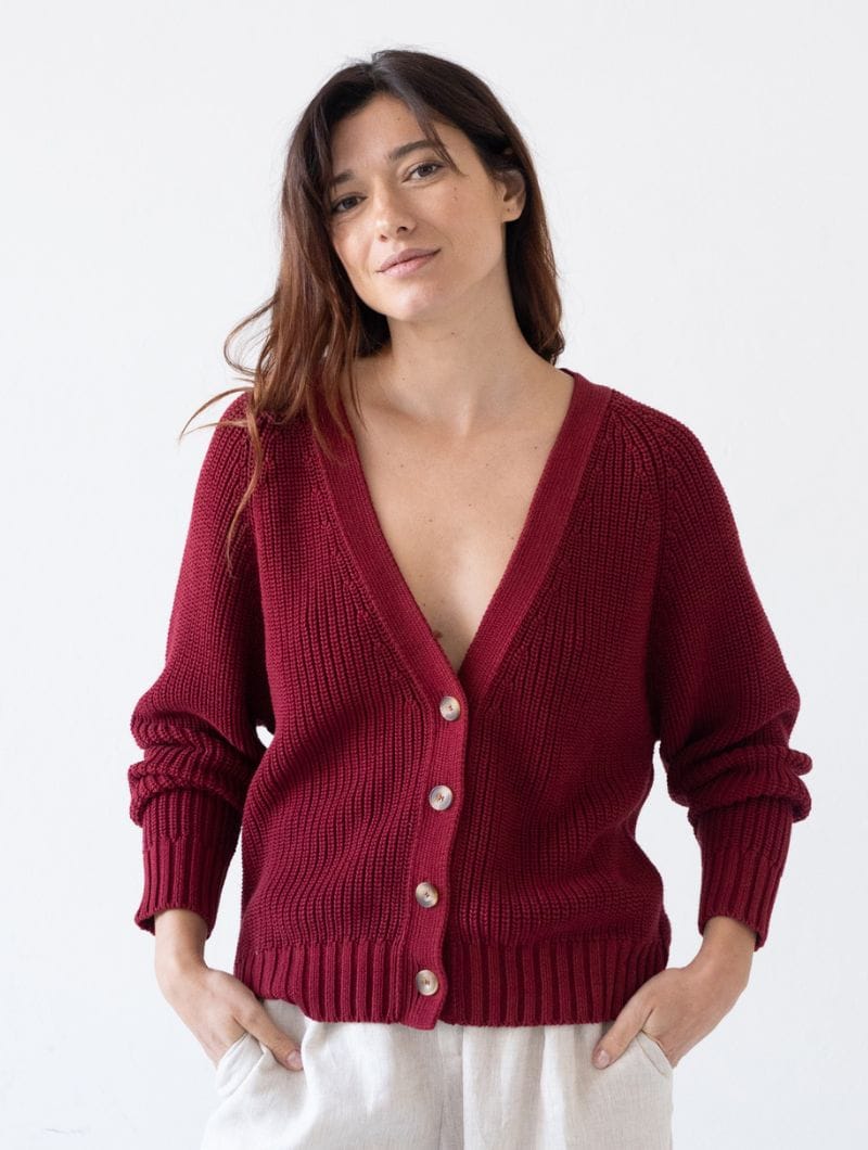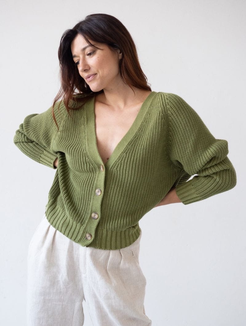 Chaqueta corta de punto perlado con manga ranglán y cierre frontal con botones de corozo.