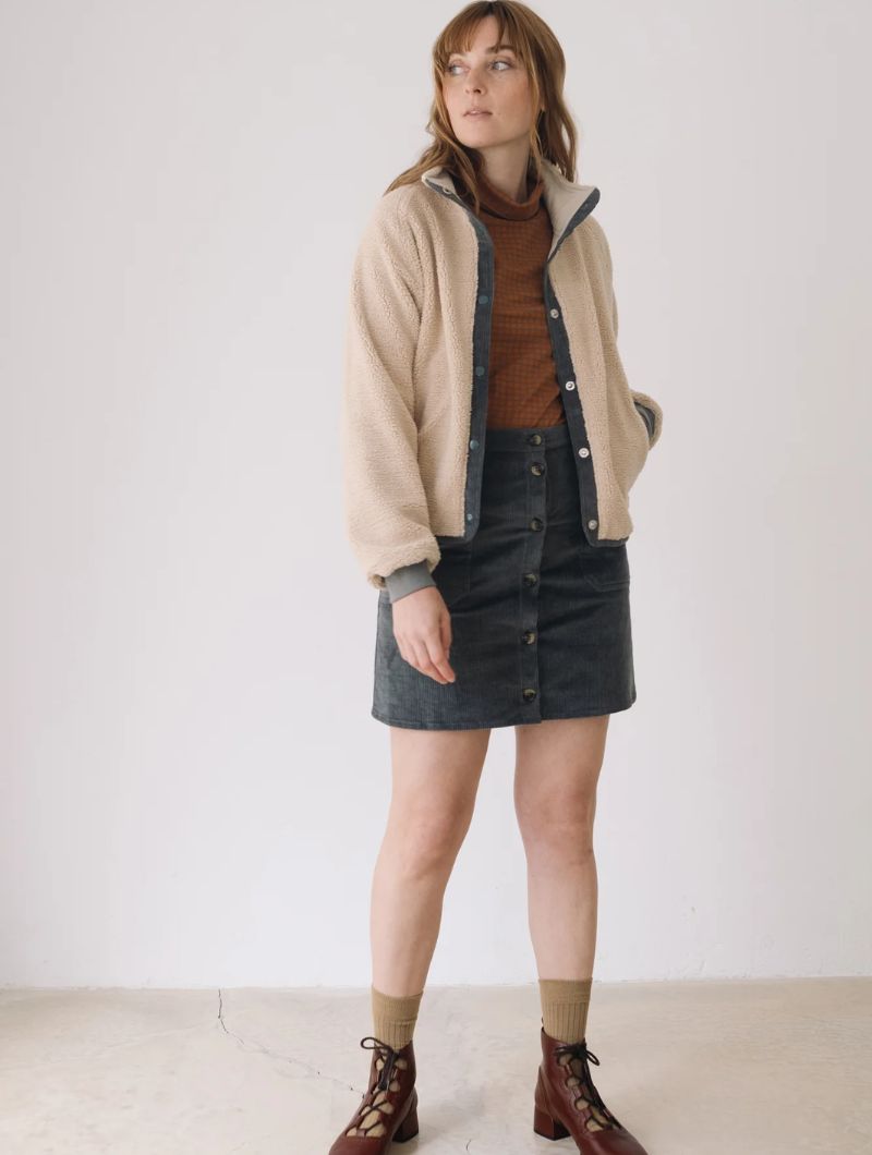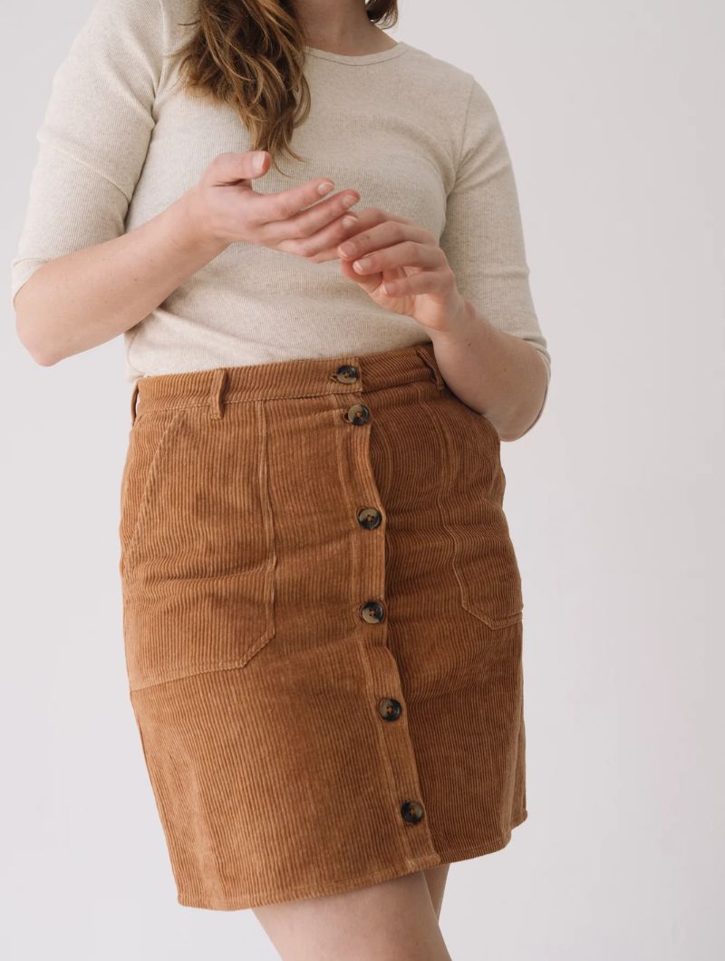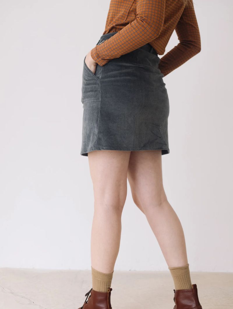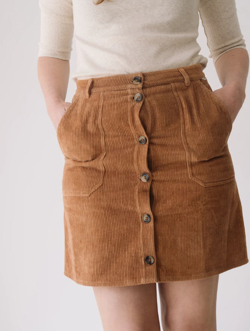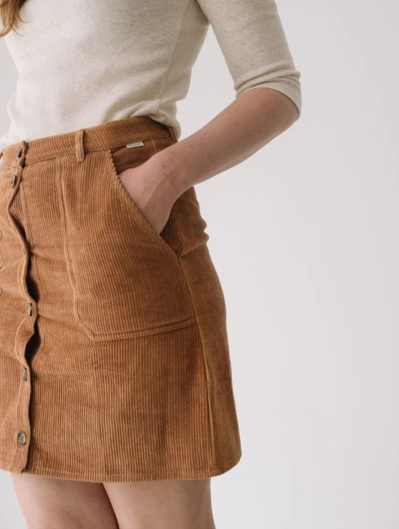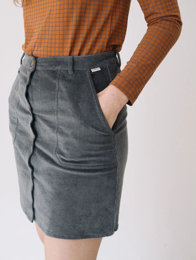 Falda de pana gruesa confeccionada con algodón orgánico certificado GOTS (95%) y un pequeño porcentaje de elastano (5%) para mayor confort. Su tejido es cálido, flexible y suave, ideal para los meses fríos.