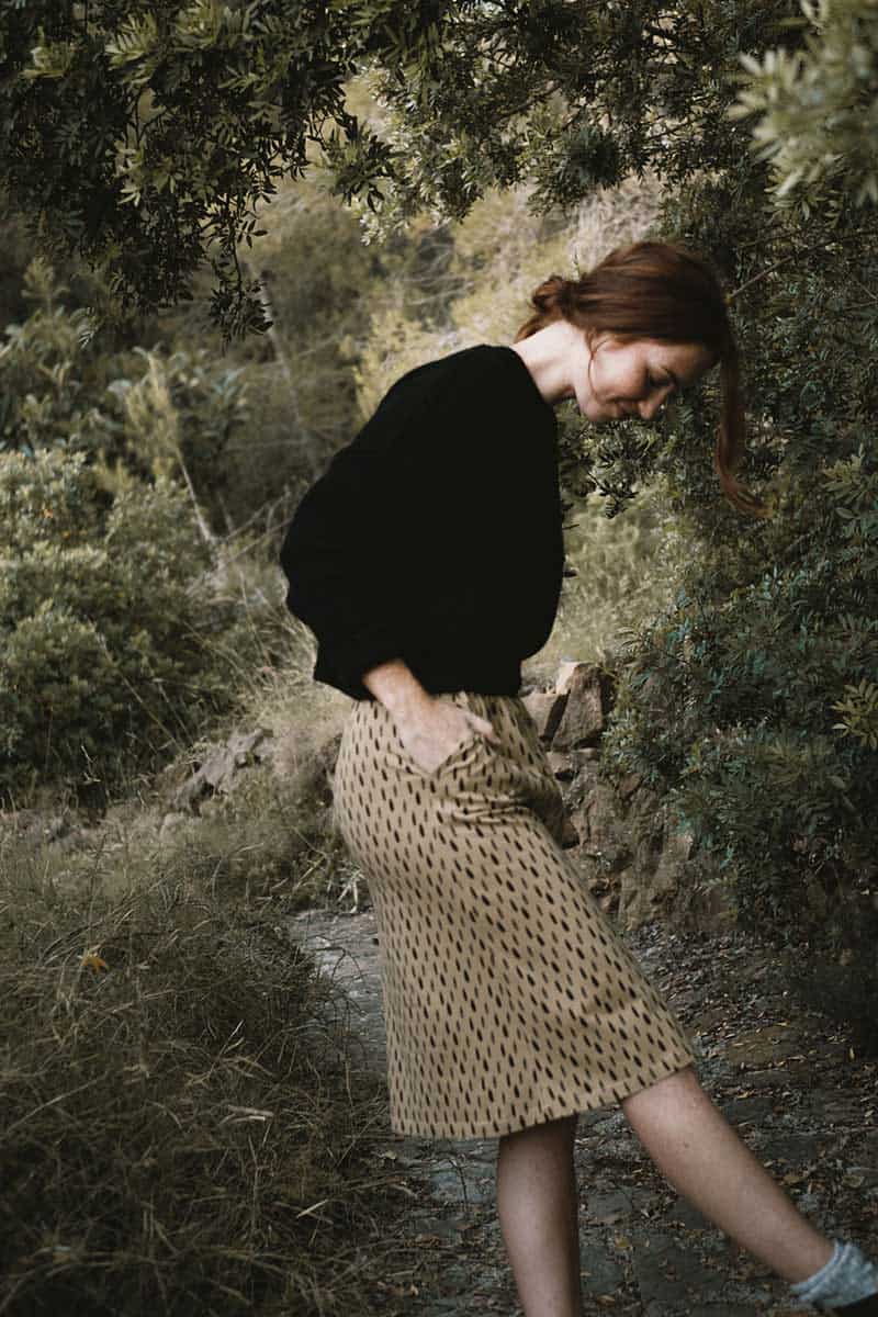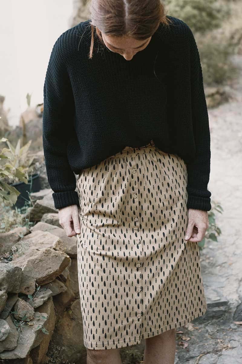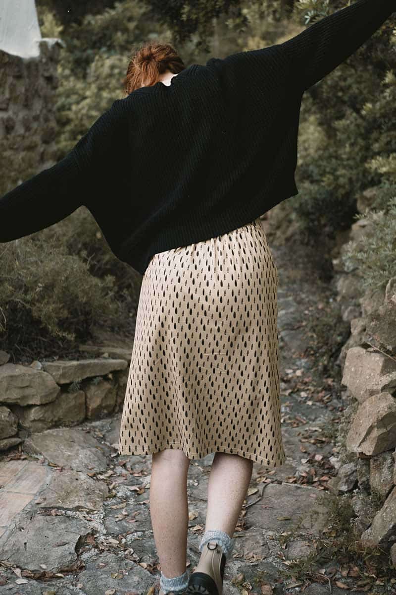La falda midi beige es una prenda de comercio justo respetuosa con el medio ambiente y los derechos humanos.