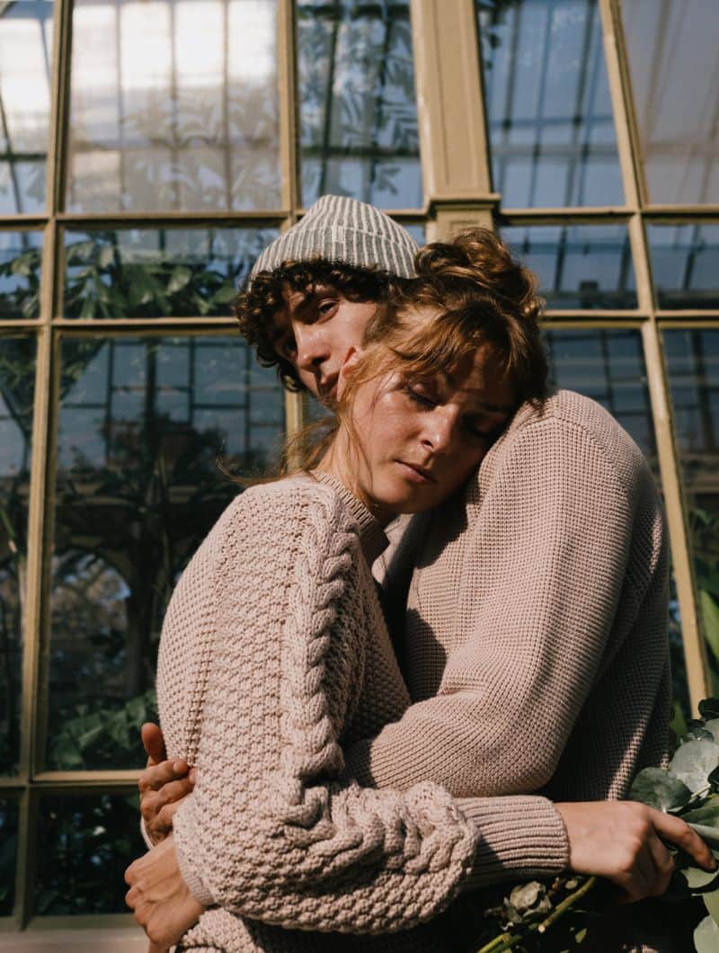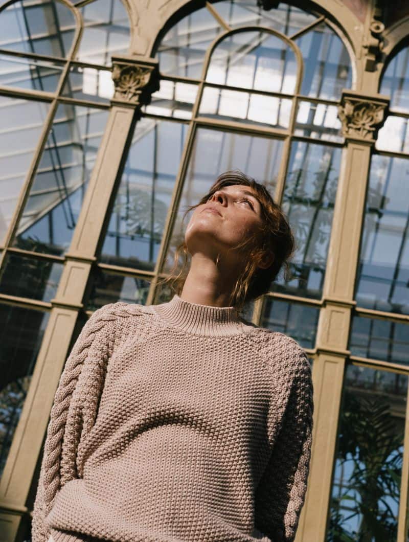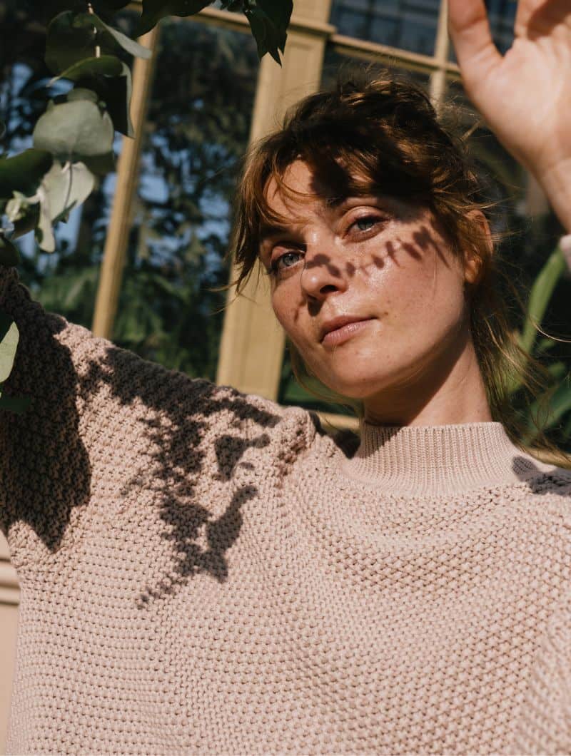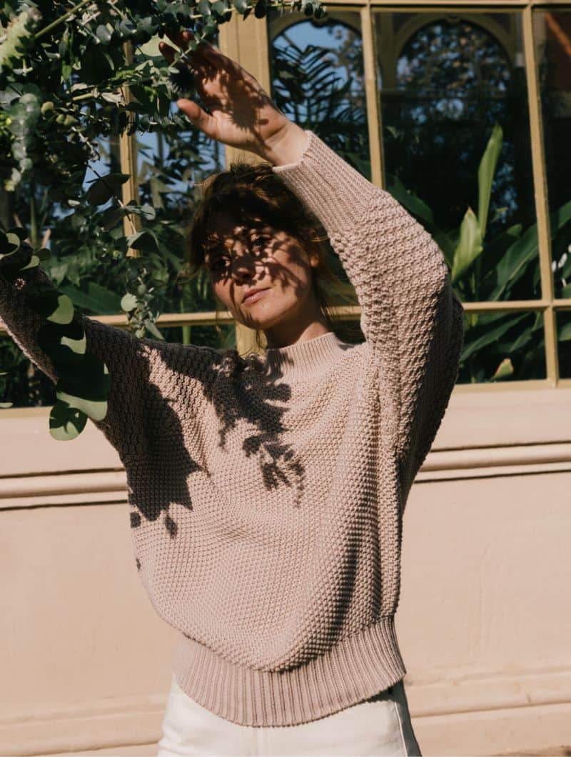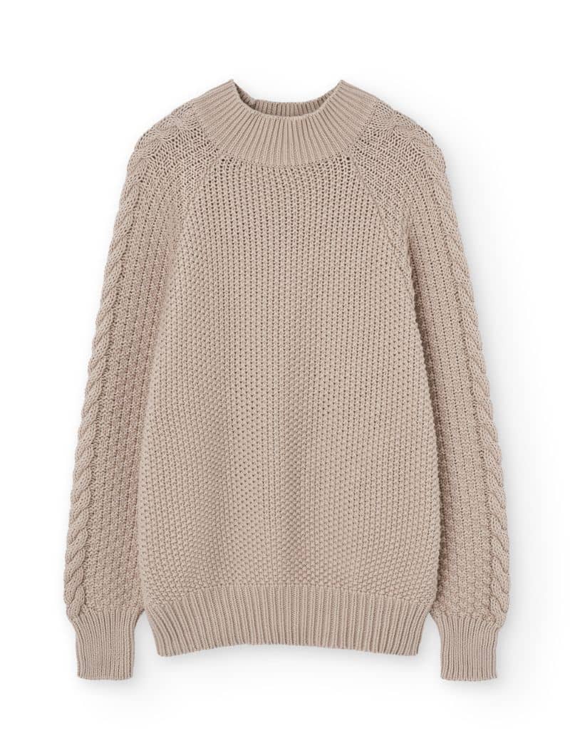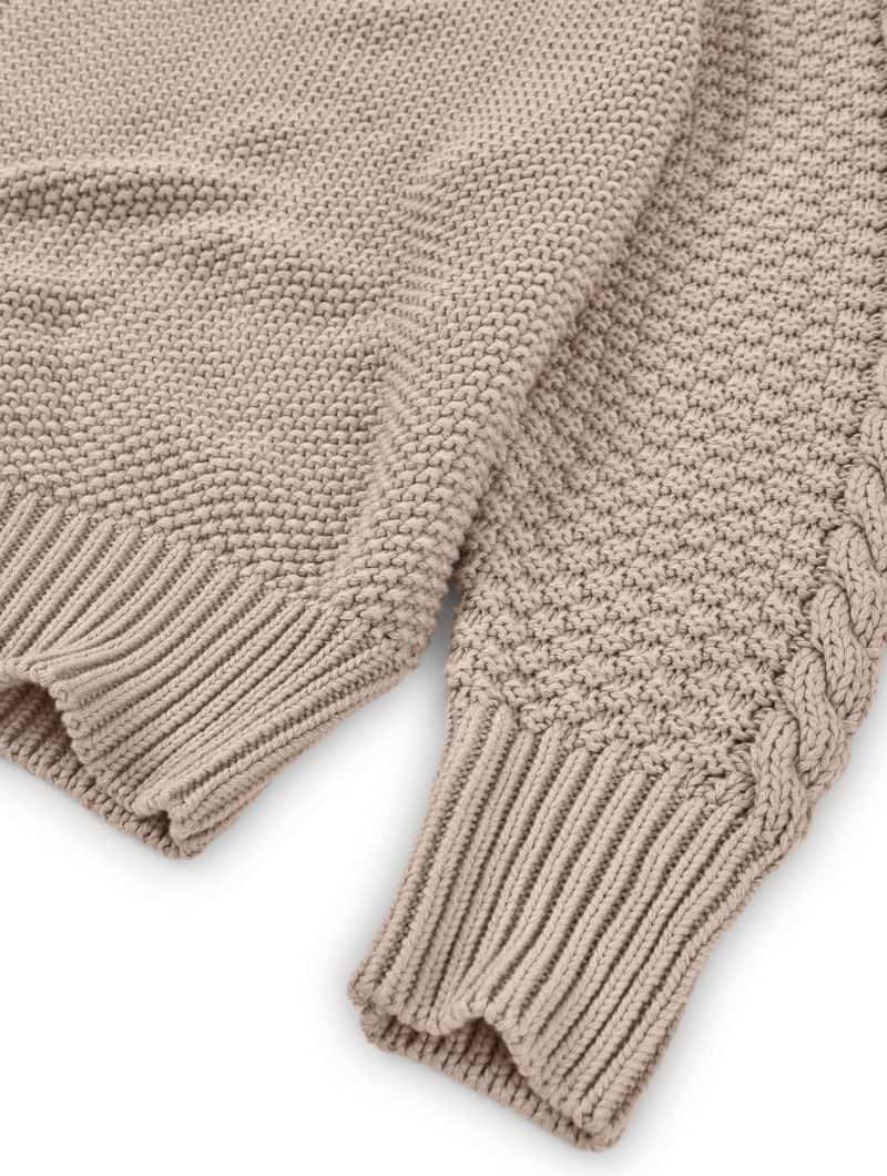 Jersey beige mujer de algodón orgánico, con un estilo bohemio y mangas trenzadas que le aportan un toque artesanal.