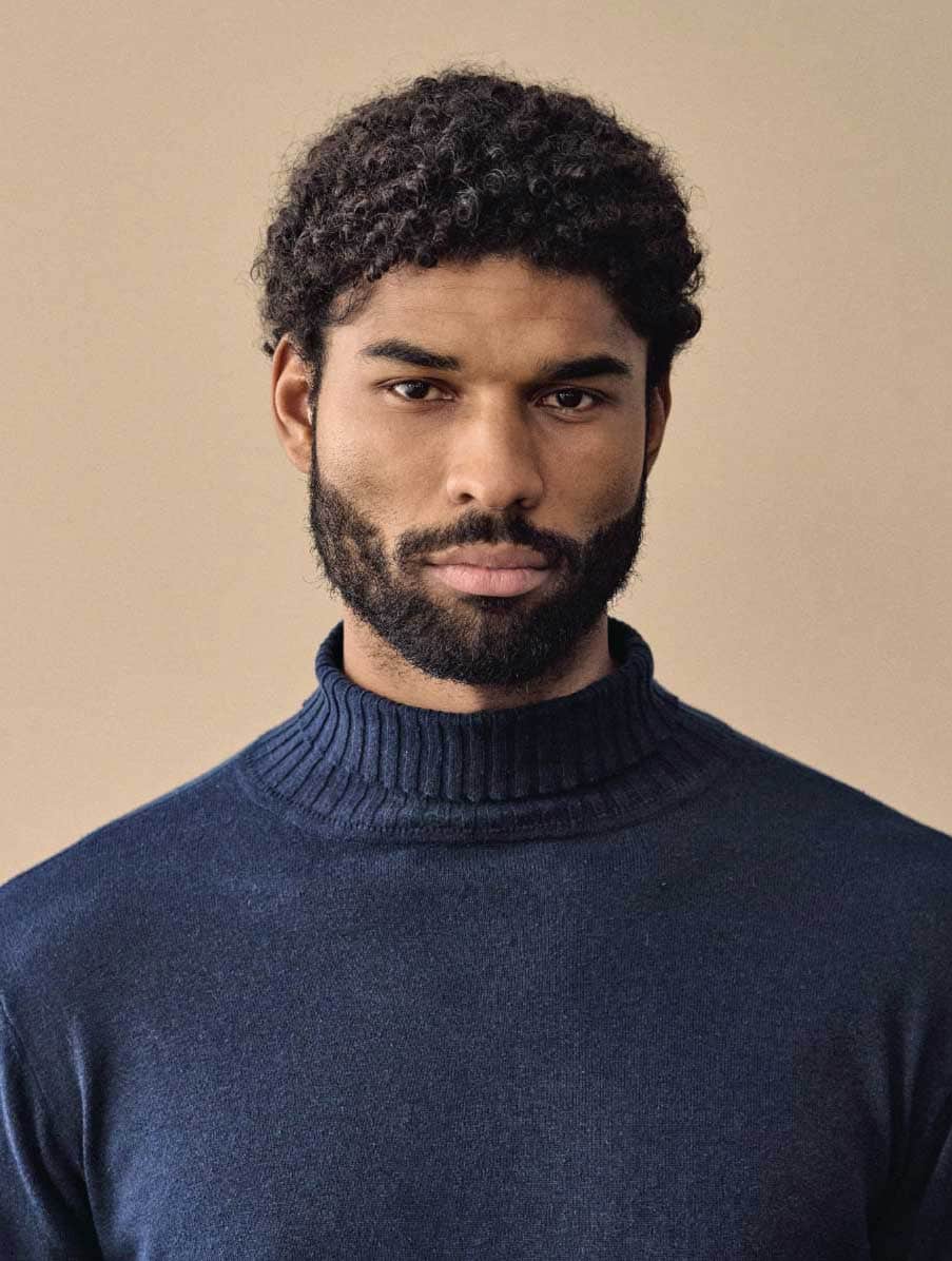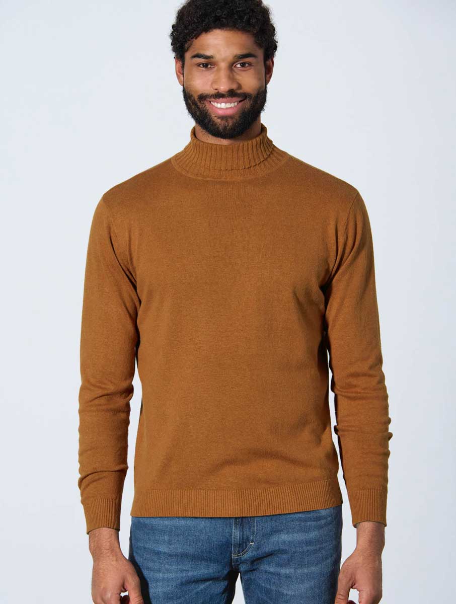 Este suéter de punto fino para hombre presenta corte recto y cuello tipo cisne acanalado.