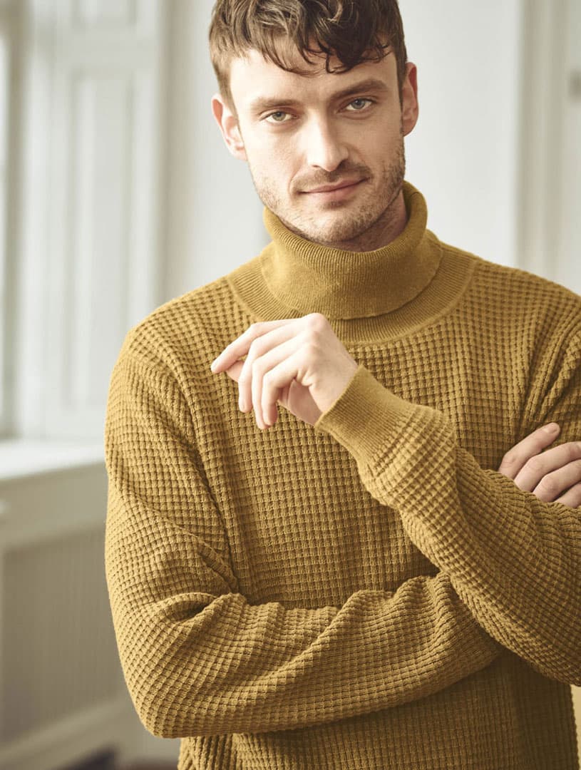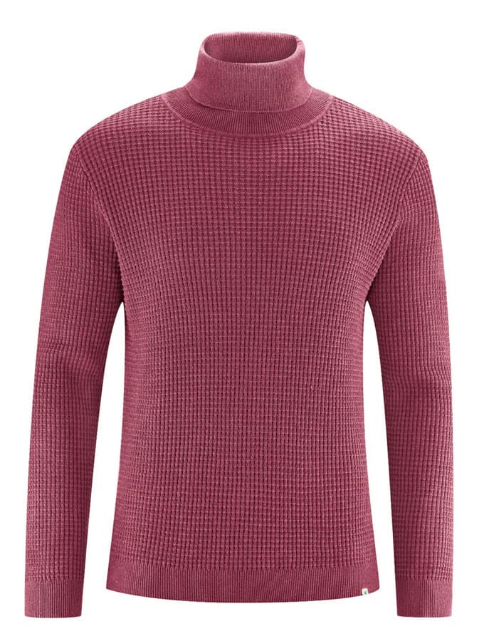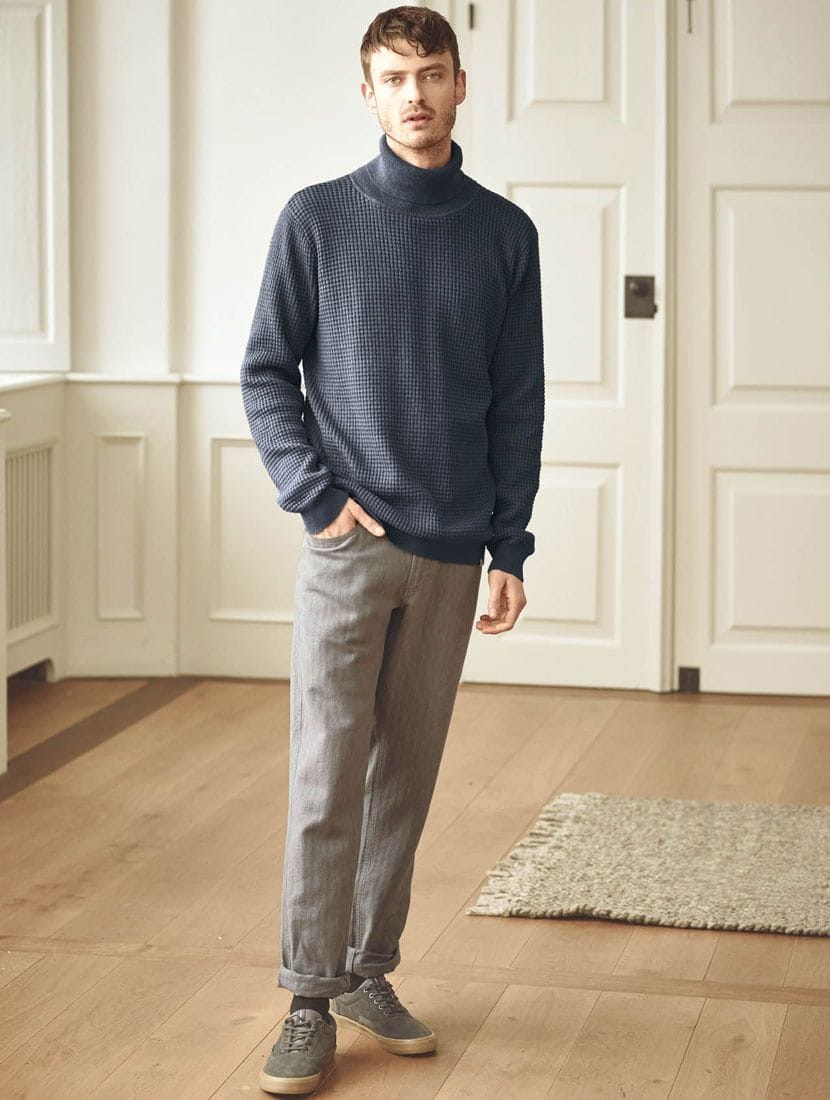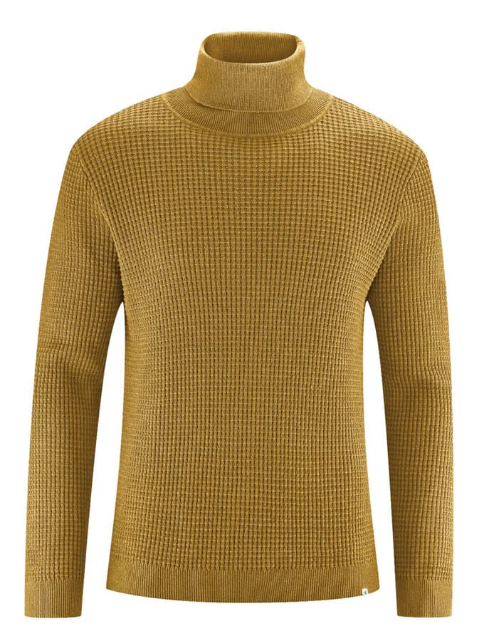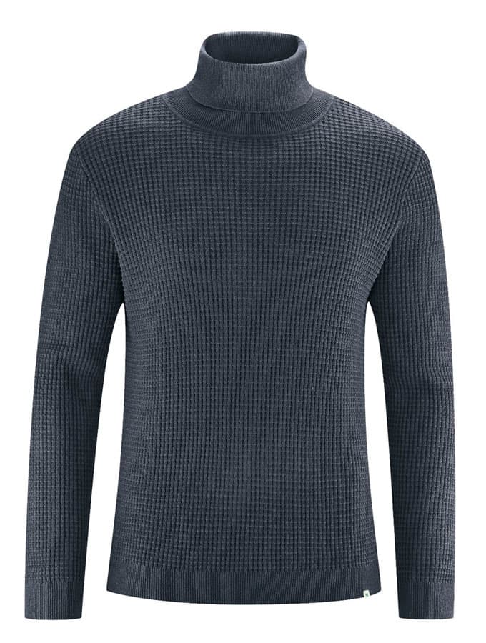 Este suéter de cuello cisne para hombre presenta un original patrón de punto gofre.