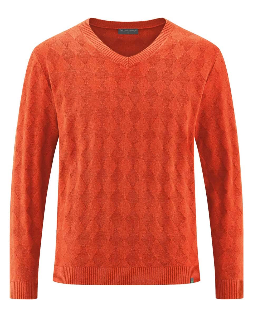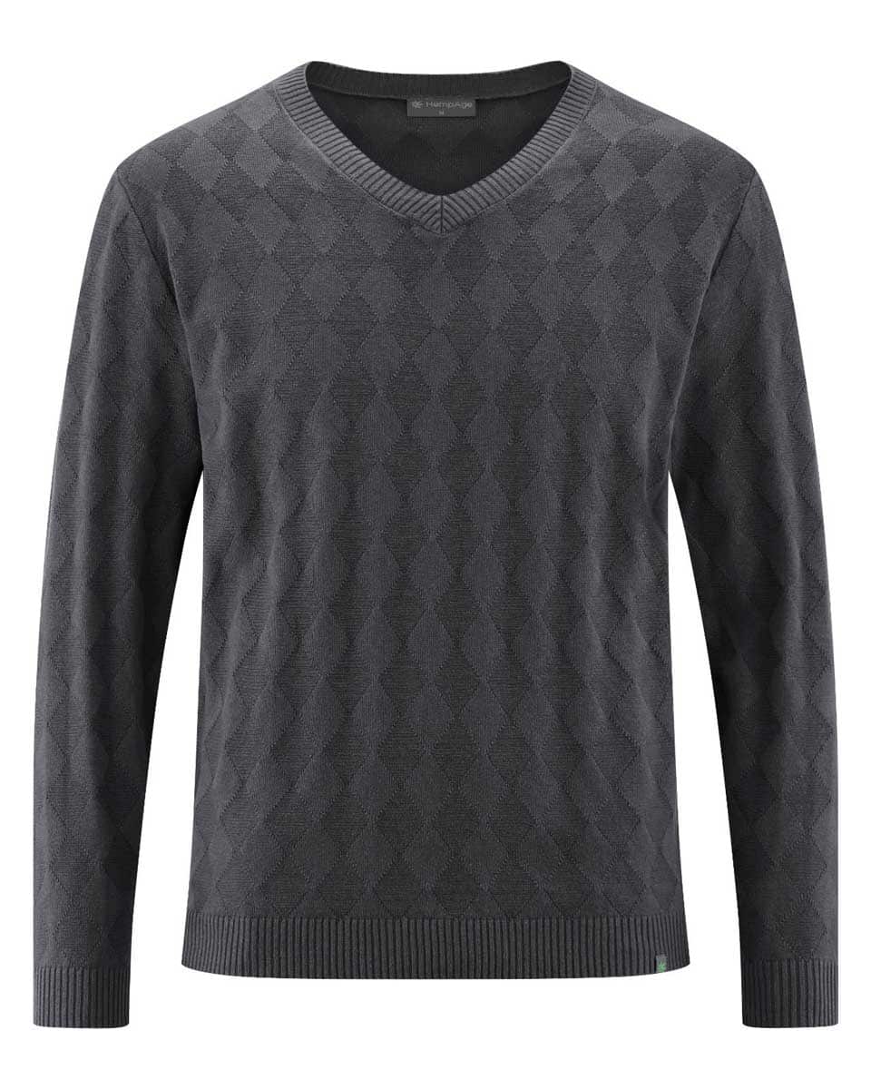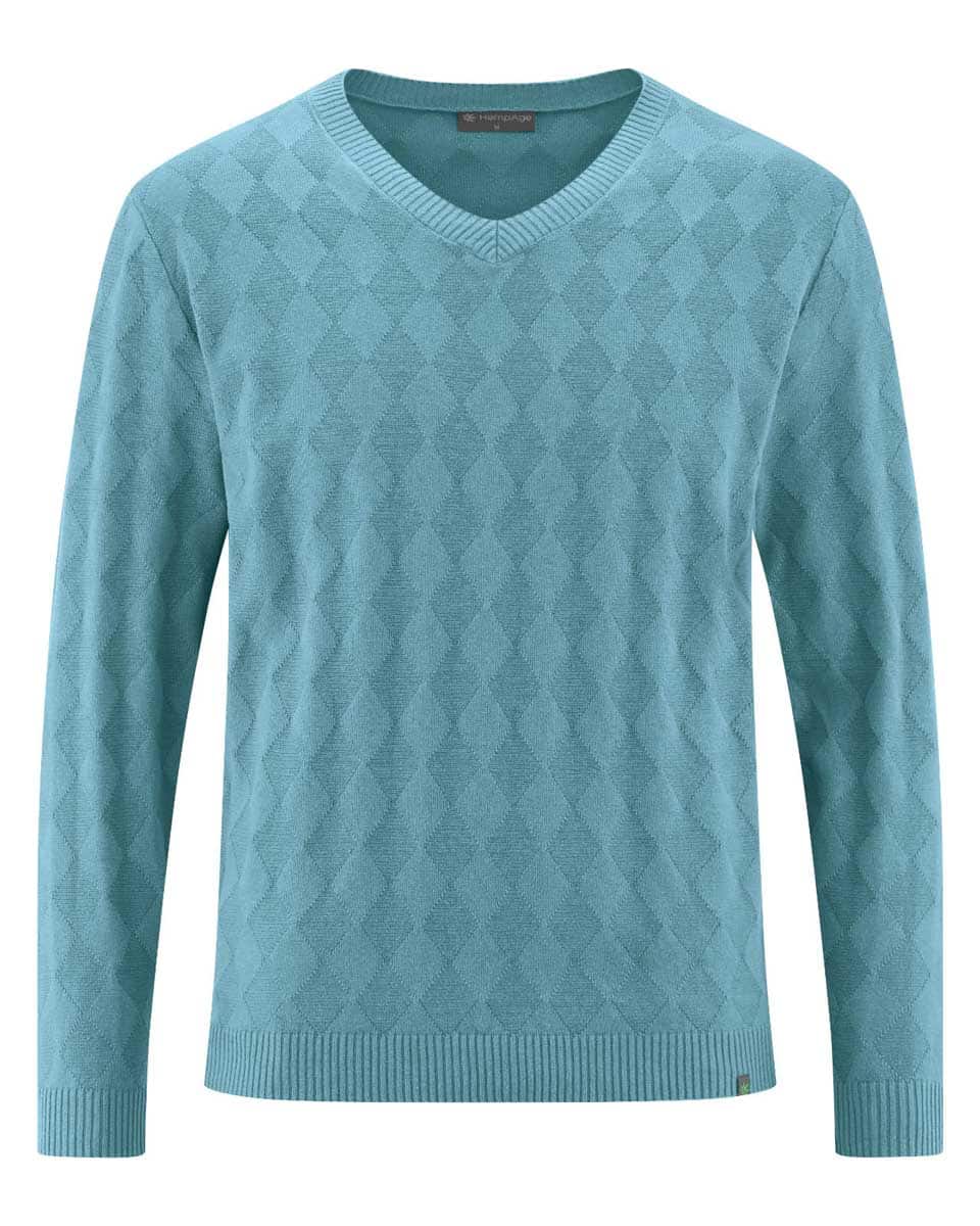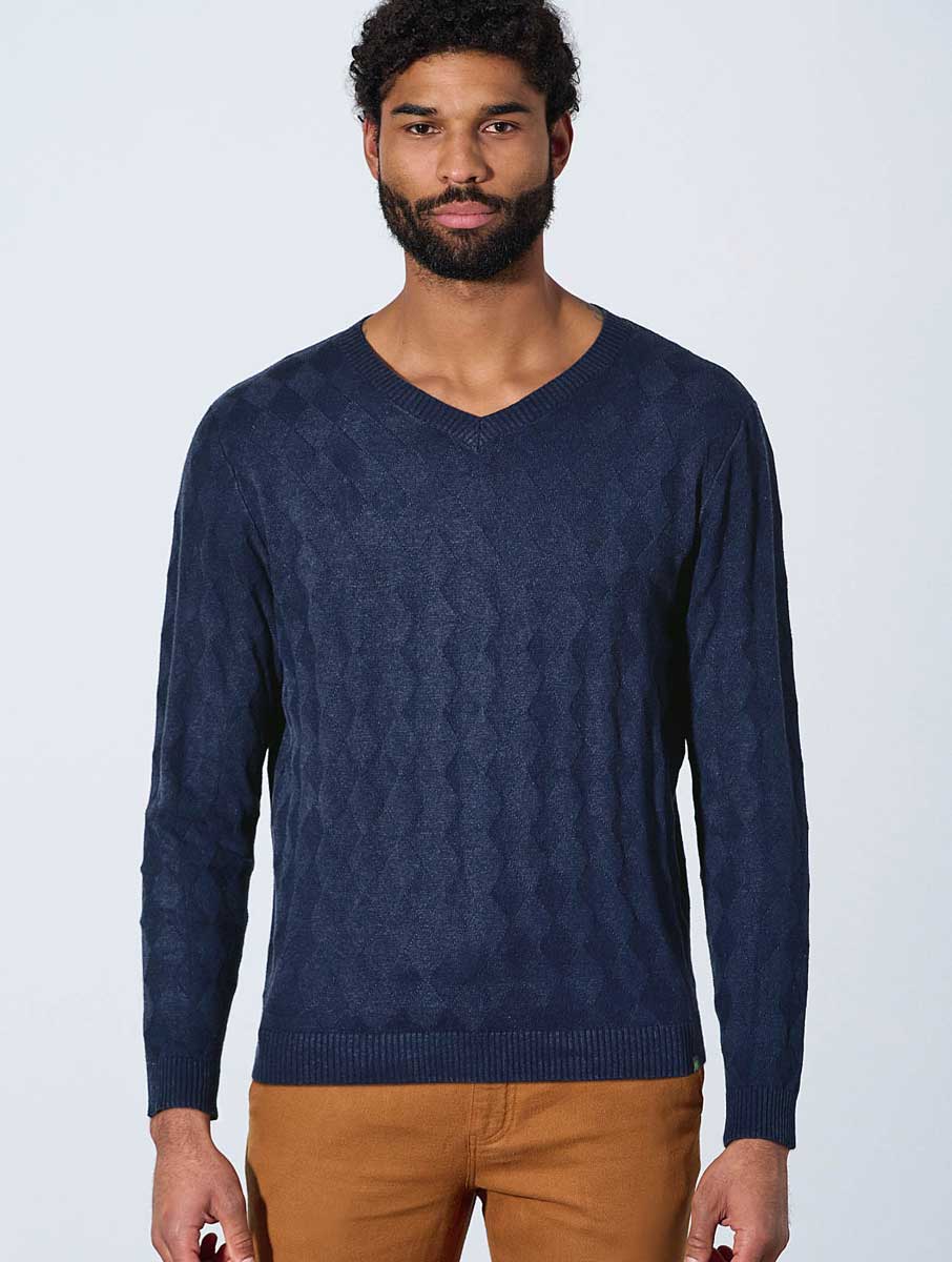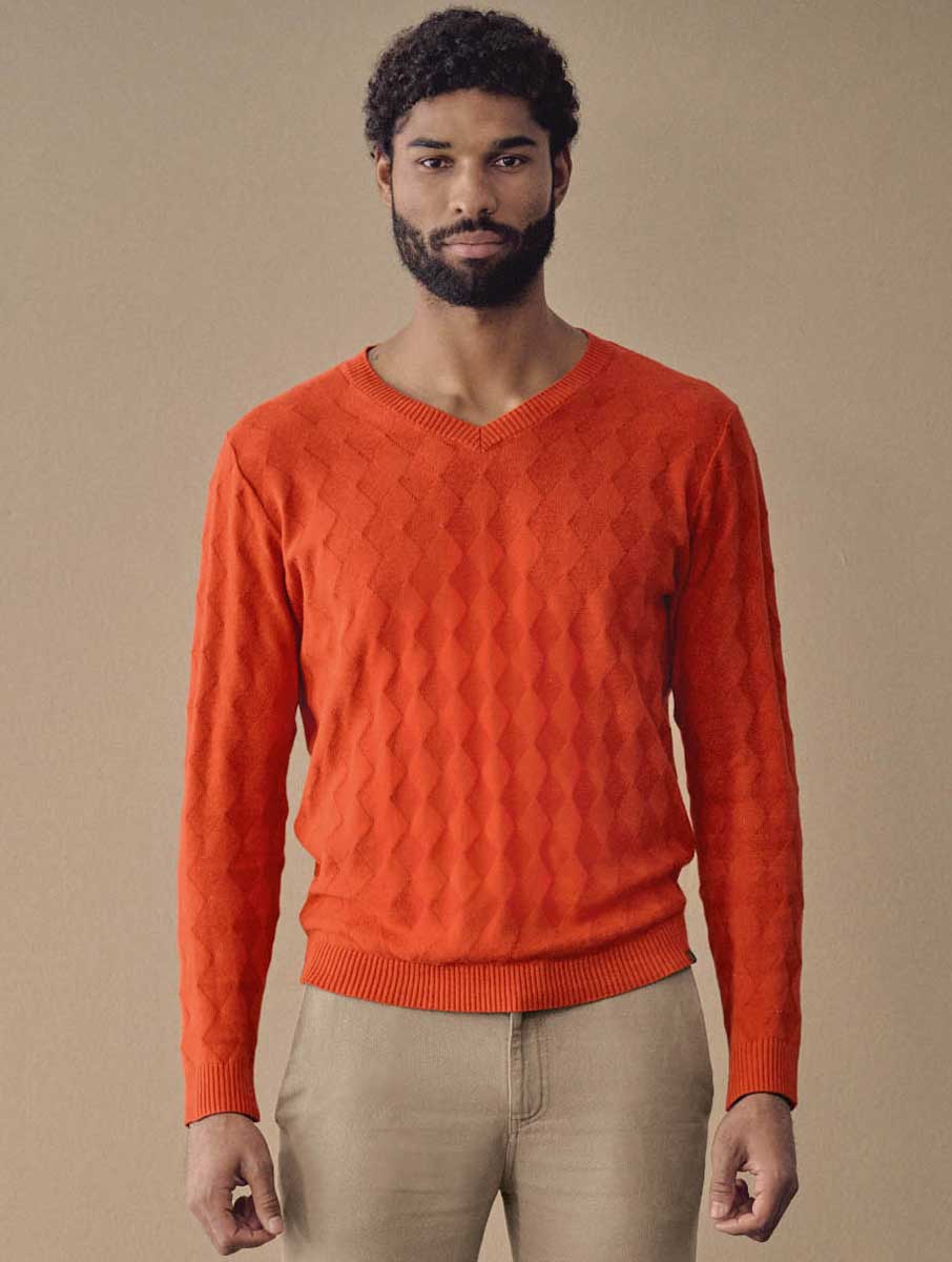 El jersey cuello pico de rombos es una prenda sostenible de Comercio Justo, certificada por FairWear Foundation.