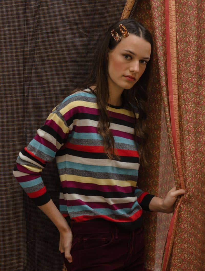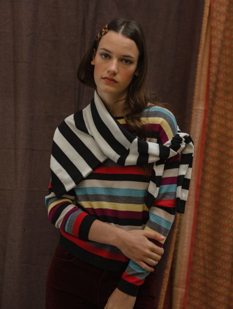 Si quieres darle un toque de color y alegría a tu armario, el jersey de lana merino de rayas multicolor es perfecto para ti.