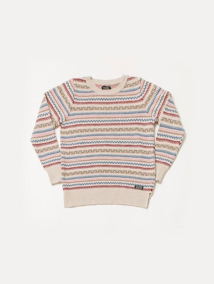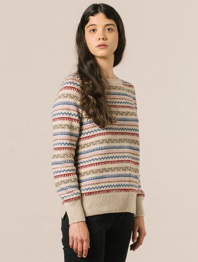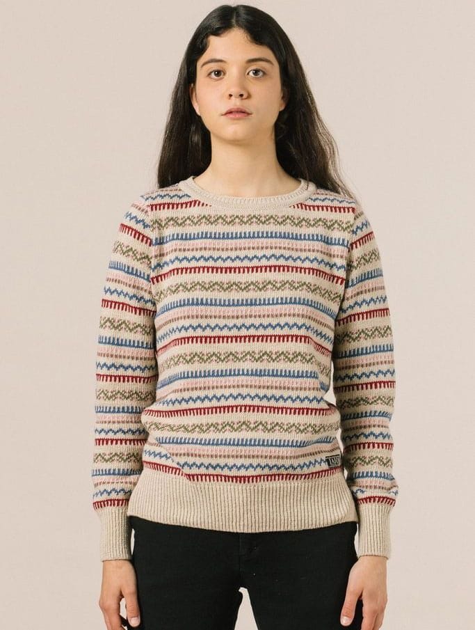 Este jersey sostenible para mujer es de color crema y presenta un bonito diseño de grecas de colores variados (rojo, verde, azul…).