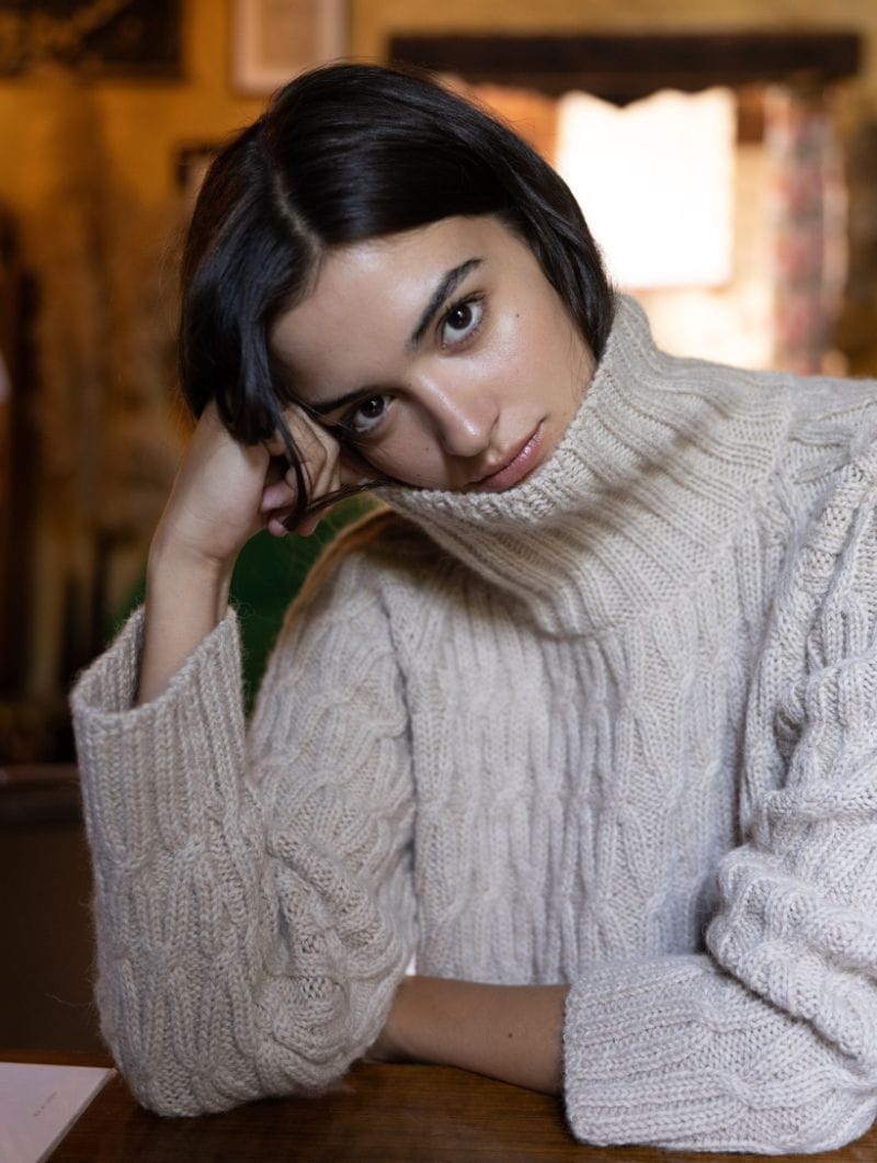 El jersey grueso de cuello alto beige está hecho con mucho mimo y cuidado en Galicia, en un pequeño taller familiar.