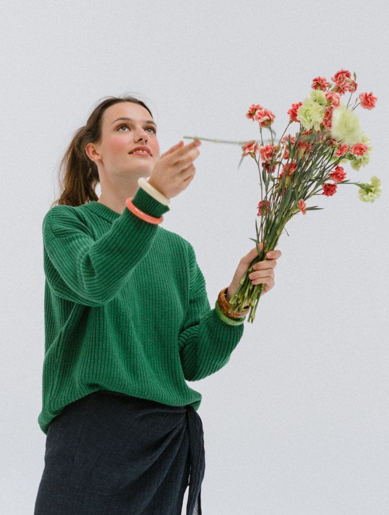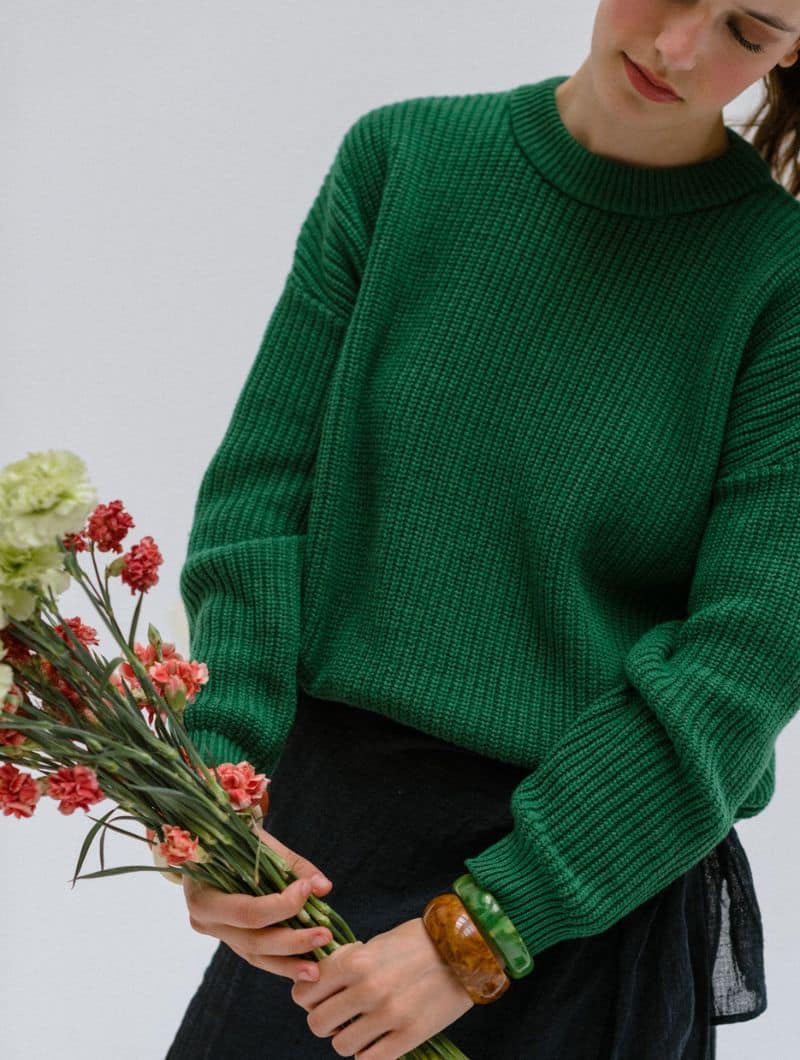 El jersey grueso verde no solo es bonito, sino también sostenible. Está tejido con una mezcla de fibras naturales y recicladas, que le dan suavidad y durabilidad. Además, tiene el certificado OEKO-TEX® STANDARD 100, que asegura que no contiene sustancias nocivas para la salud ni para el medio ambiente.