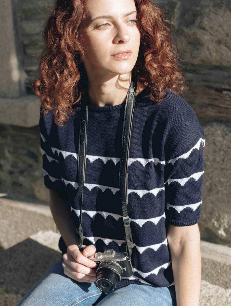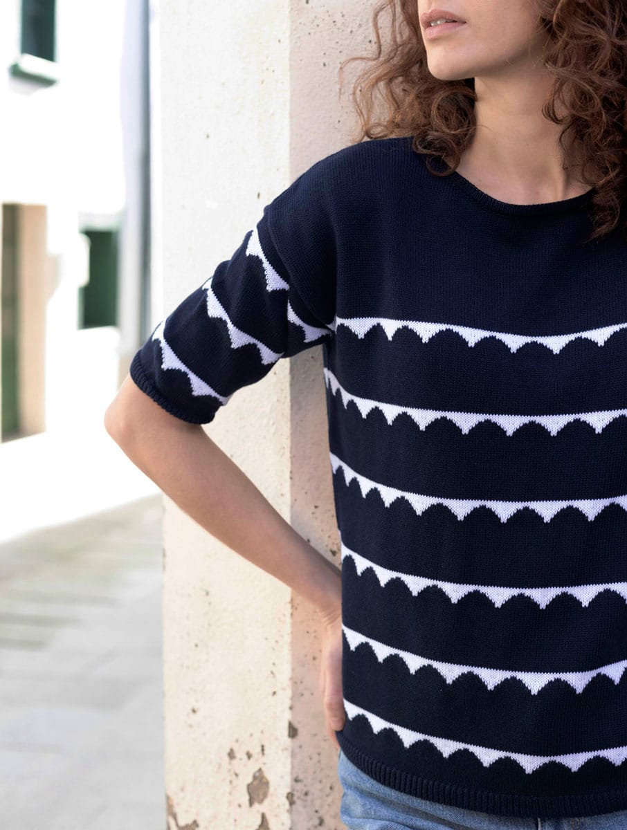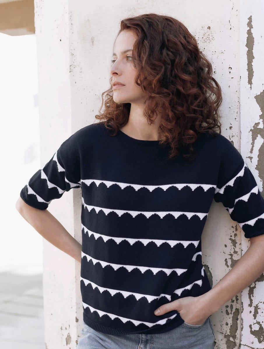Este jersey de manga corta es de un color azul marino muy especial y cuenta con unas franjas horizontales de bonito diseño en color blanco.