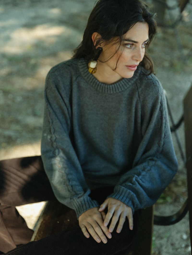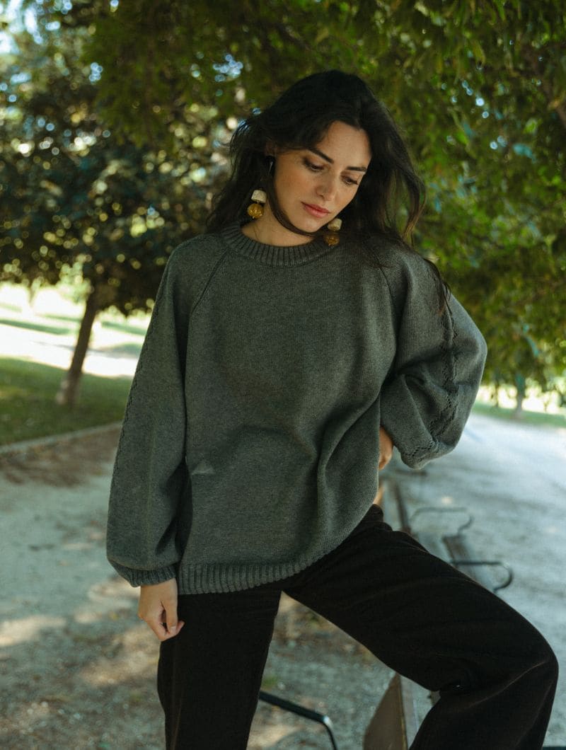 Jersey manga globo con calados de algodón orgánico y cashmere color gris piedra.