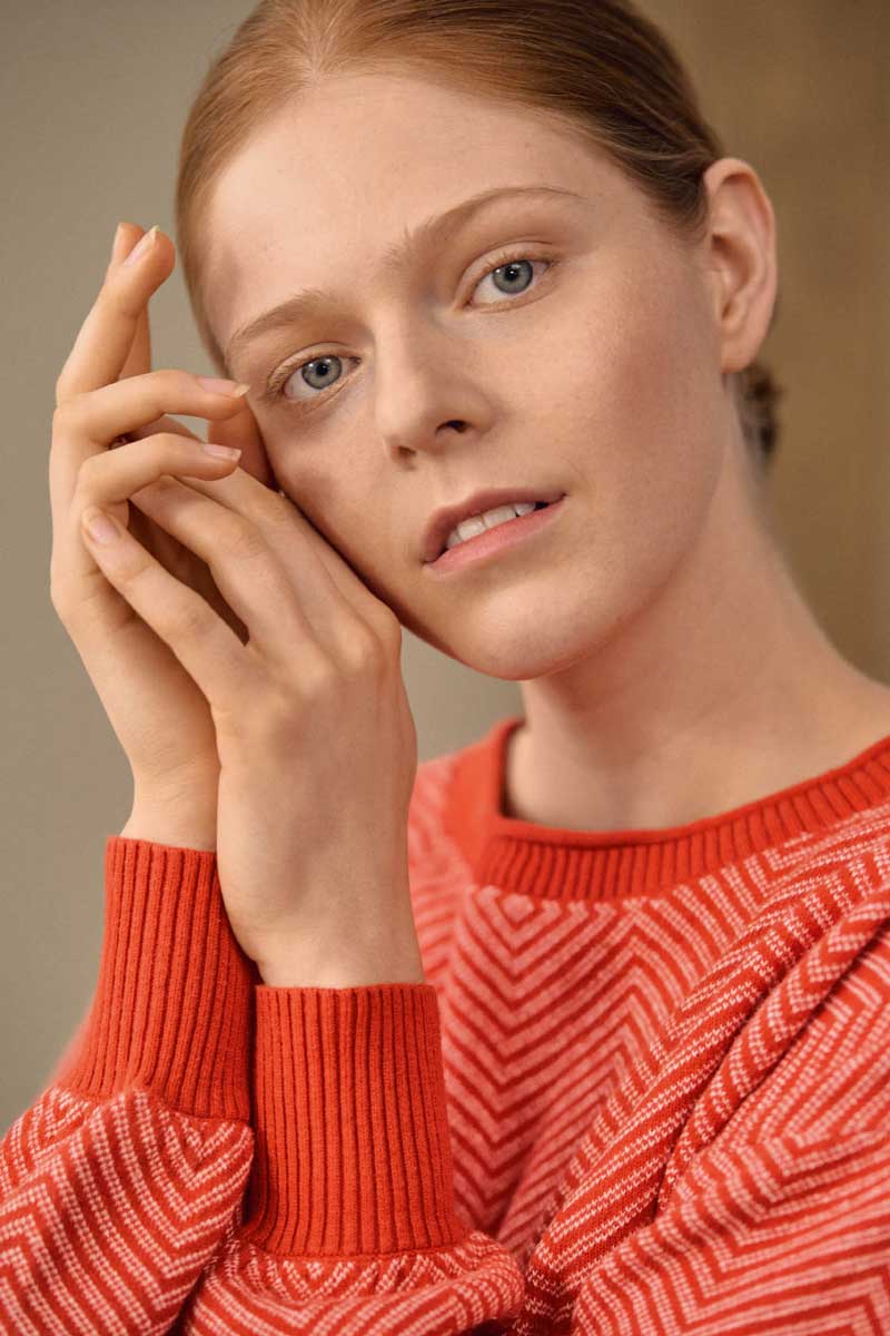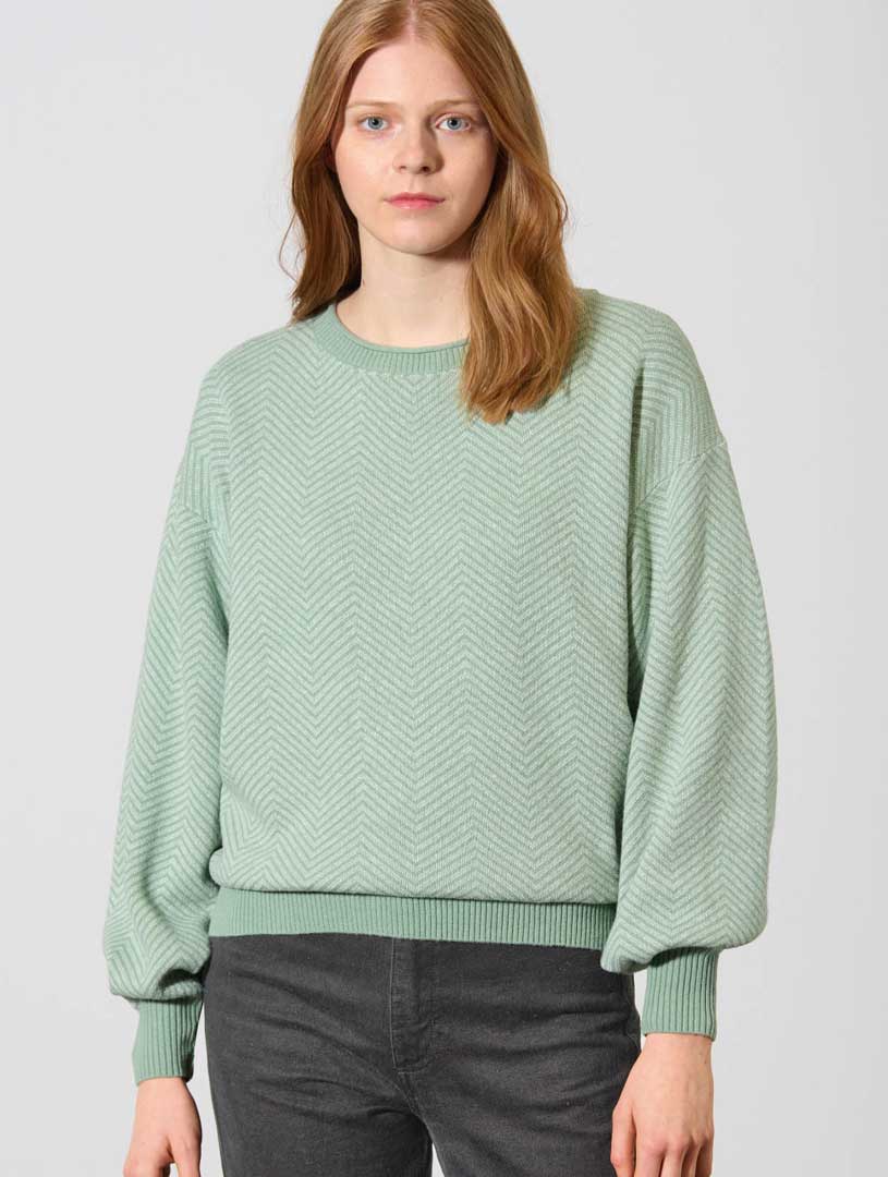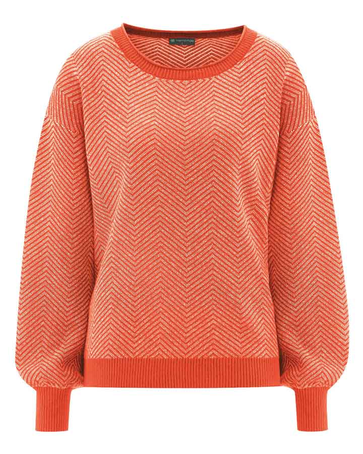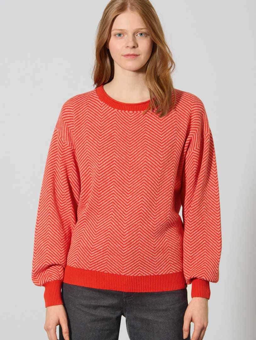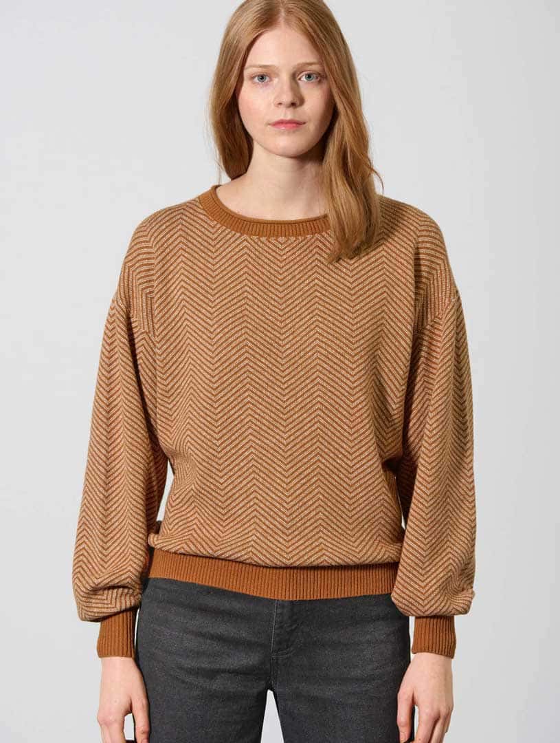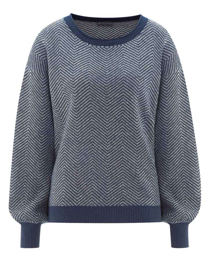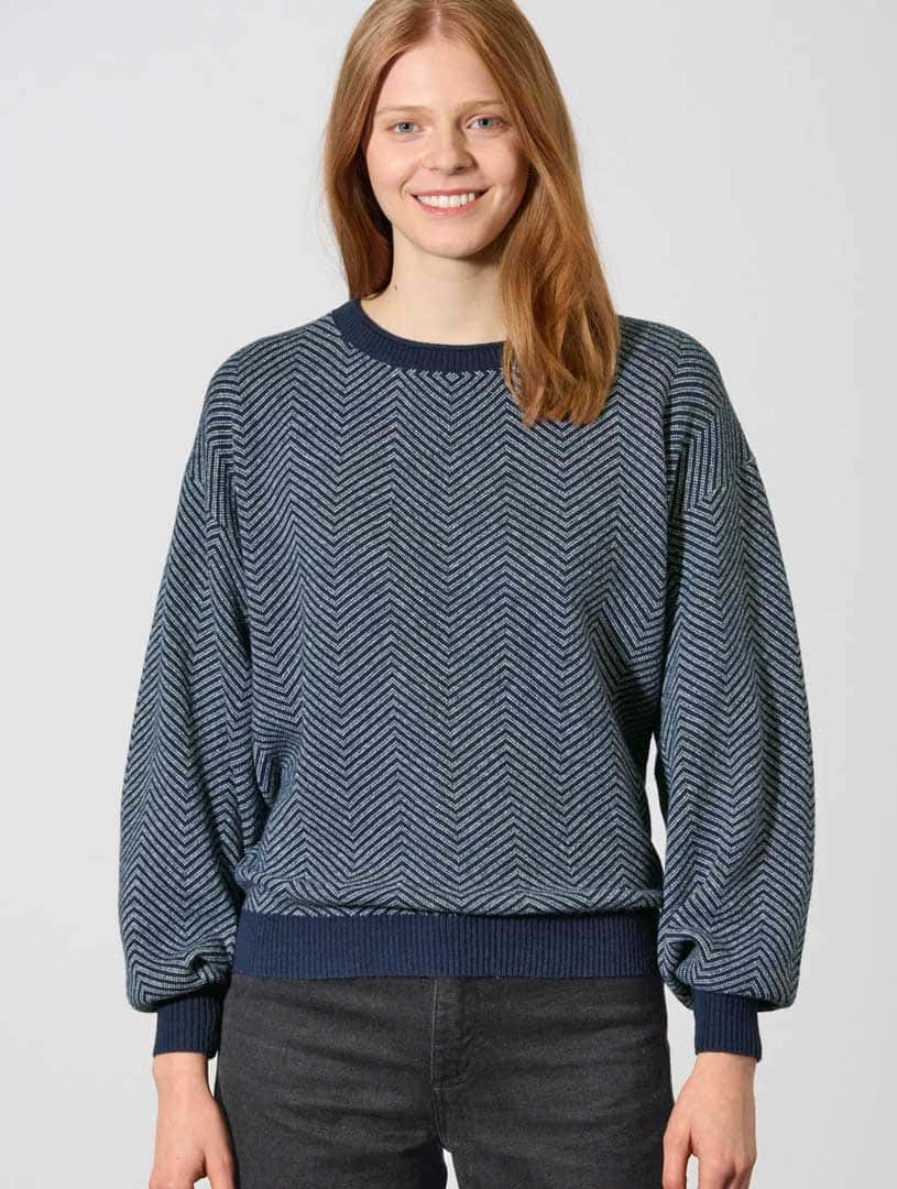 Este original jersey de punto para mujer presenta mangas tipo globo, hombro recortado y puños anchos de canalé en contraste. Su precioso diseño de zig-zag no pasará desapercibido.