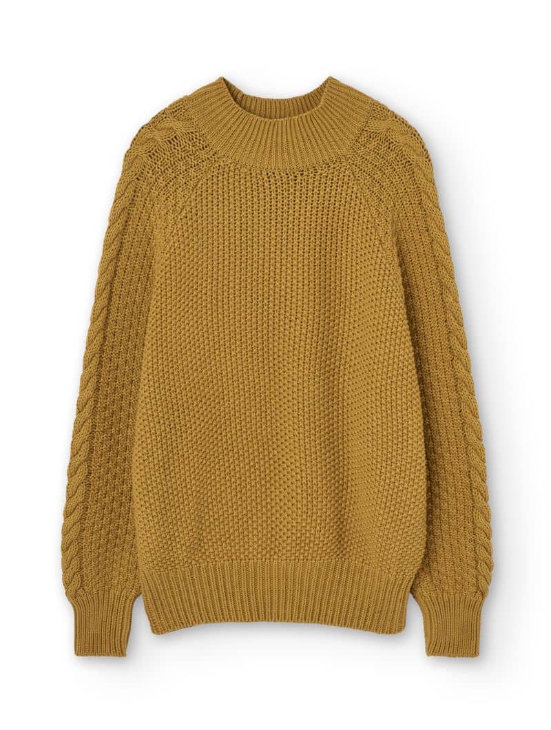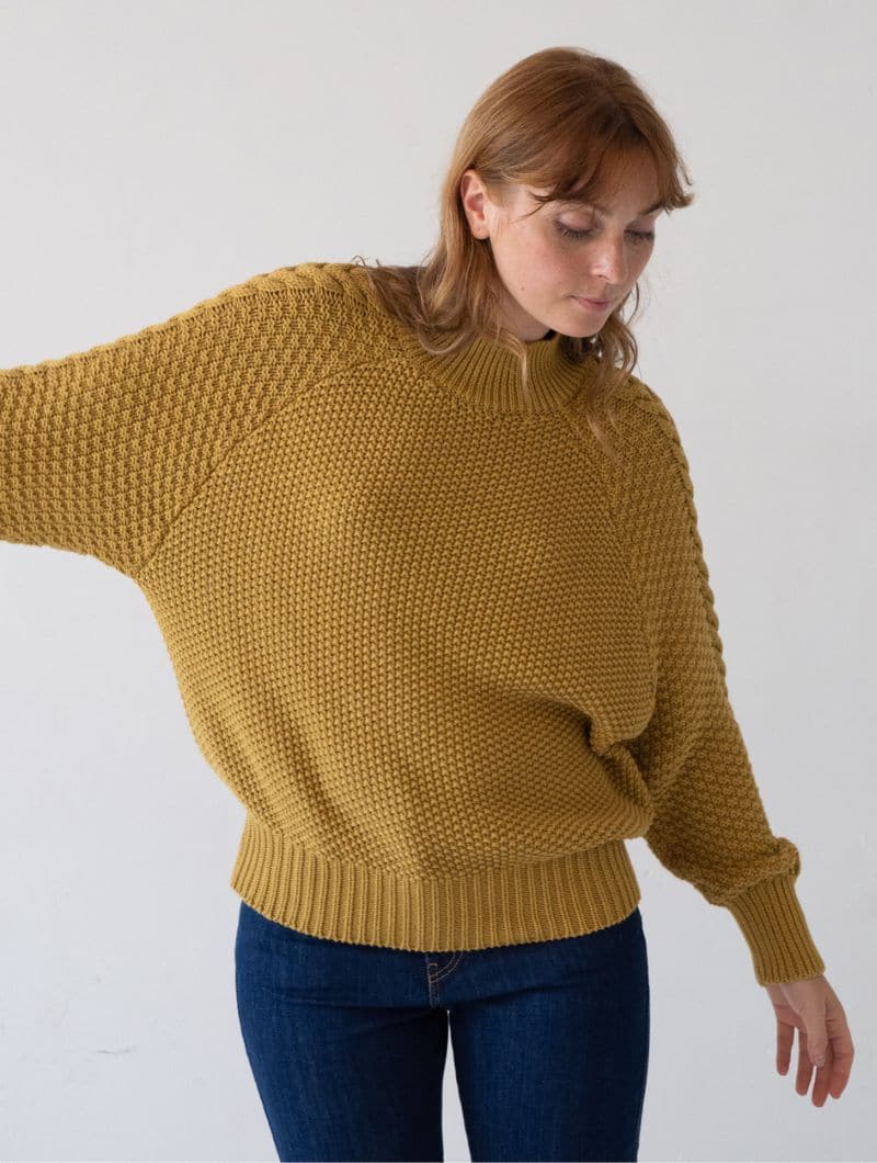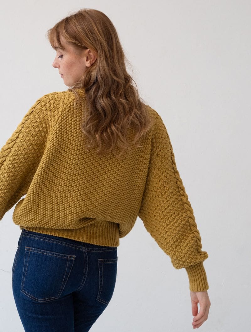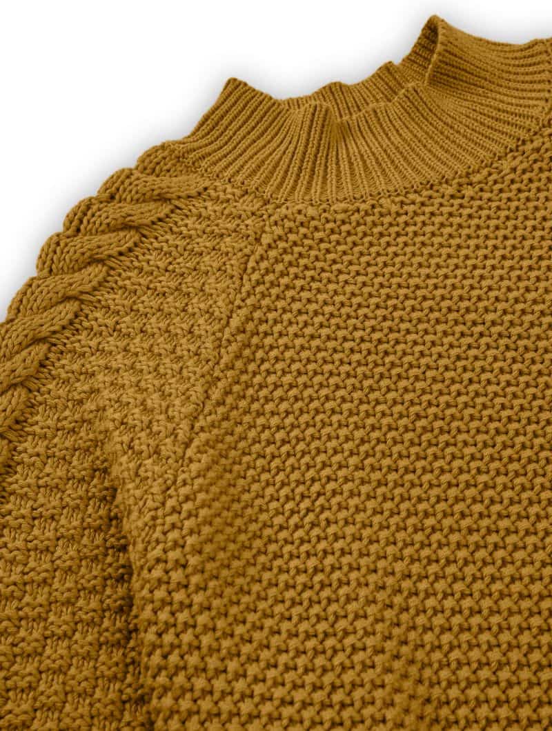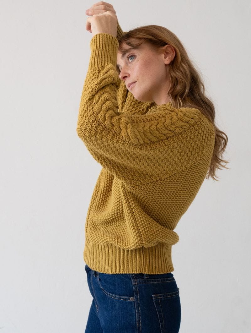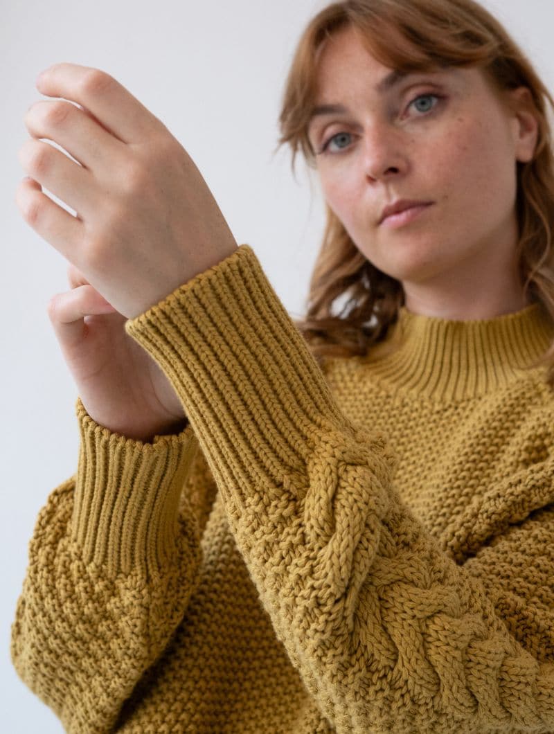 Jersey mostaza de algodón orgánico para mujer, con un diseño bohemio y mangas trenzadas.