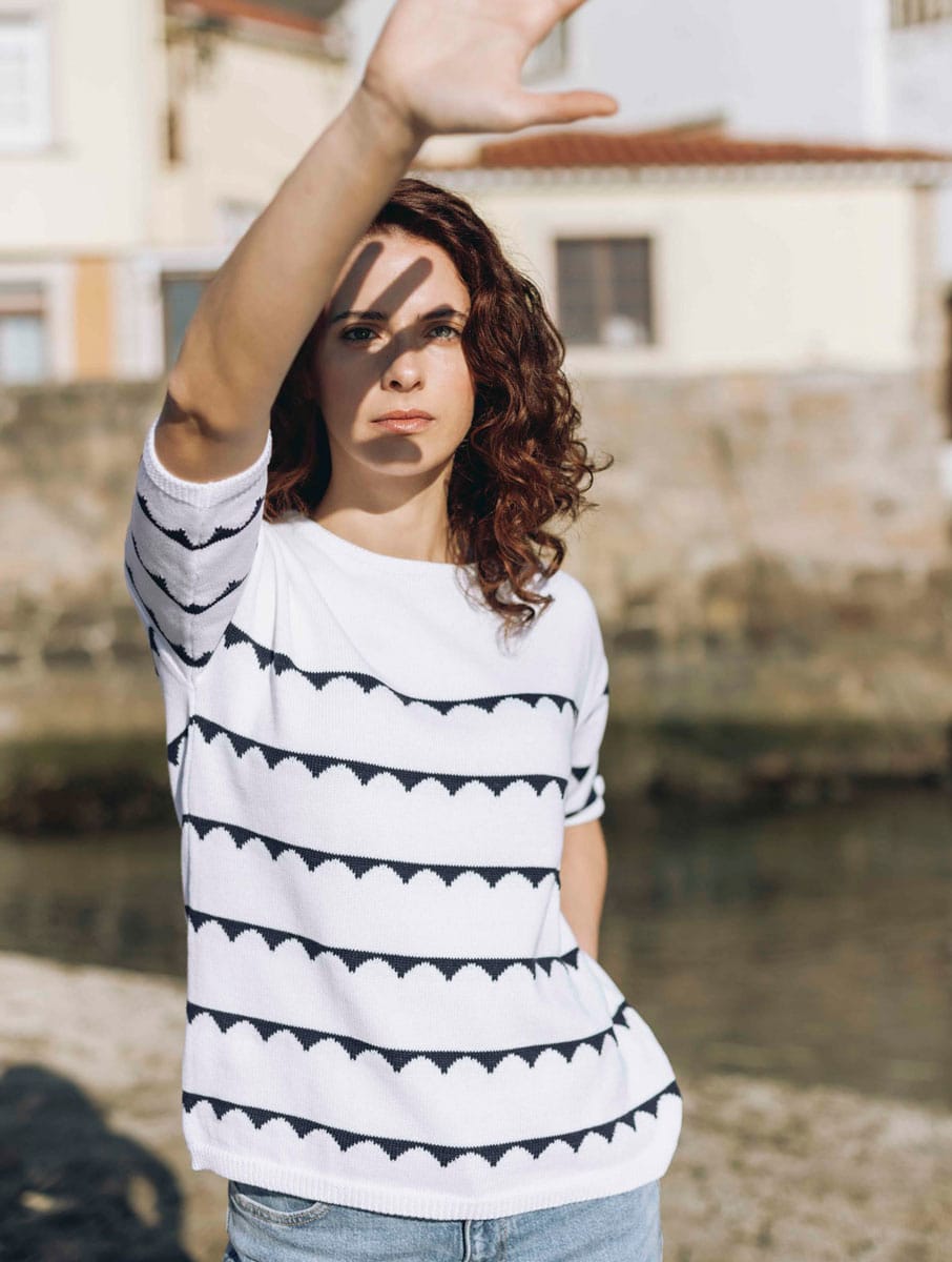 Es de color blanco y tiene unas líneas horizontales en azul marino que hacen unas figuras de puentes.