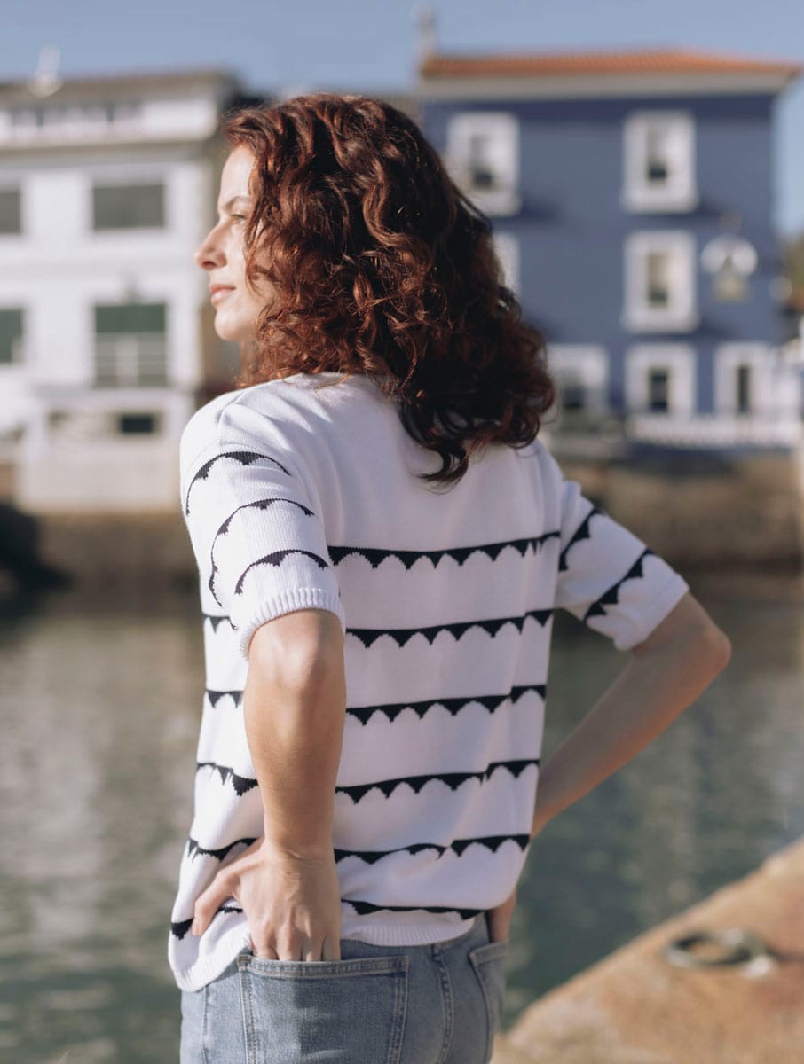 Este jersey de punto de manga corta tiene un corte holgado, por lo que sienta genial a cualquier figura. Es súper cómodo y muy suave, ideal para llevar en primavera o verano con unos vaqueros. En las mangas y en el dobladillo cuenta con ribete acanalado.