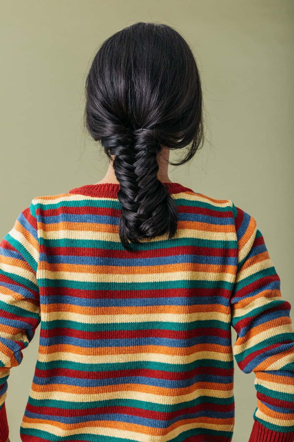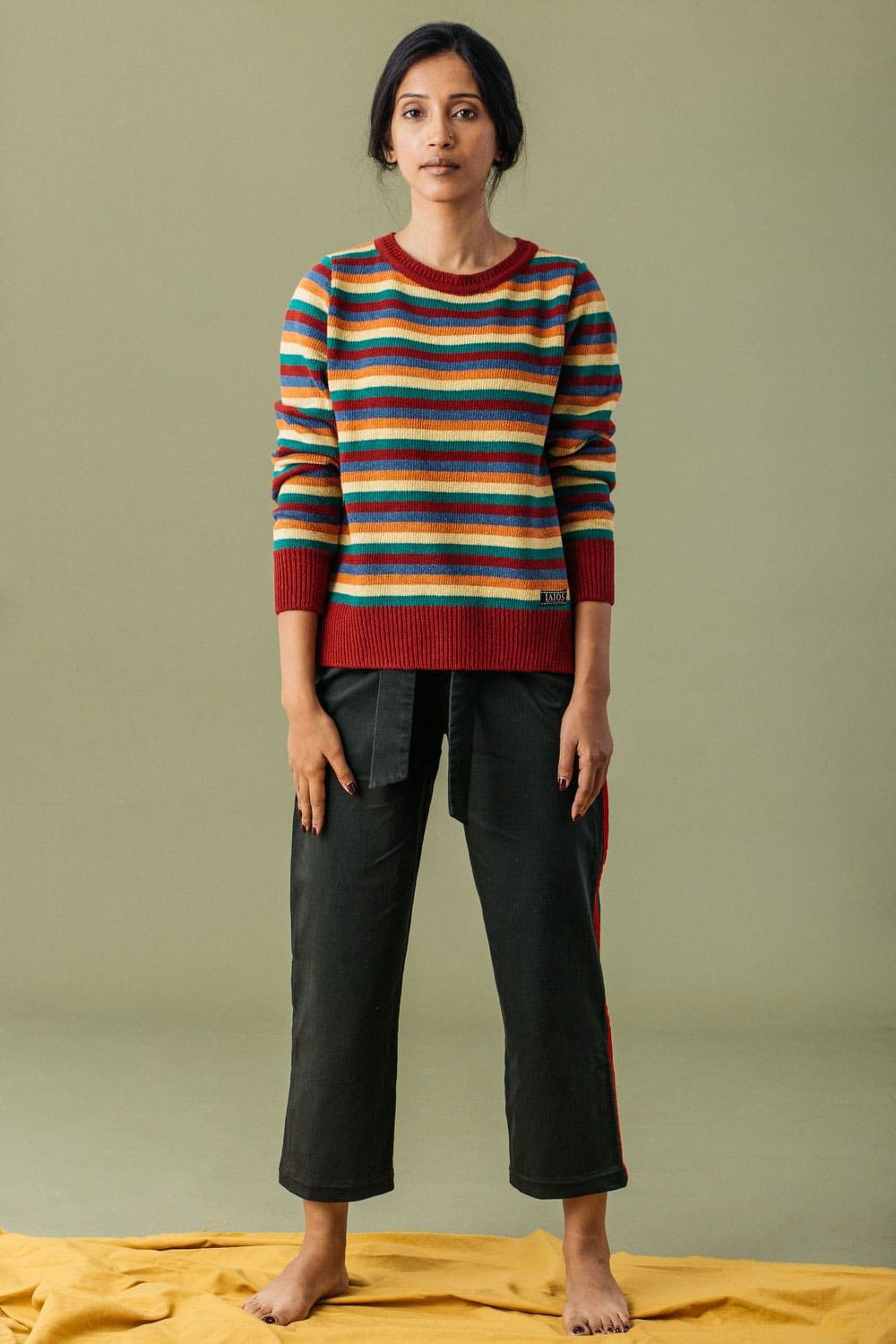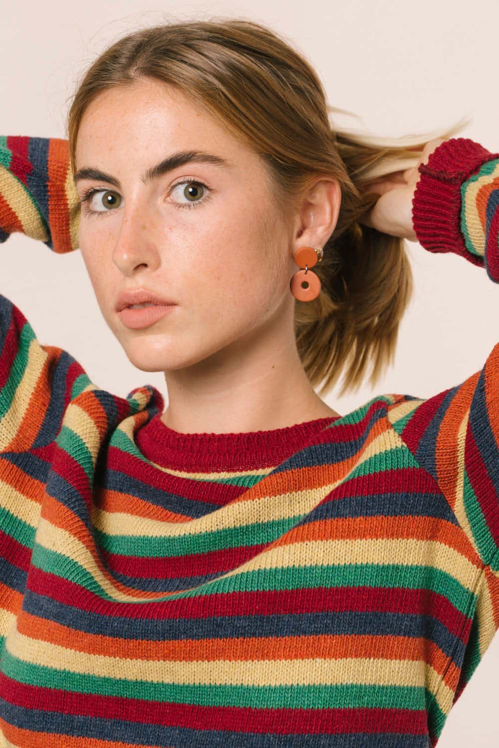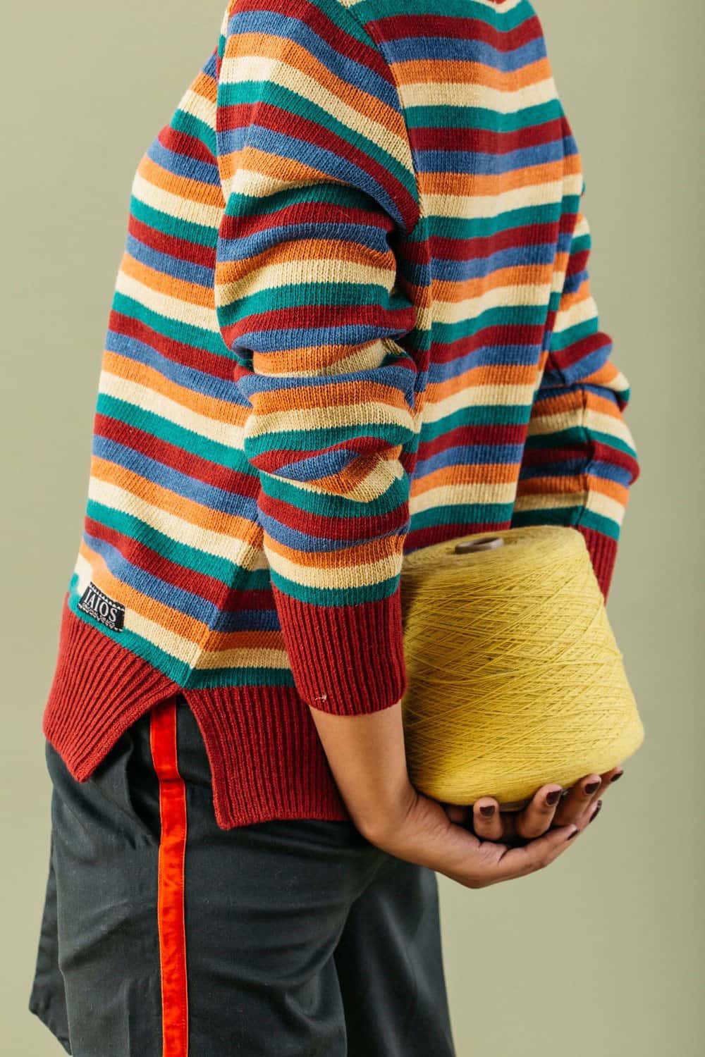 El jersey de rayas multicolor es una prenda sostenible fabricada en talleres locales y de proximidad en el área de Barcelona.