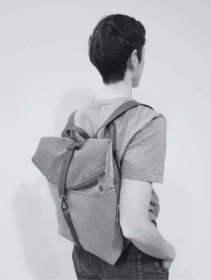 La mochila reciclada con tela de triángulos de colores está fabricada de forma artesanal en un pequeño taller de Reus (Tarragona).