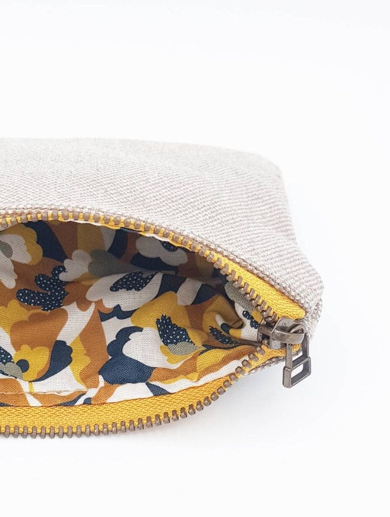 Color: Gris plata. Interior de flores ocre. Cremallera en oro viejo con borde ocre.
