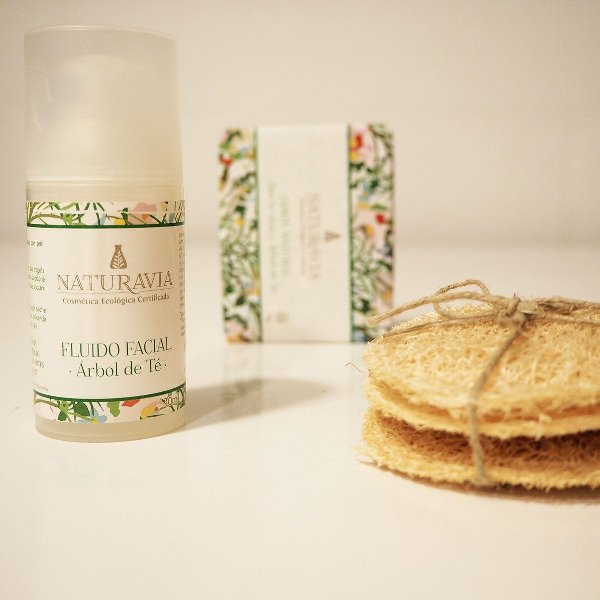 Compuesto por fluido facial de árbol de té, jabón dos arcillas y tres discos exfoliantes de luffa.