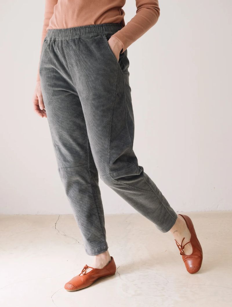 Pantalón de pana gruesa con cintura elástica, bolsillos laterales y costuras delanteras que dan estructura sin perder comodidad. Su corte relajado y la cintura elástica aportan comodidad y libertad de movimiento, manteniendo un estilo cuidado y versátil.
