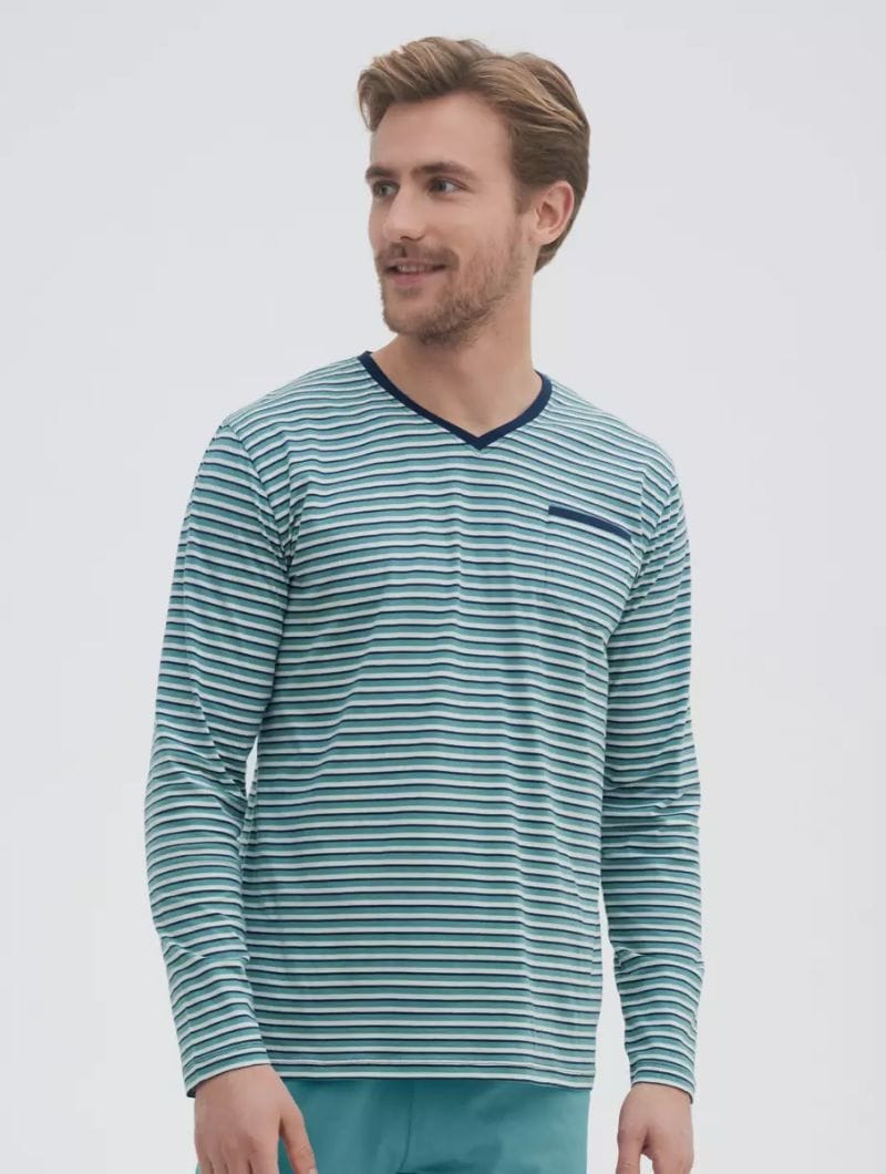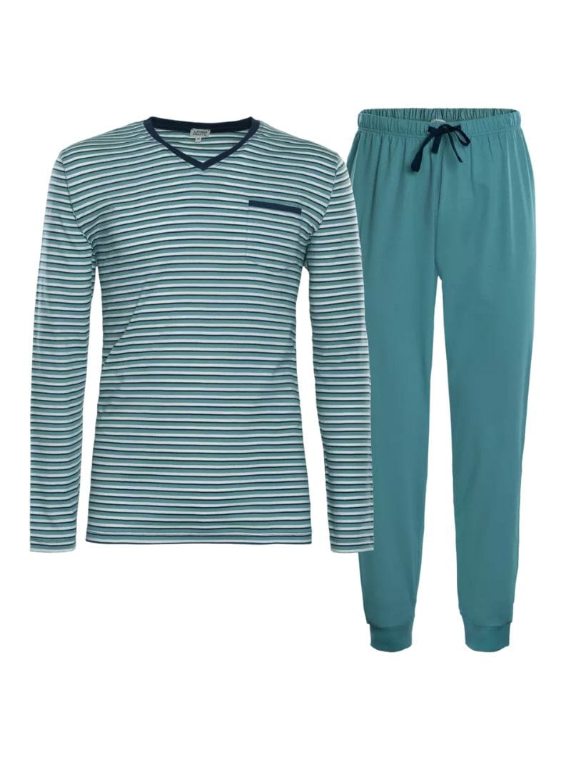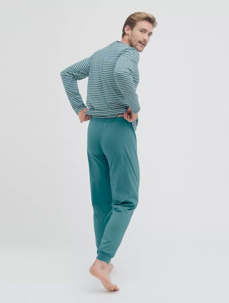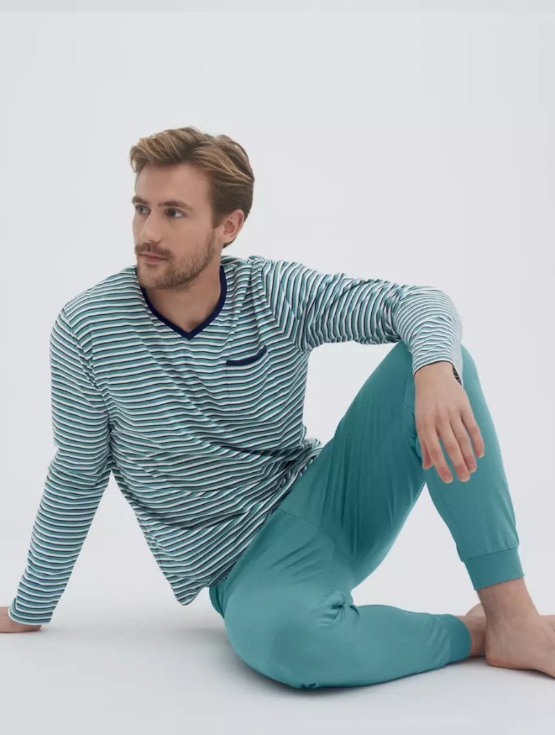 Este pijama ligero para hombre te ofrece un descanso fresco y cómodo en las noches más calurosas del verano. Su tejido de algodón 100% orgánico de punto fino es suave y no irrita la piel. Cuenta con un bolsillo en el pecho y un cuello en V moderno. La cintura con cordón y los puños en el tobillo se adaptan a tu medida.