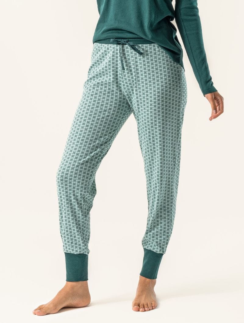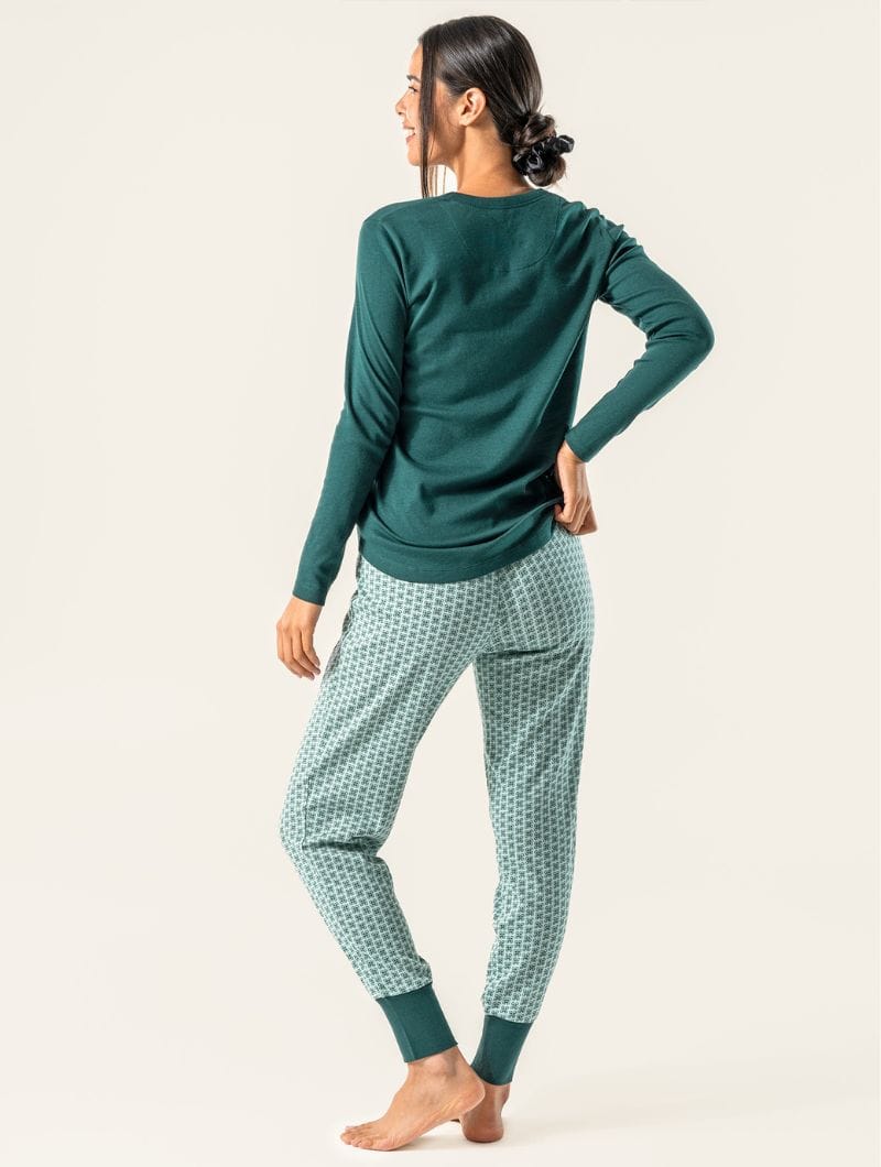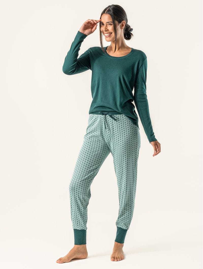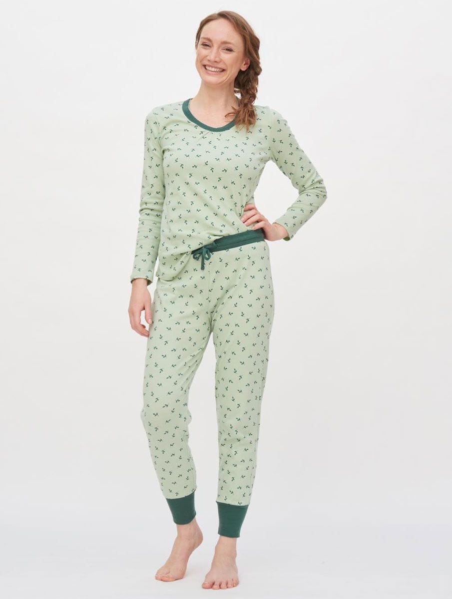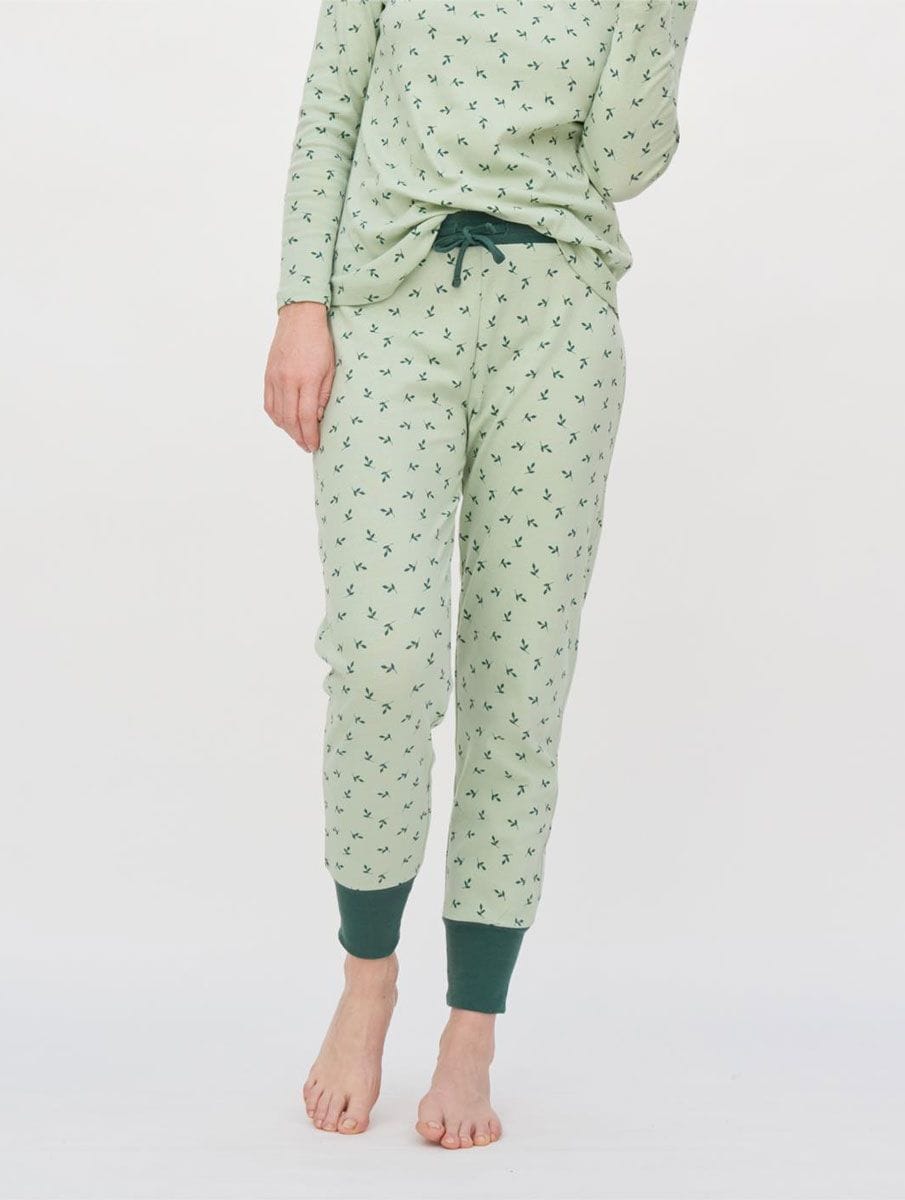 Pijama mujer algodón orgánico verde con estampado de hojas.